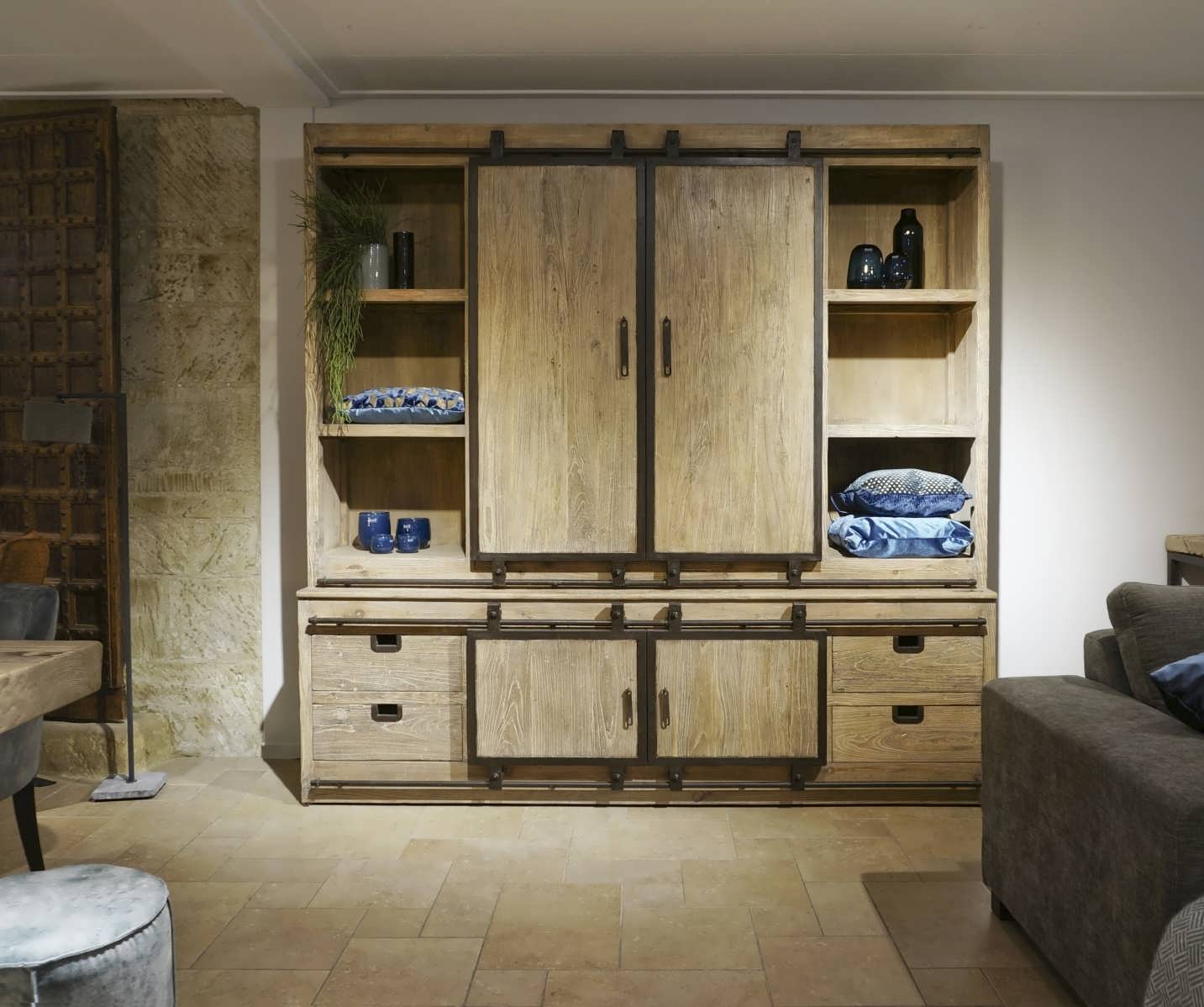 De Narbonne kast in een zeer speciale kast en uniek in zijn soort. De binnenkant van de kast is uitgevoerd met houten 8 lades in het midden van de kast en 5 opbergvakken aan de binnenkant van elke deur. Daarnaast heeft deze stoere kast ook 2 open vakken waar je nog wat decoratie in kwijt kunt. De kast is 220cm hoog, 152cm breed en 50cm diep.