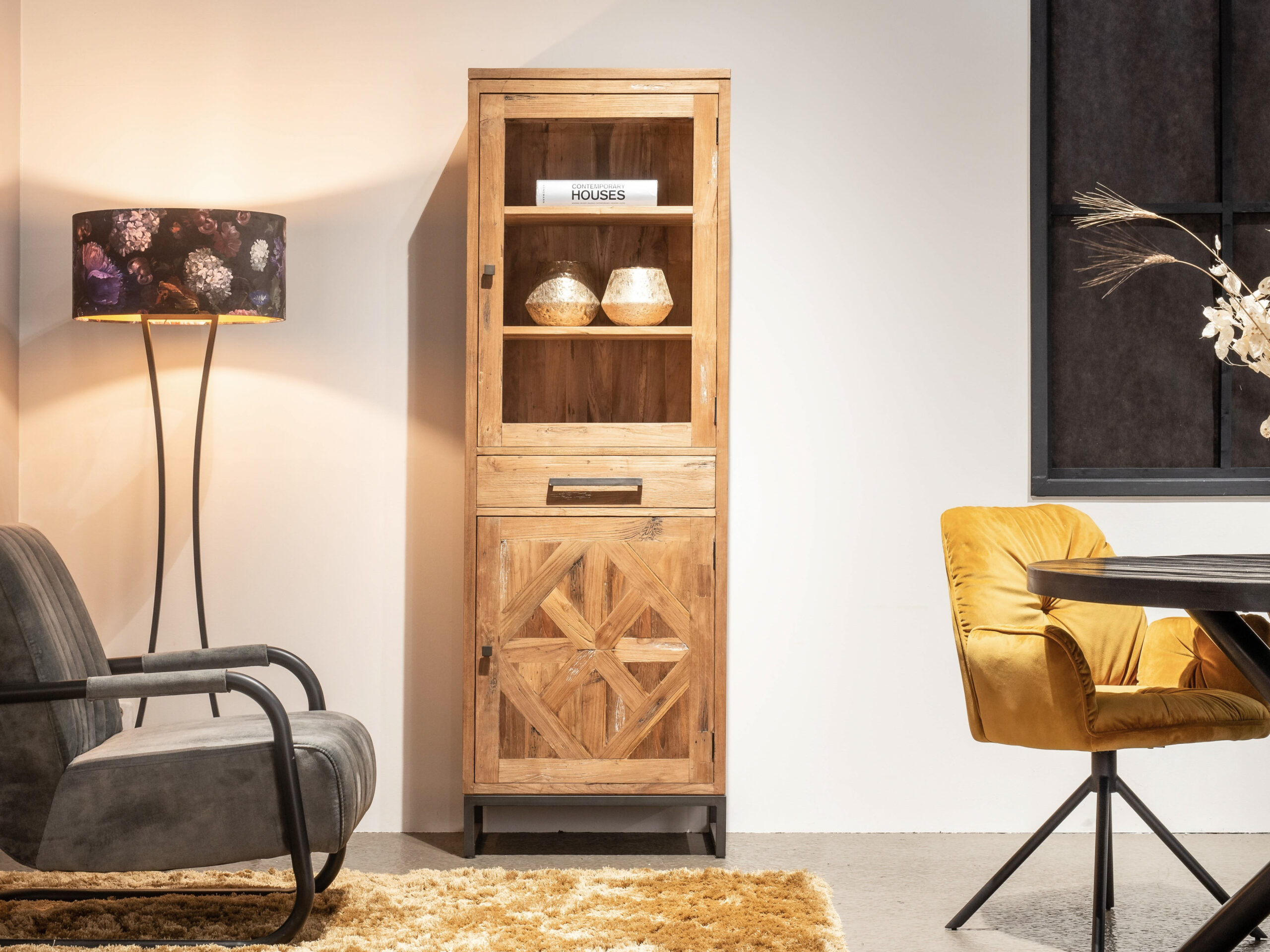Stoere vitrinekast Cabimas van oud recycled teak, ook wel driftwood genoemd. De kast is afgewerkt met een lichte white wash en black wash. De houten bladen en fronden zijn met de hand in een prachtige design vorm ingelegd. Door de combinatie hout met staal krijgt dit meubel een industriële uitstraling. De kast beschikt over 1 glazen deur, 1 gesloten deur en 1 lade. Dit model combineert mooi met onze andere producten van oud teak hout, zoals bijvoorbeeld Perdano, Corrado, Parrano of Toulon.