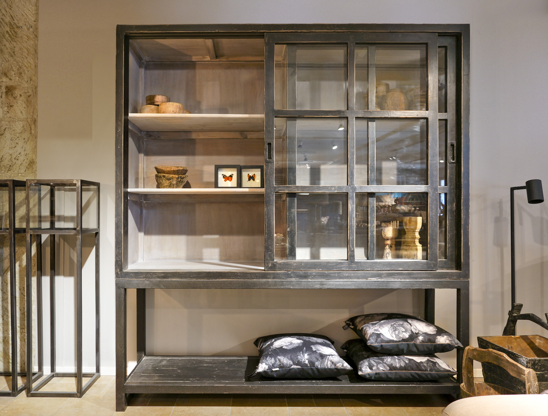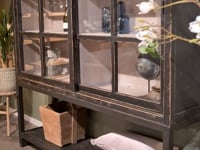 Stoer zwarte vitrinekast gemaakt van oud hout. Gemaakt van mooi authentiek hout met karakteristieke details, elk meubel is uniek en heeft zijn eigen karakter. Dit model is doorgaans direct uit voorraad leverbaar.