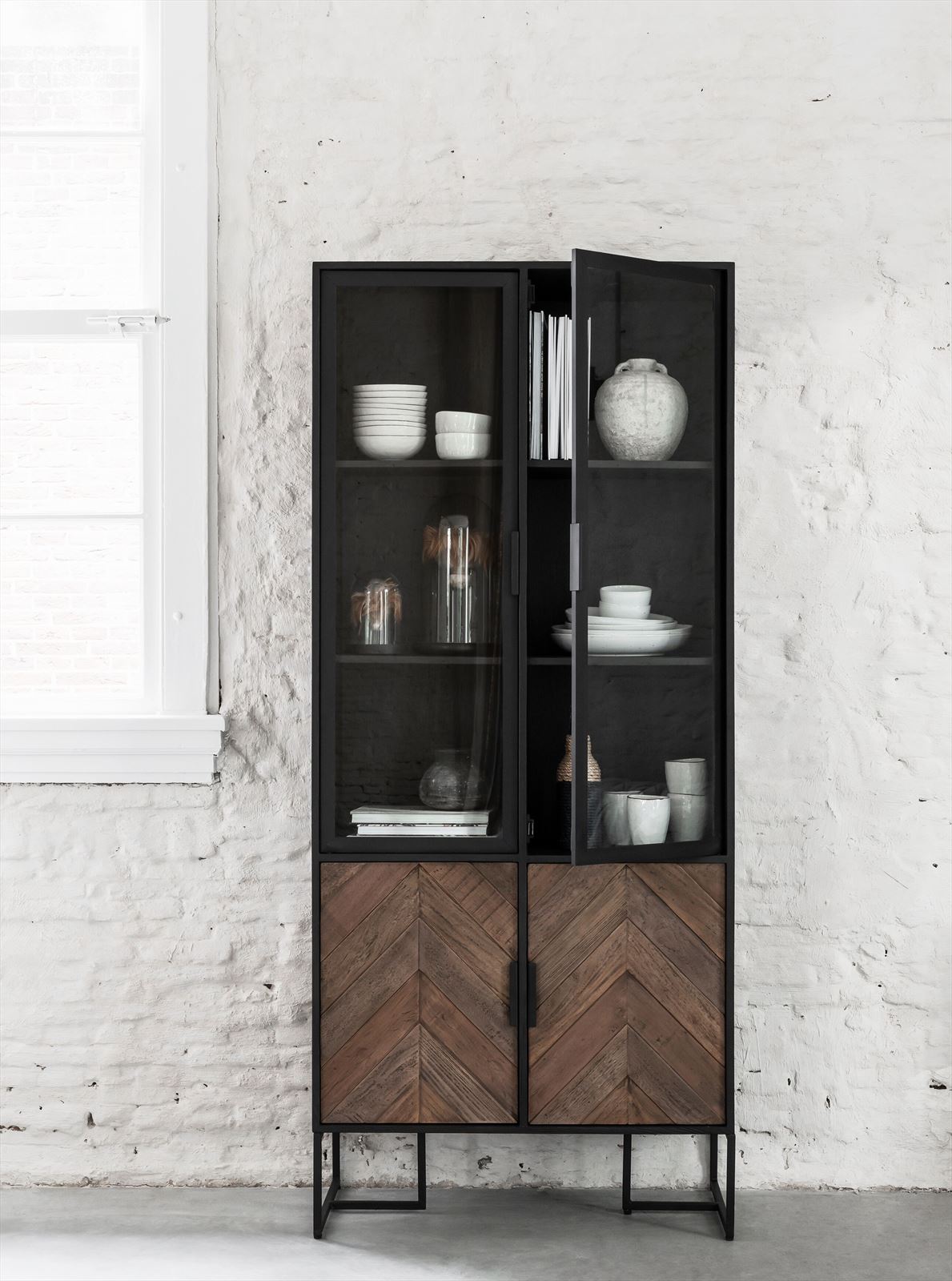 Stoere Vitrinekast Padula van oud teak met 4 deuren en zwart stalen onderstel, leverbaar doorgaans uit voorraad. De vitrinekast is leverbaar in de maat 80x40x185cm. De Padula serie is uniek doordat de teak planken in visgraat motief zijn geplaast om zo het meubel een karakteristiek uiterlijk te geven. De combinatie van het zwart gebeitste hout en het oude gerecyclede teak zorgt voor een erg warme en robuuste uitstraling.