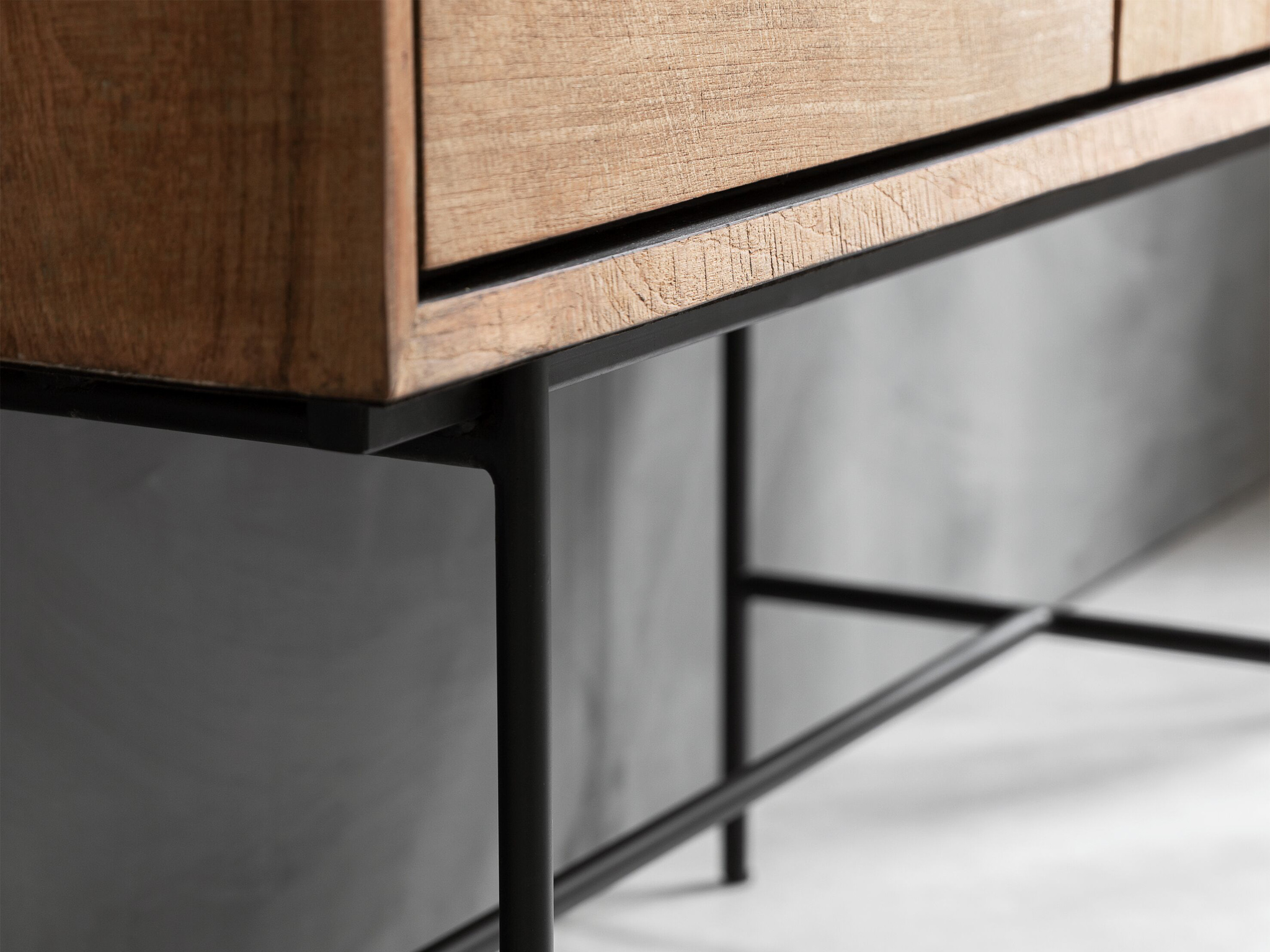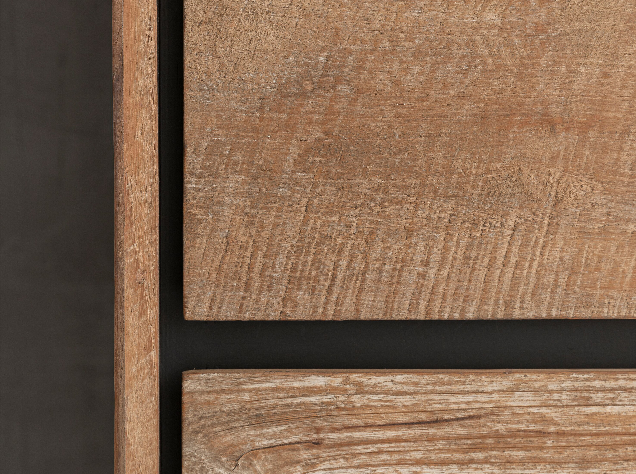 Stoere opbergkast Monastero van oud teak. Leverbaar in 2 verschillende maten, te weten 100x40x150cm met 3 deuren en 2 laden óf 100x40x210cm met 3 deuren en 3 laden. De Monastero serie combineert erg goed met ander teak meubels uit dezelfde serie of een andere serie zoals bijvoorbeeld Cavallo of Divino. De combinatie van het stoere teakhout en het stalen frame zorgen voor een erg warme en robuuste uitstraling.