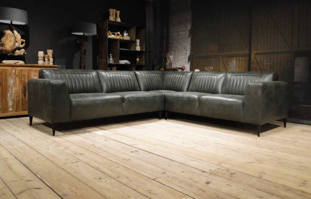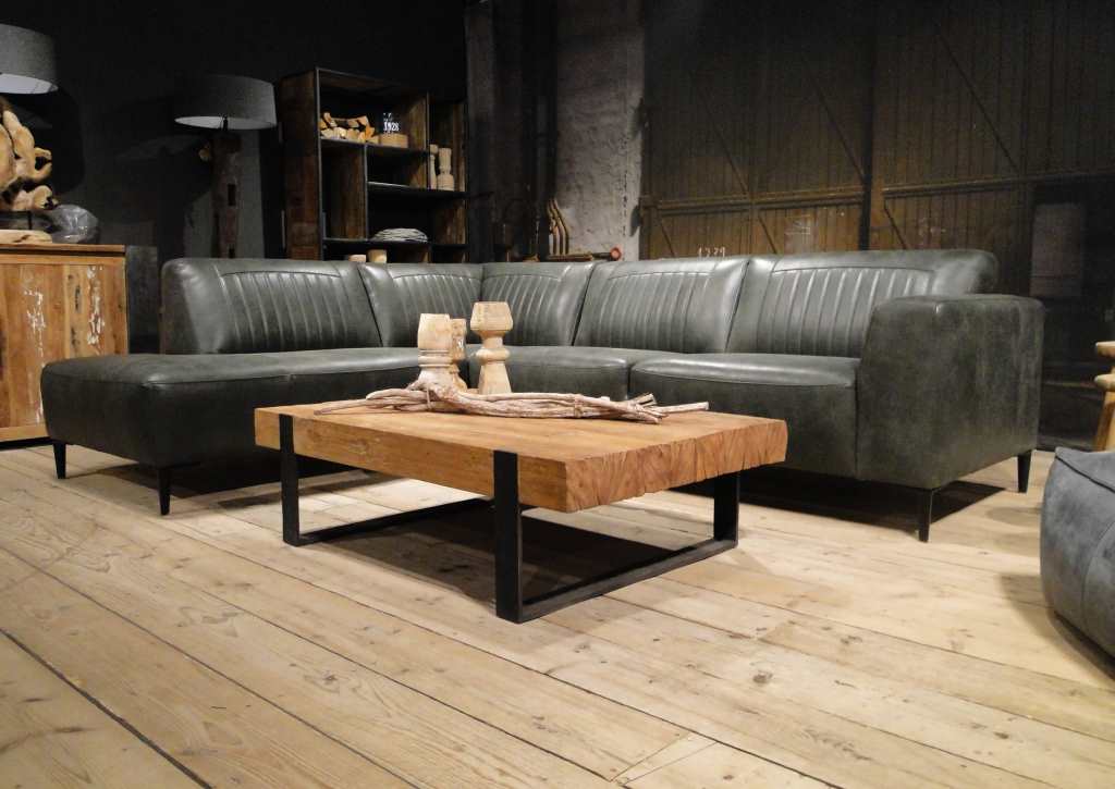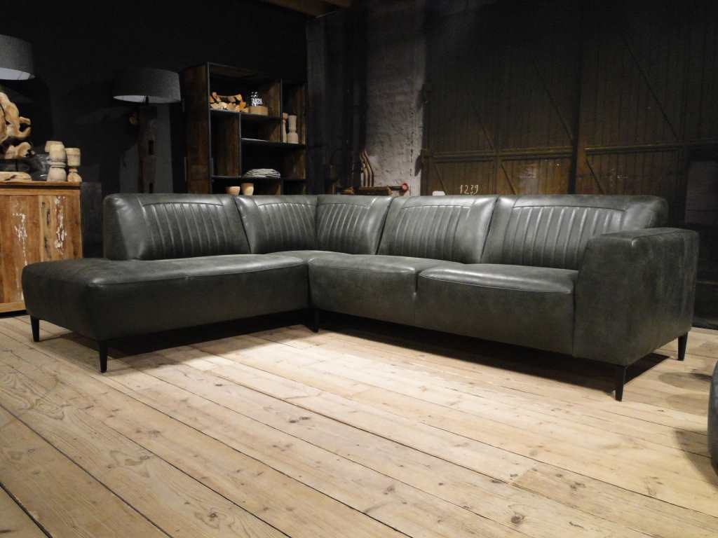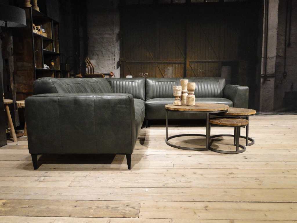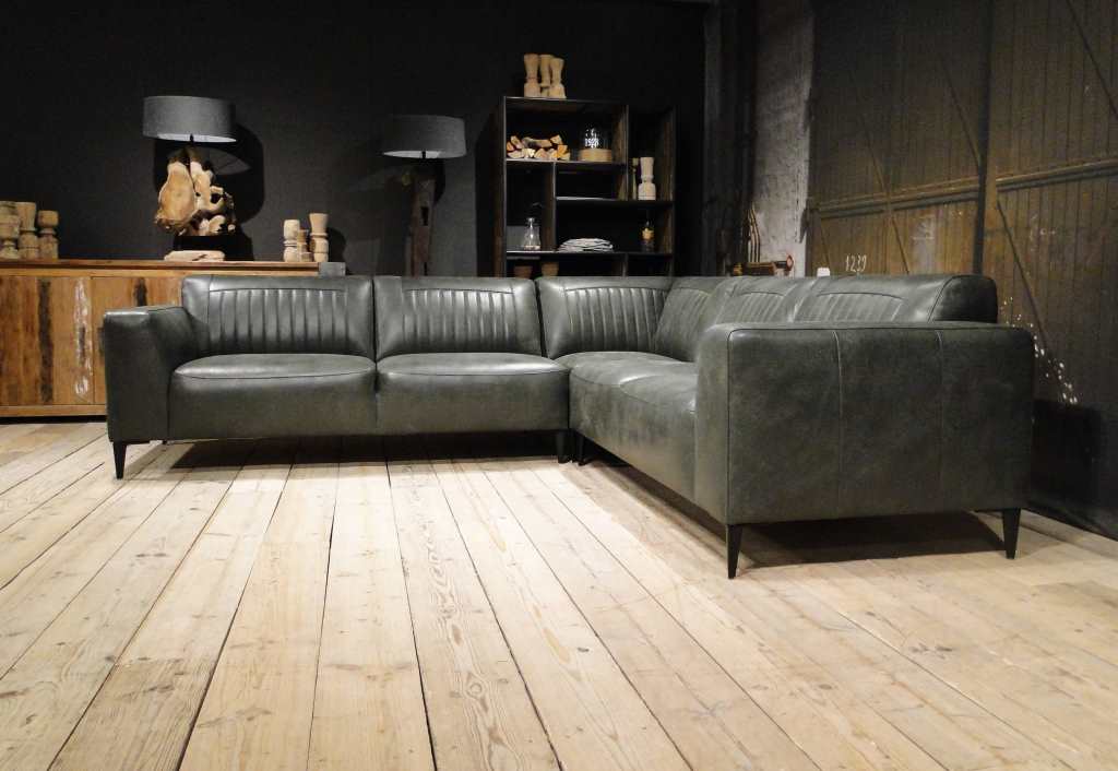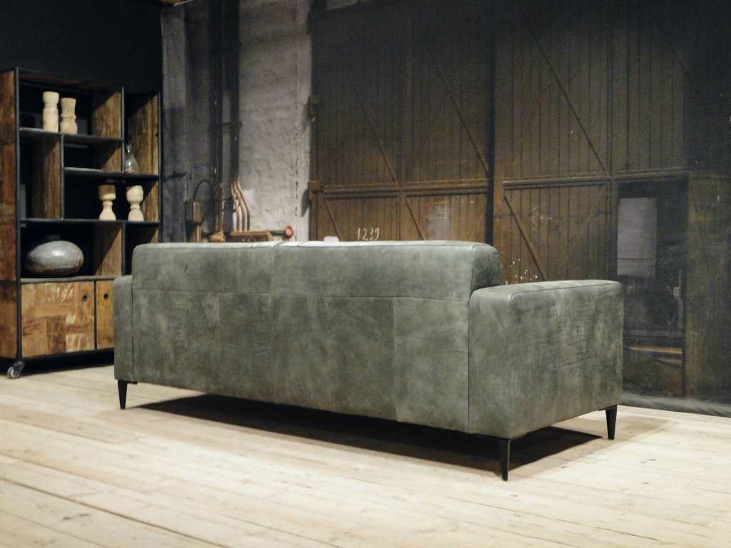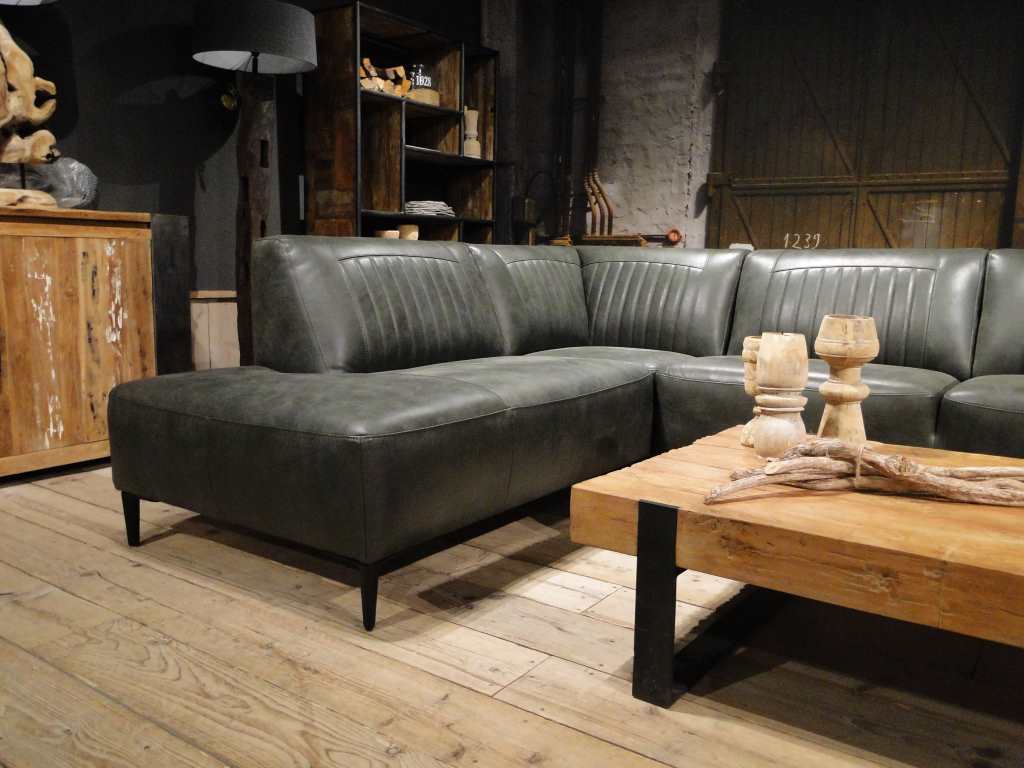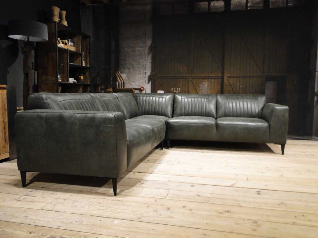 Deze bank staat in onze showroom in Sliedrecht in het geschuurde leer dark green als 3 zits, daarnaast ook in het leer met een open eiland in walnut. In Gramsbergen staat deze als 3 zits in het bull eco leder moss