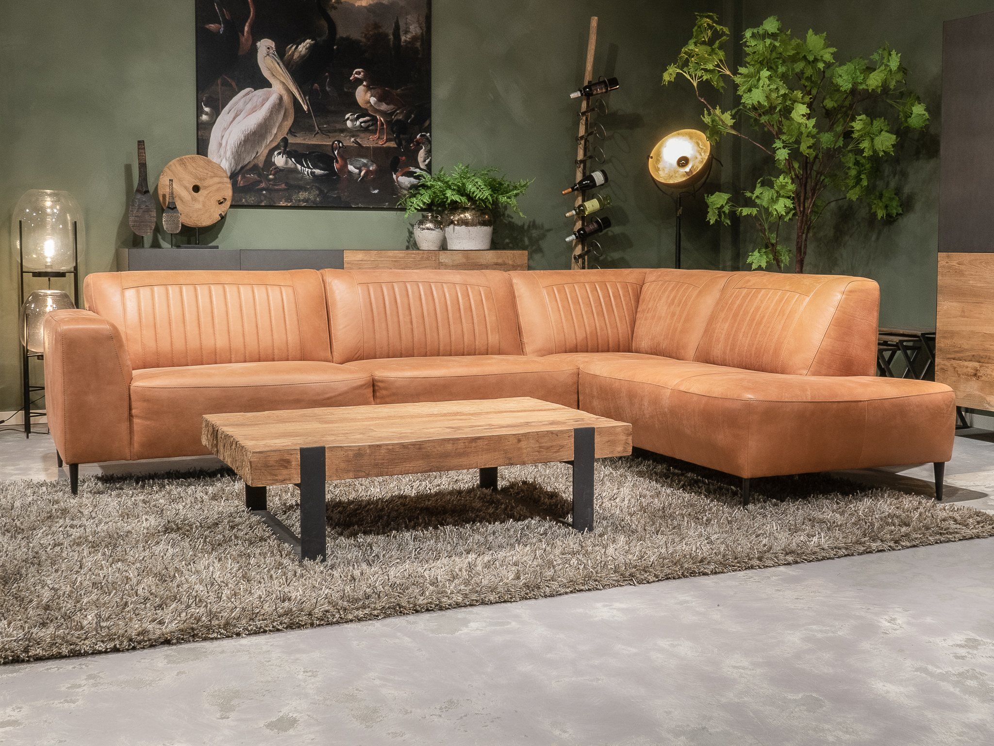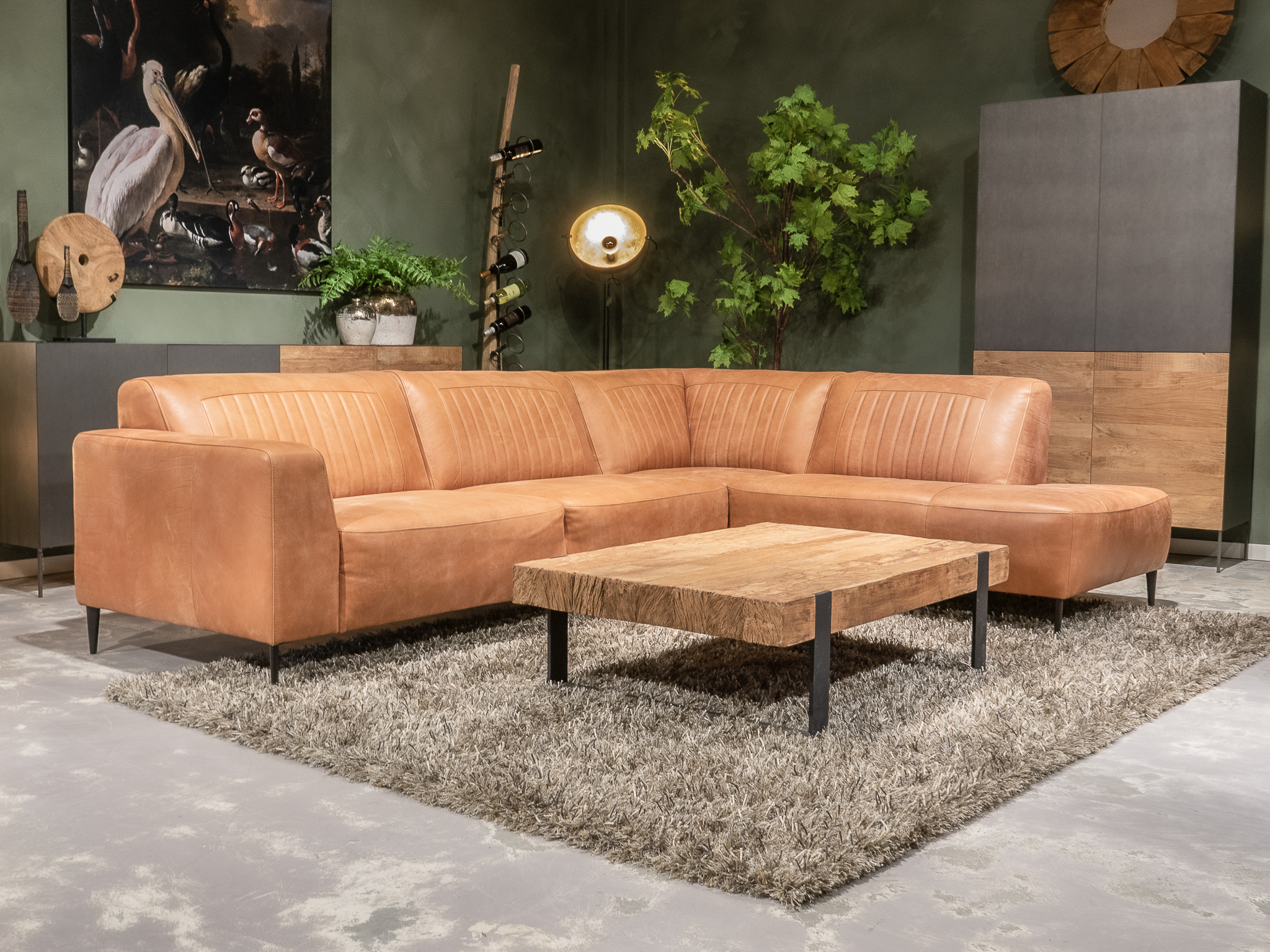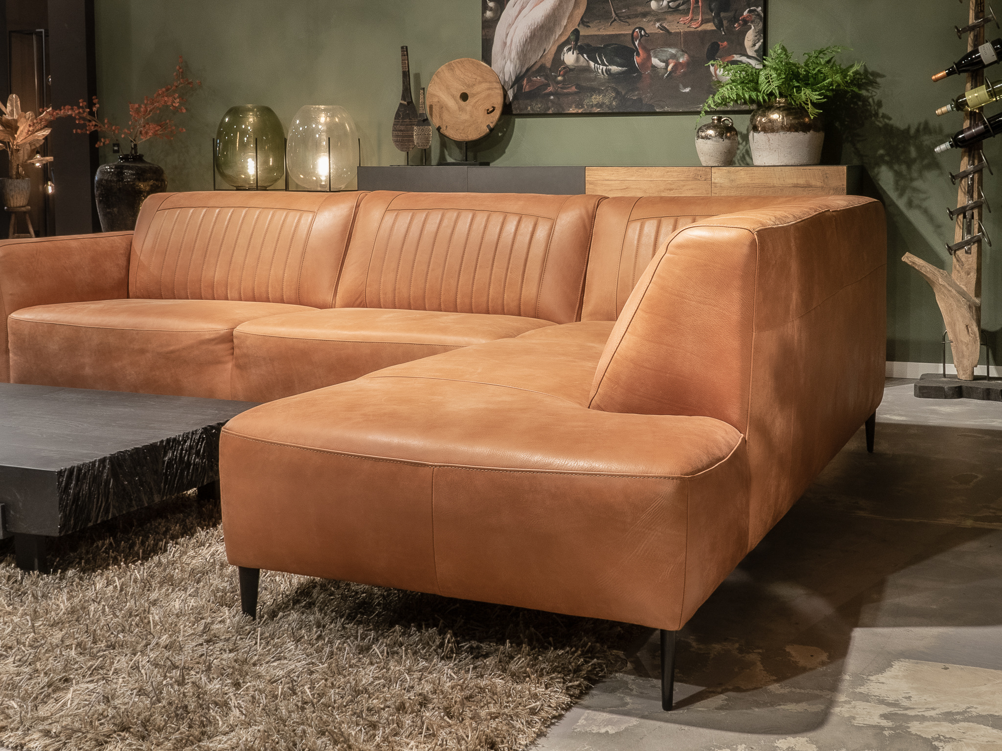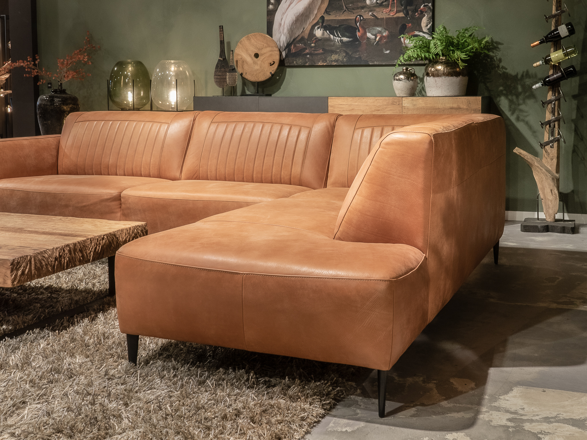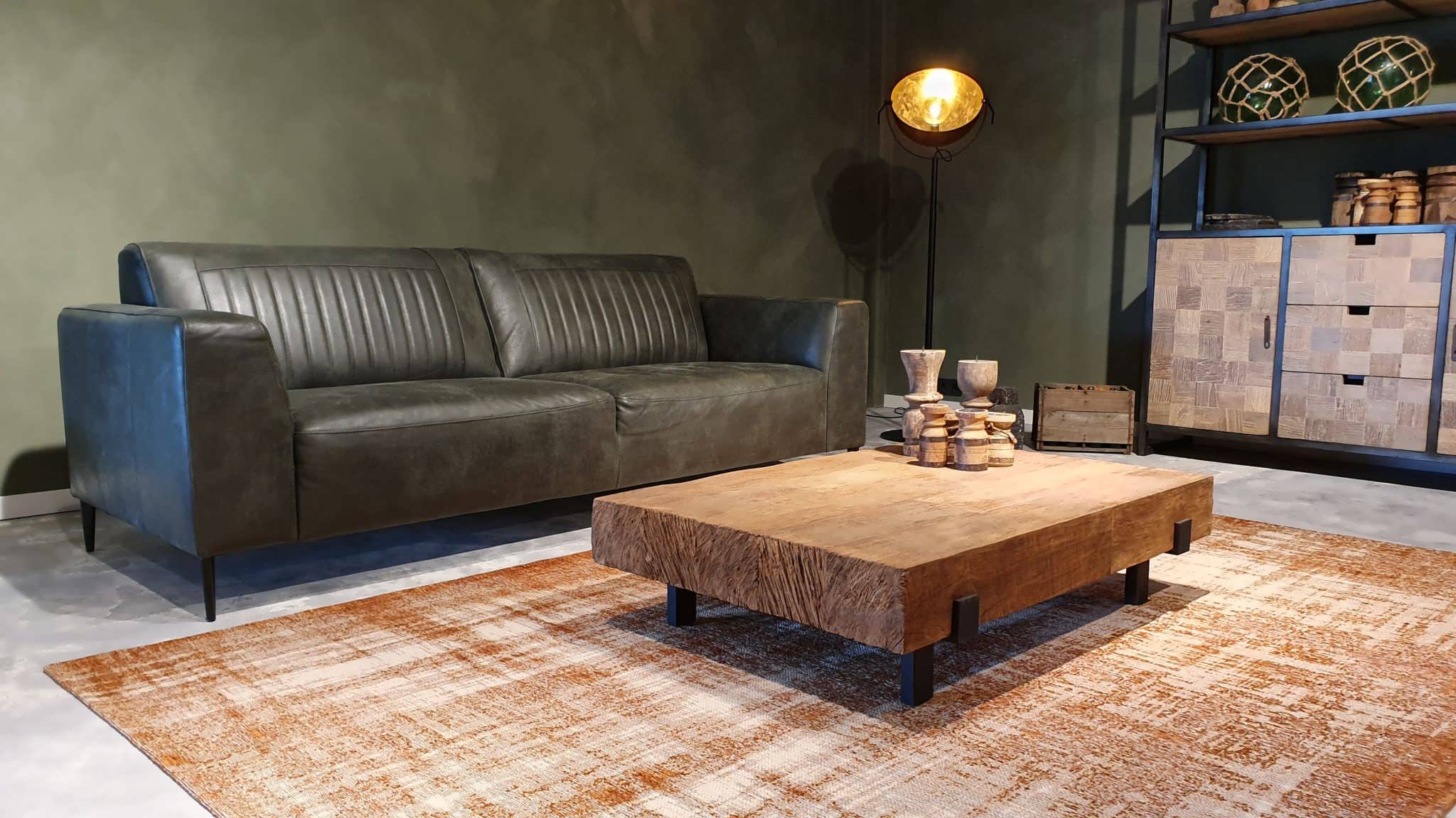 Deze bank staat in onze showroom in Sliedrecht in het geschuurde leer dark green als 3 zits, daarnaast ook in het leer met een open eiland in walnut. In Gramsbergen staat deze als 3 zits in het bull eco leder moss