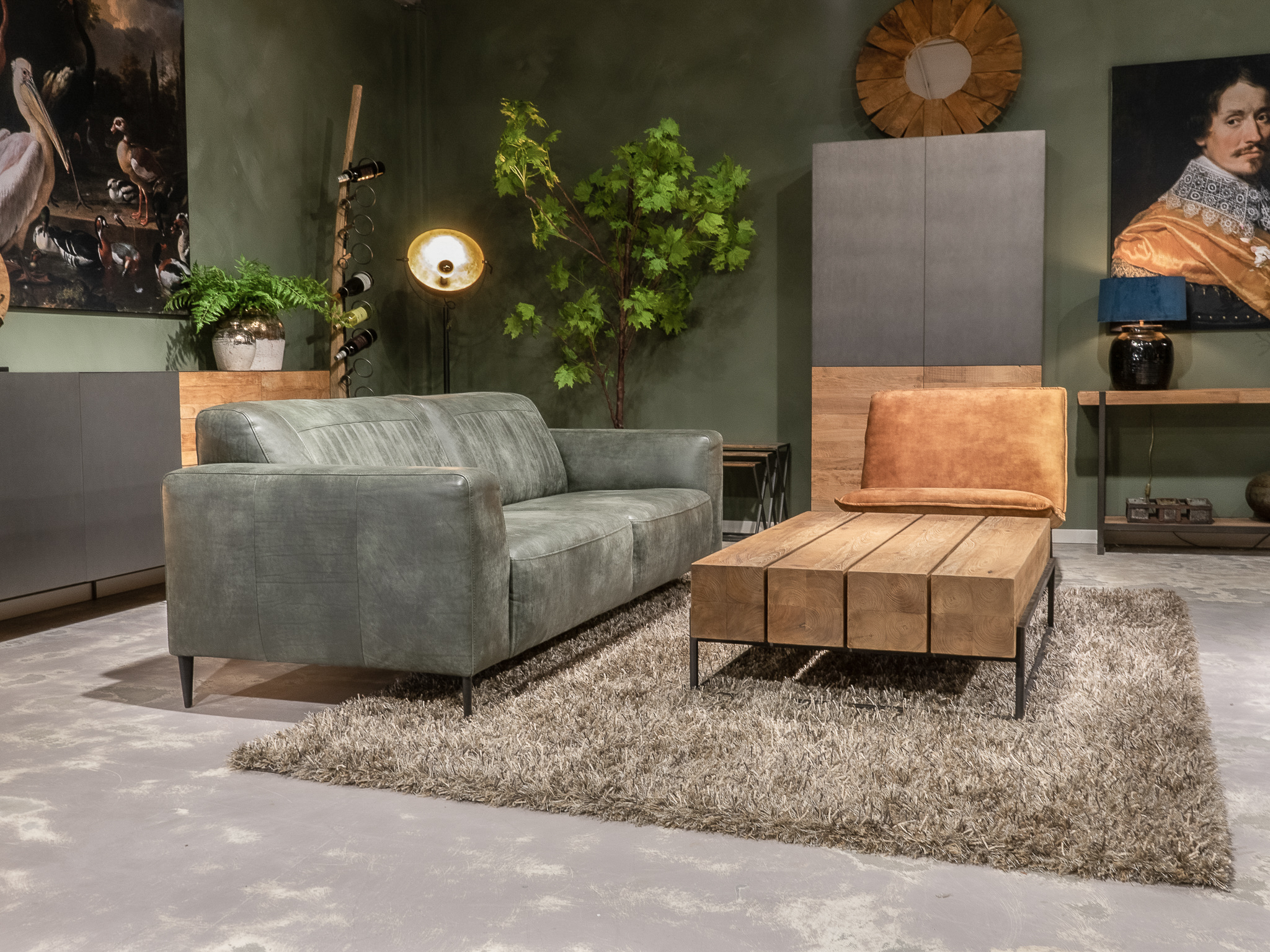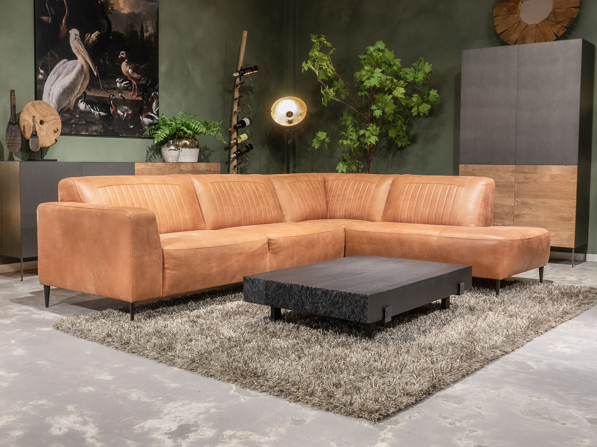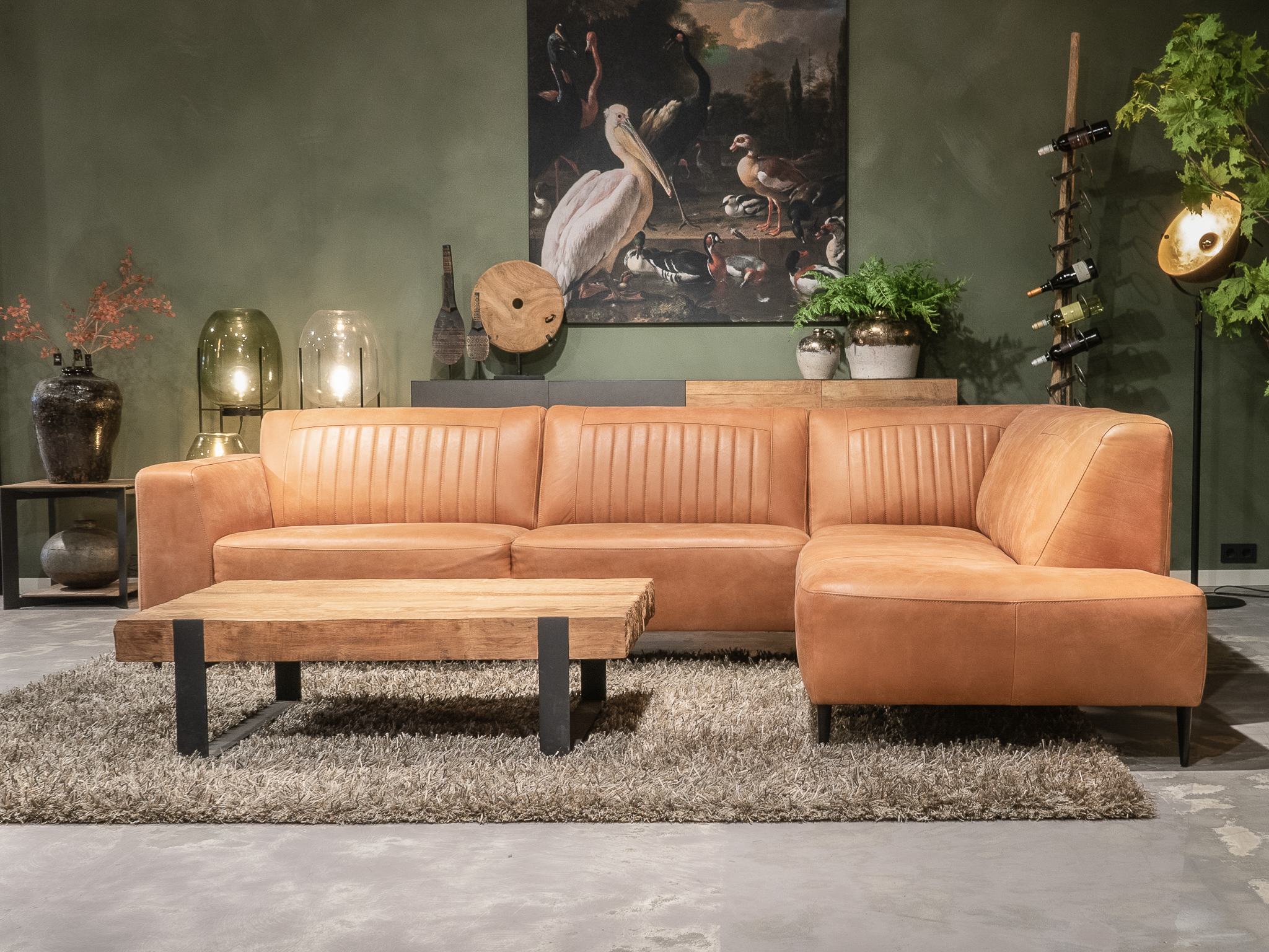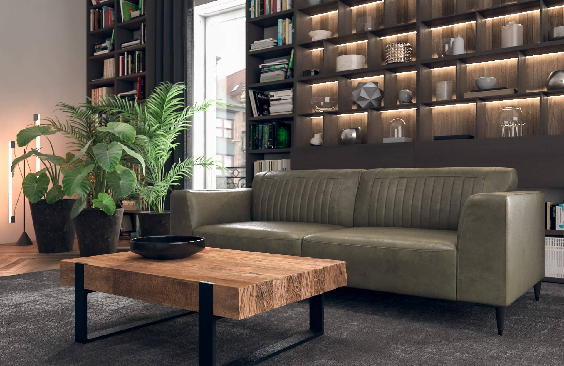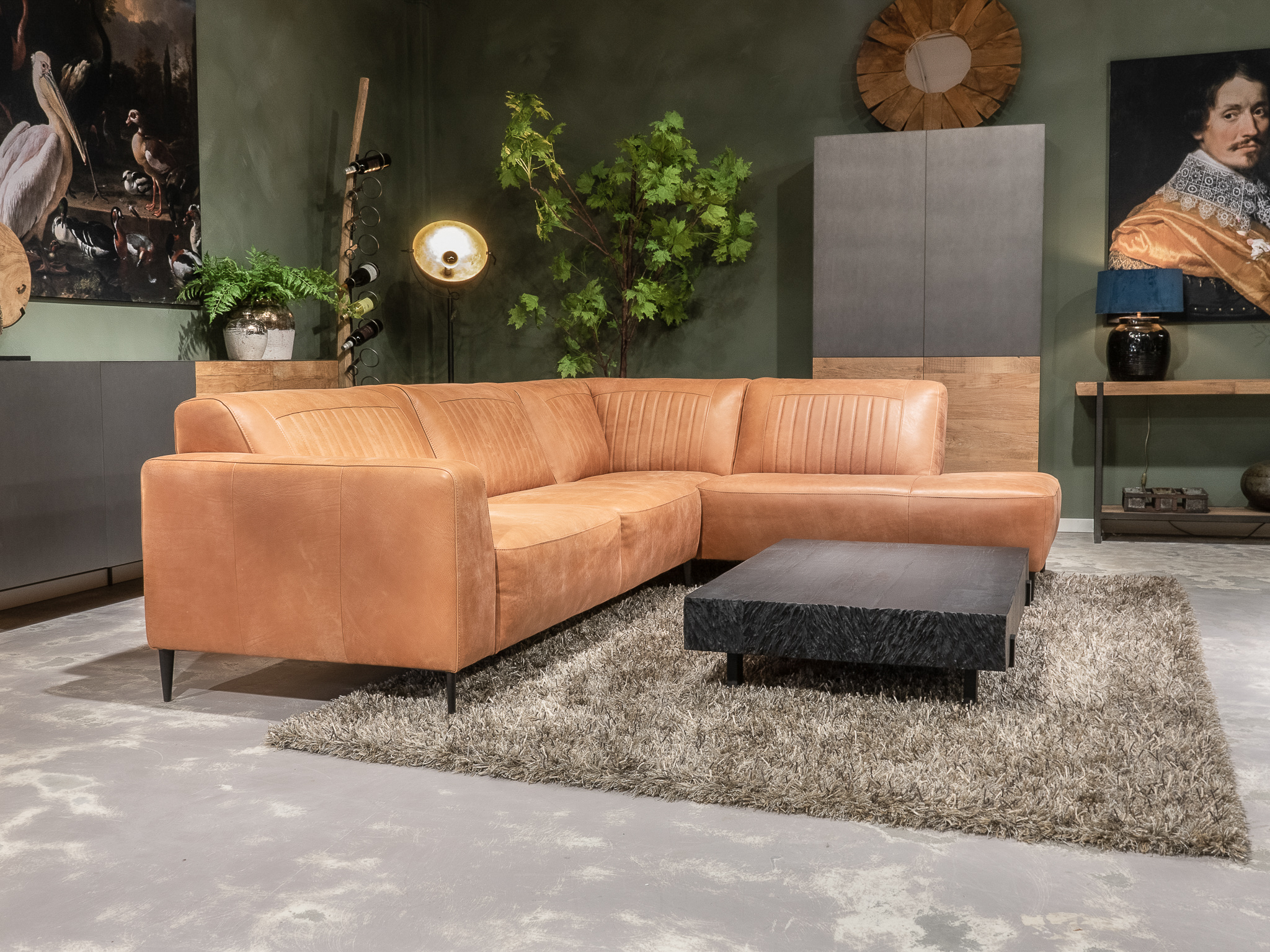 Deze bank staat in onze showroom in Sliedrecht in het geschuurde leer dark green als 3 zits, daarnaast ook in het leer met een open eiland in walnut. In Gramsbergen staat deze als 3 zits in het bull eco leder moss
