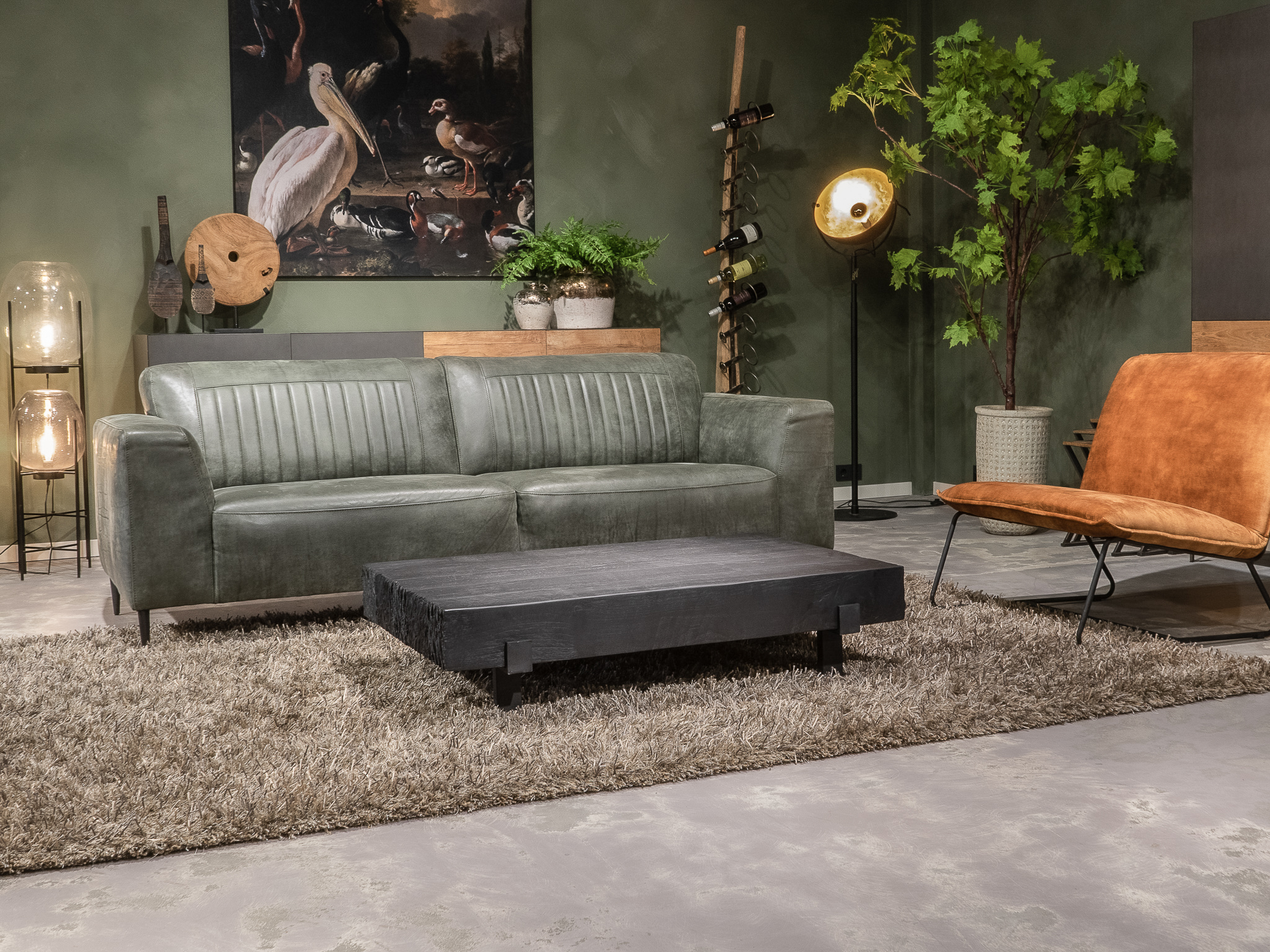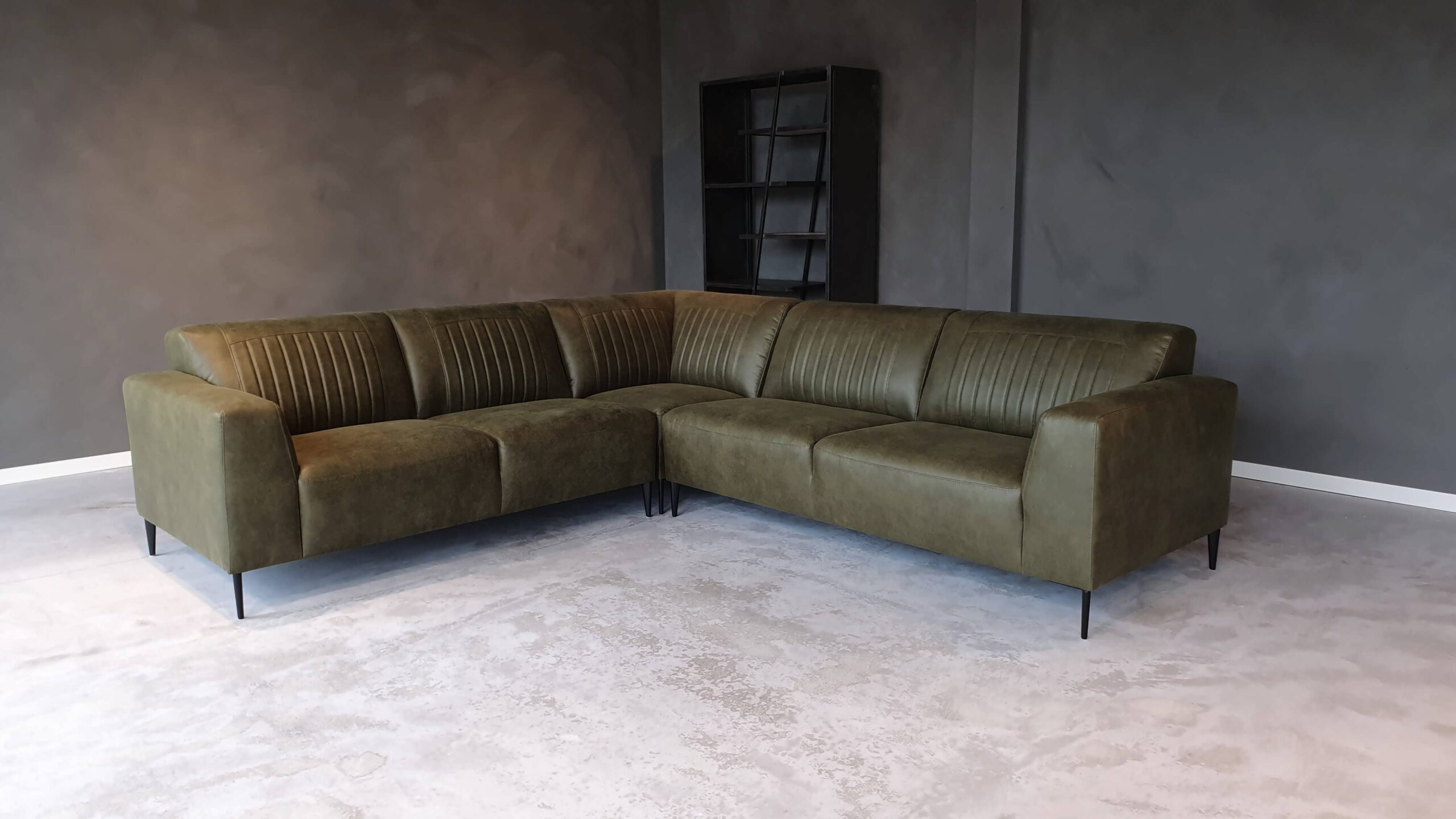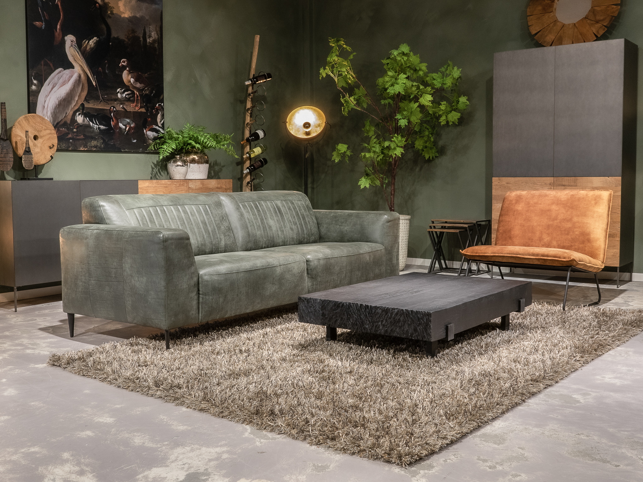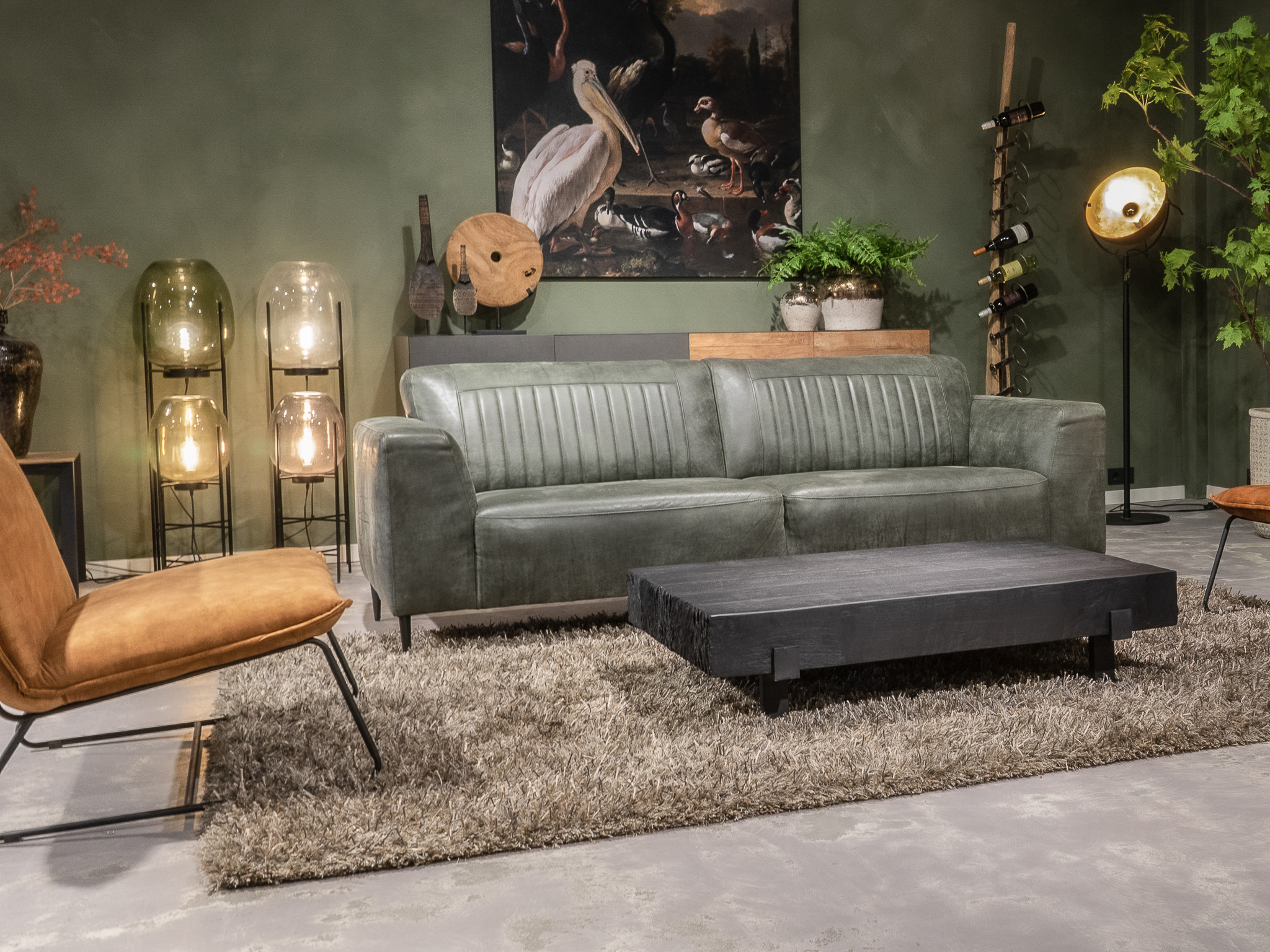 Deze bank staat in onze showroom in Sliedrecht in het geschuurde leer dark green als 3 zits, daarnaast ook in het leer met een open eiland in walnut. In Gramsbergen staat deze als 3 zits in het bull eco leder moss