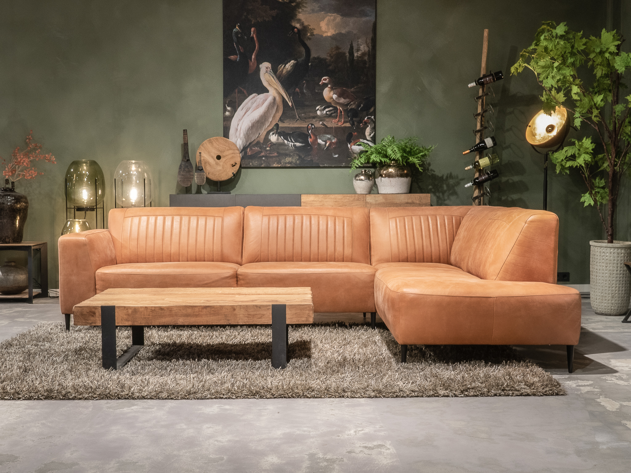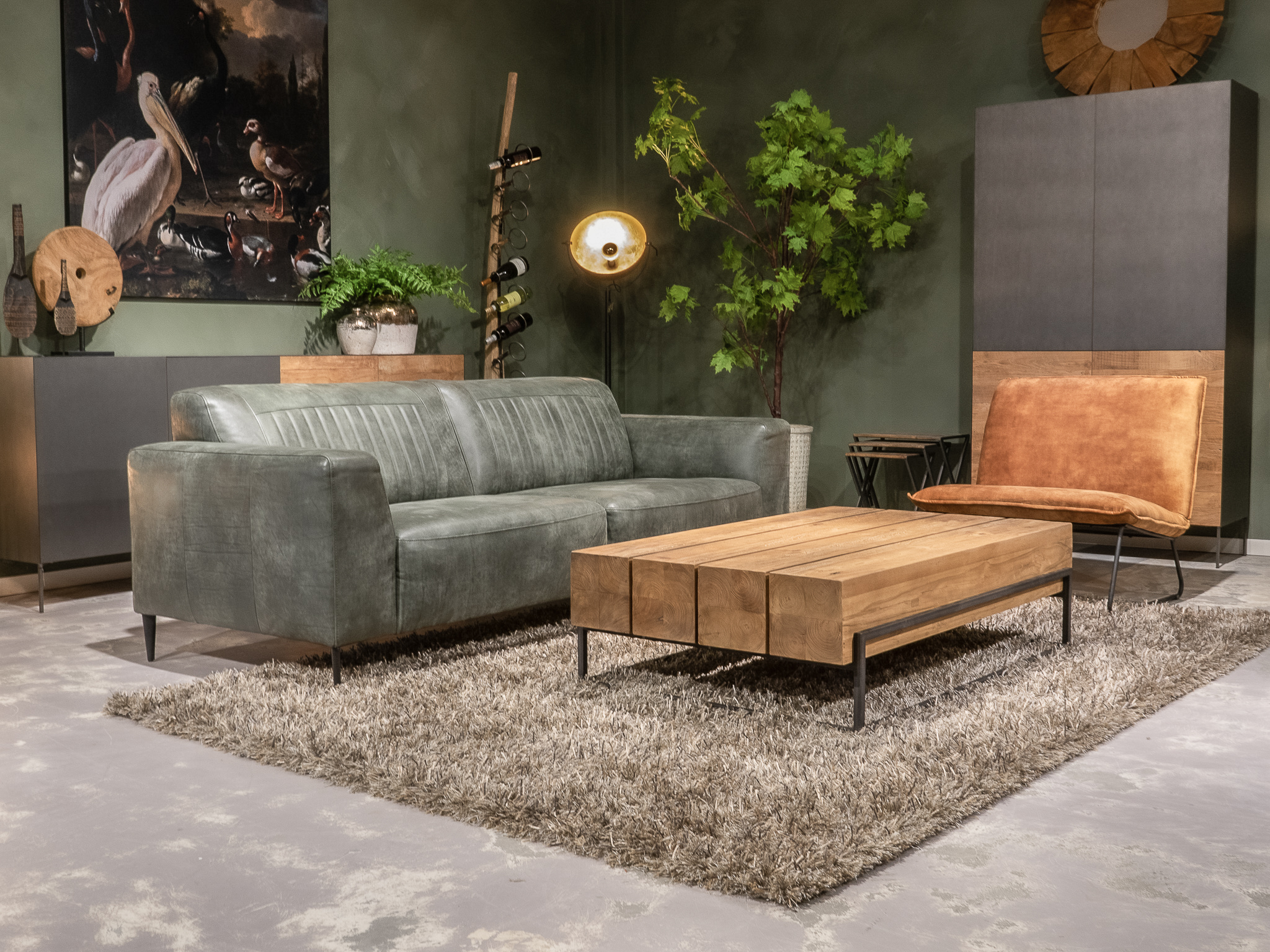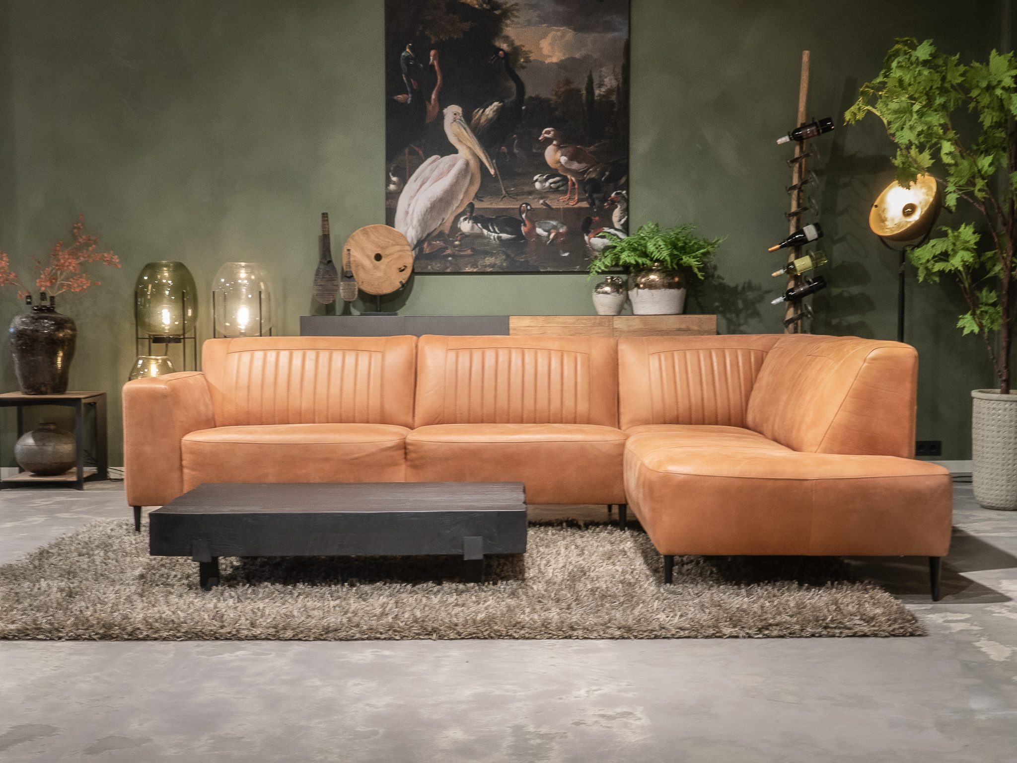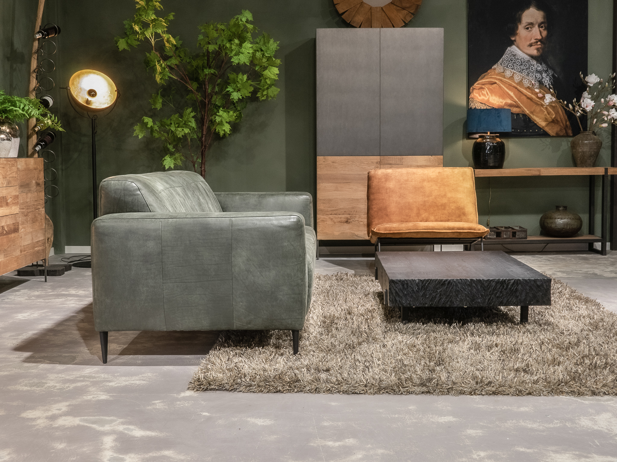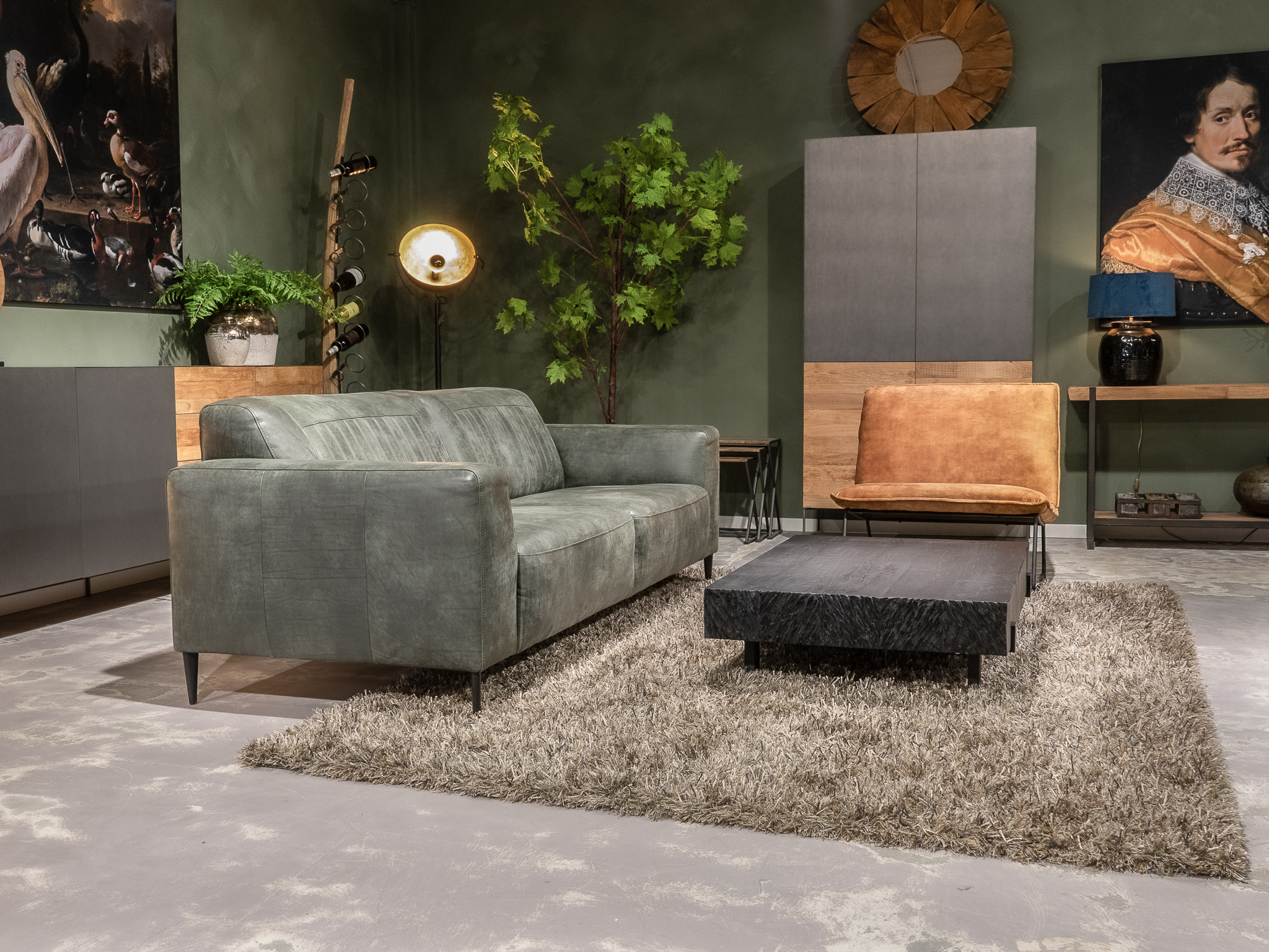 Deze bank staat in onze showroom in Sliedrecht in het geschuurde leer dark green als 3 zits, daarnaast ook in het leer met een open eiland in walnut. In Gramsbergen staat deze als 3 zits in het bull eco leder moss