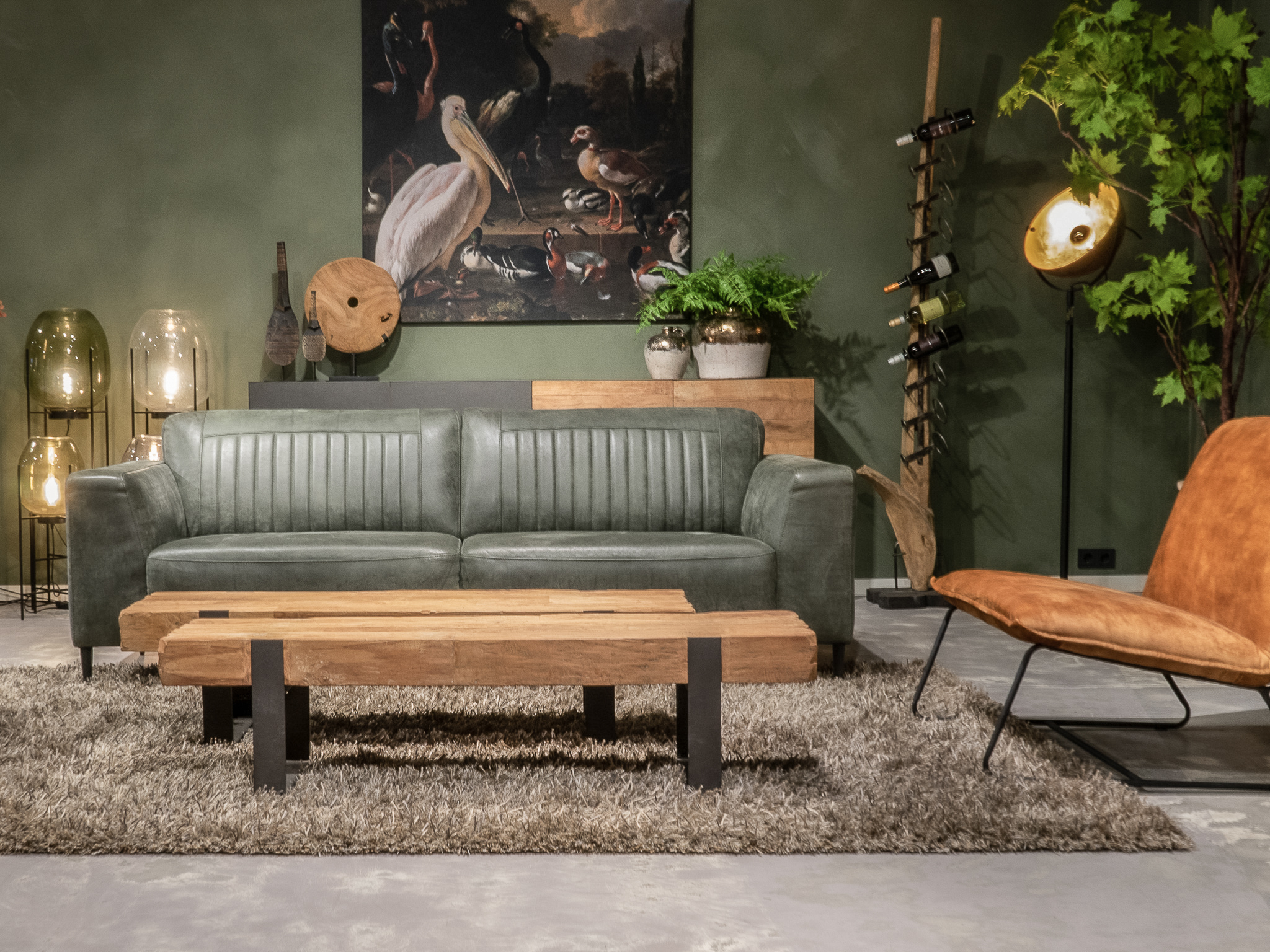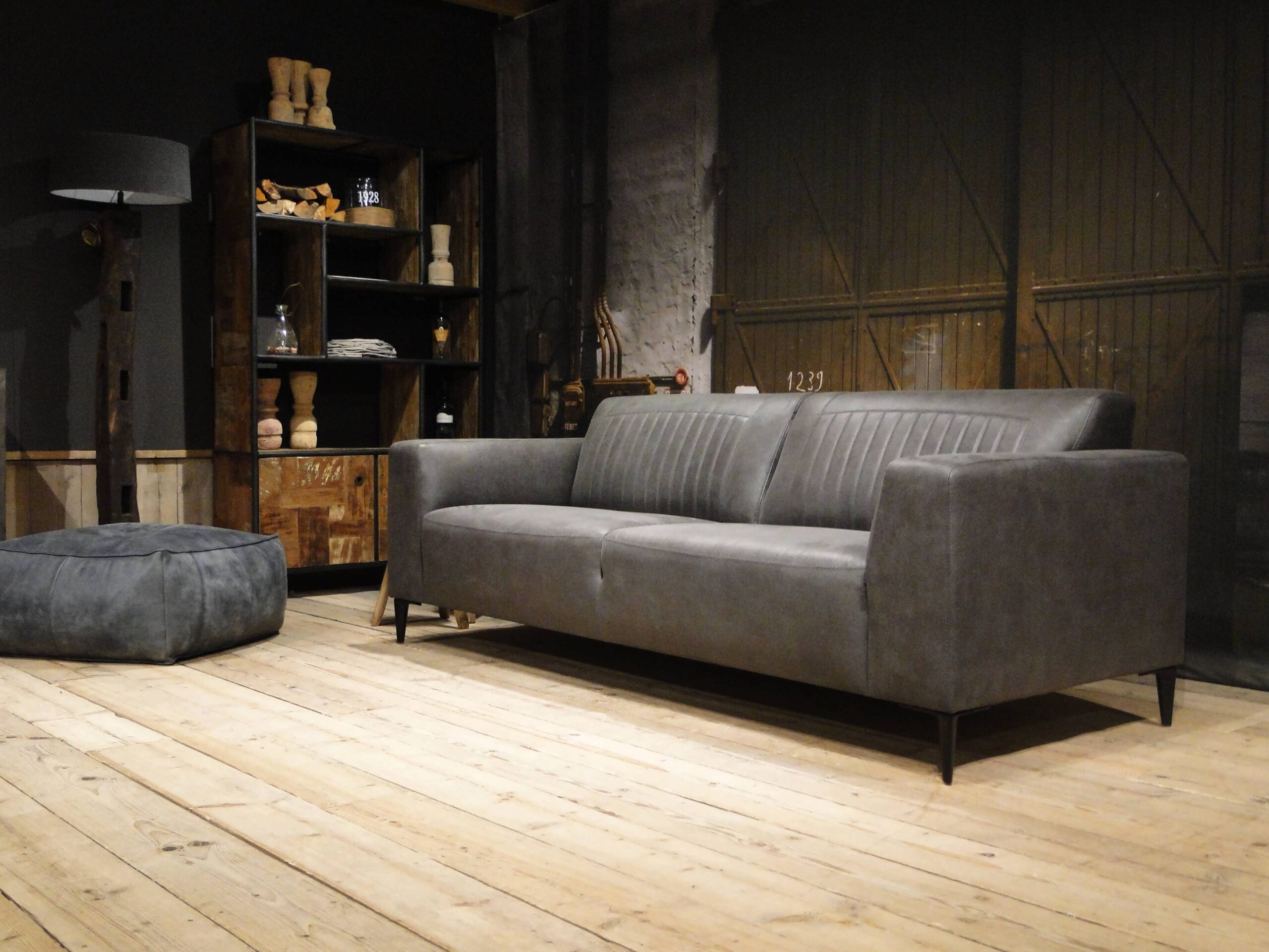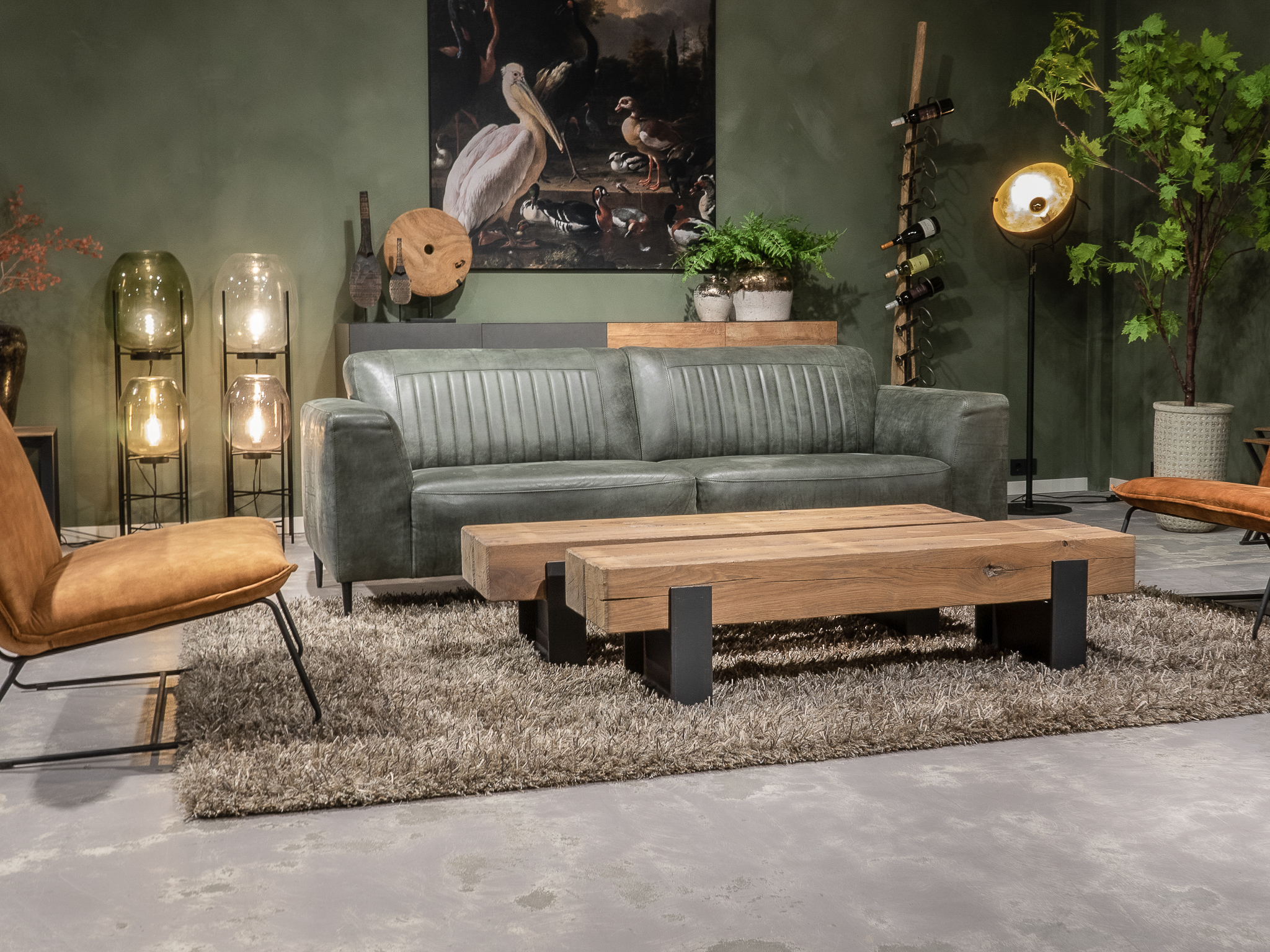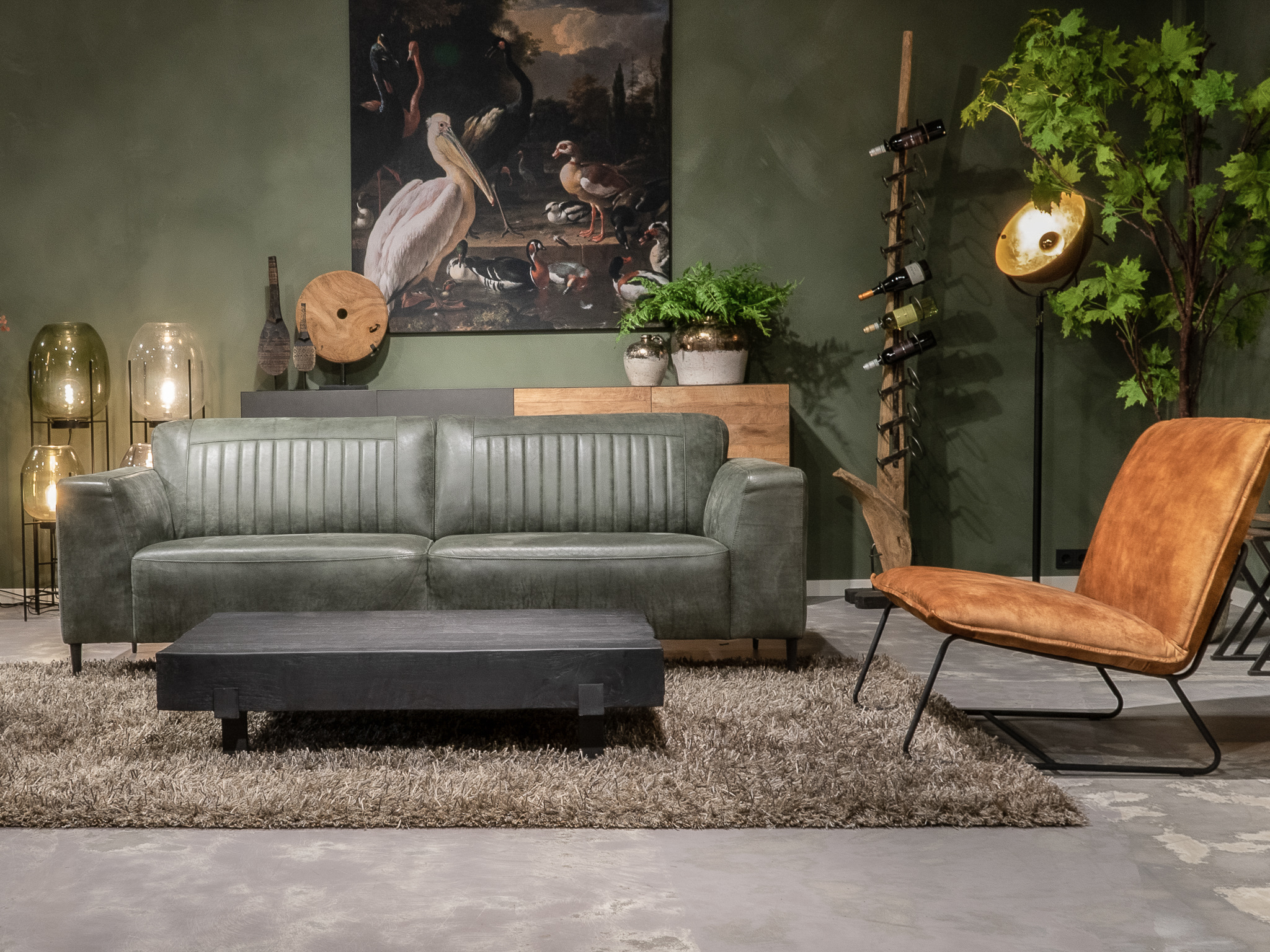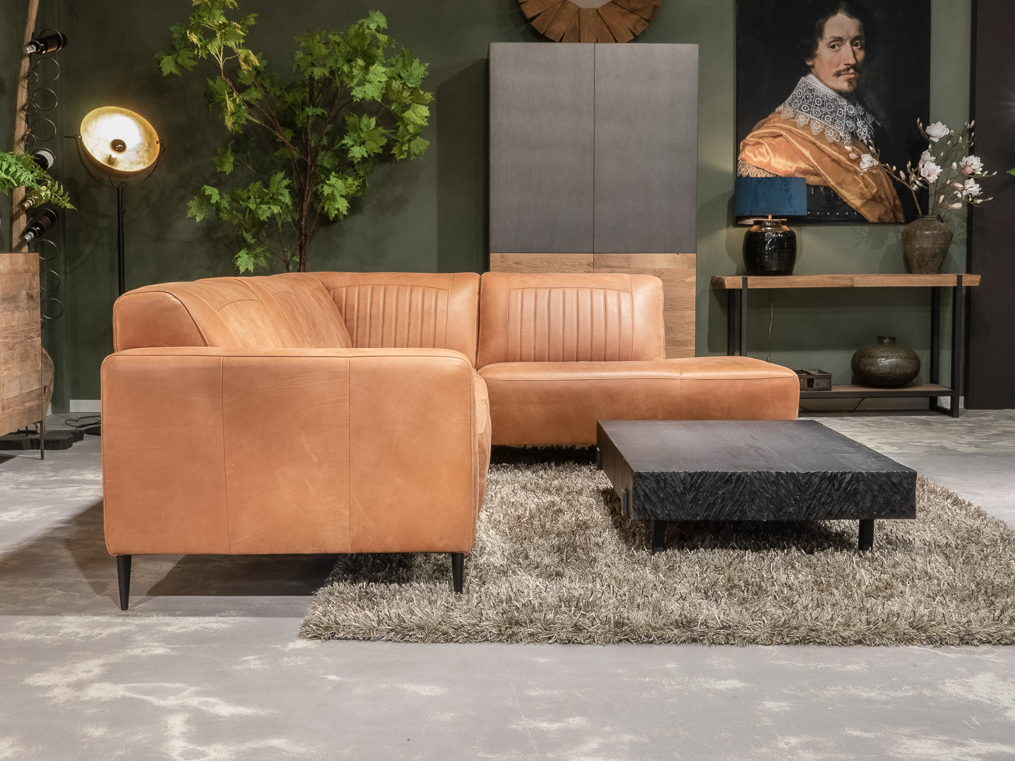 Deze bank staat in onze showroom in Sliedrecht in het geschuurde leer dark green als 3 zits, daarnaast ook in het leer met een open eiland in walnut. In Gramsbergen staat deze als 3 zits in het bull eco leder moss