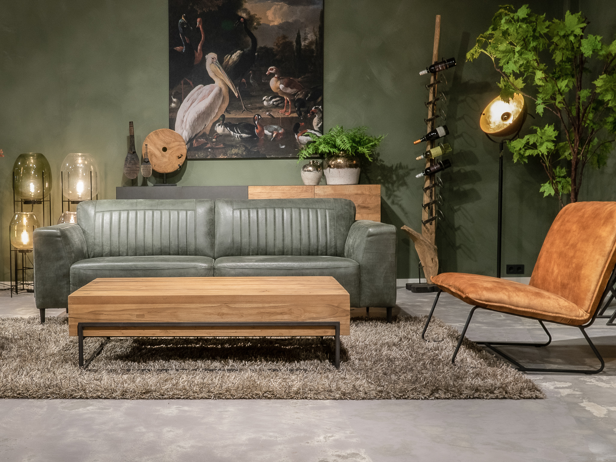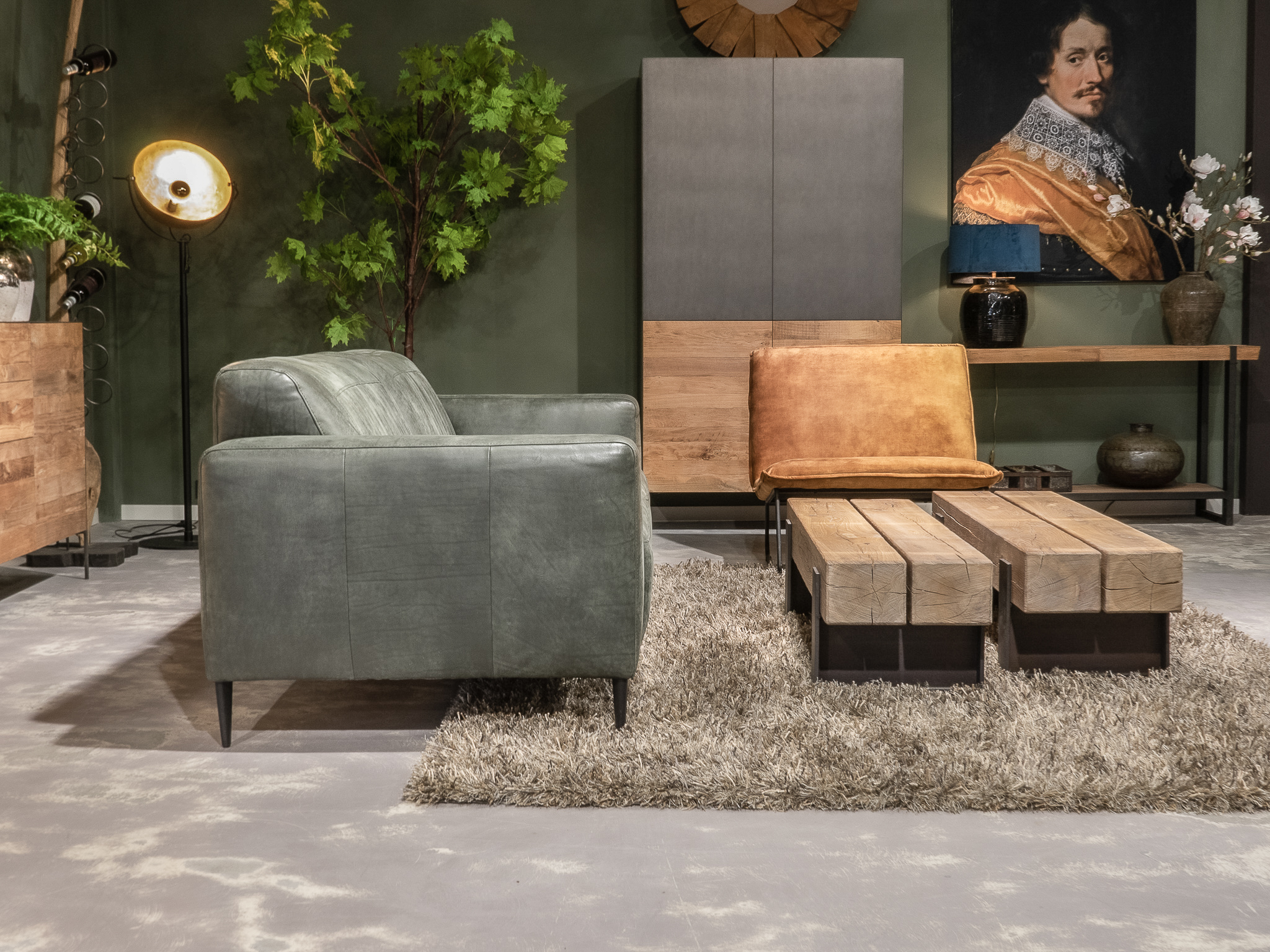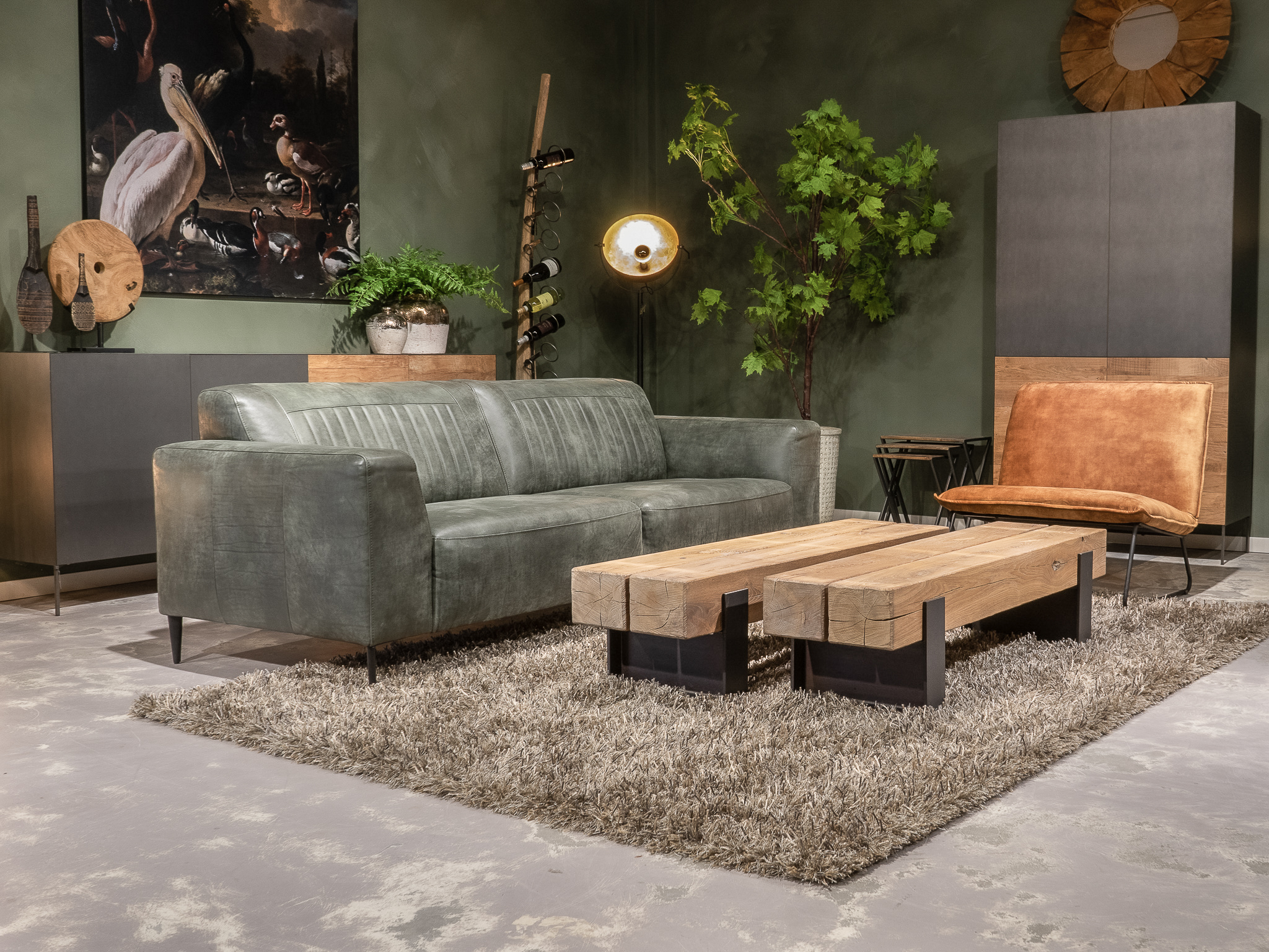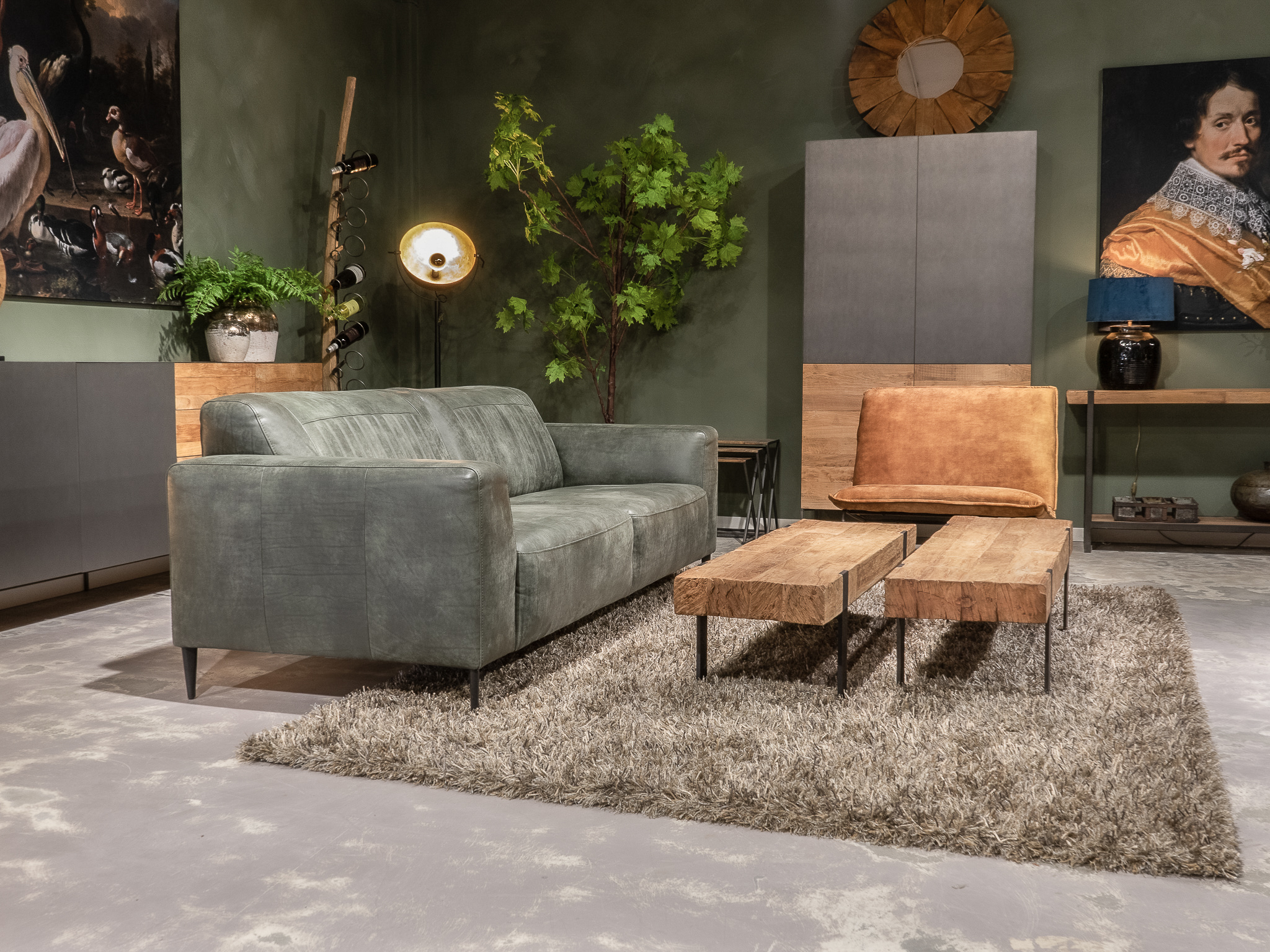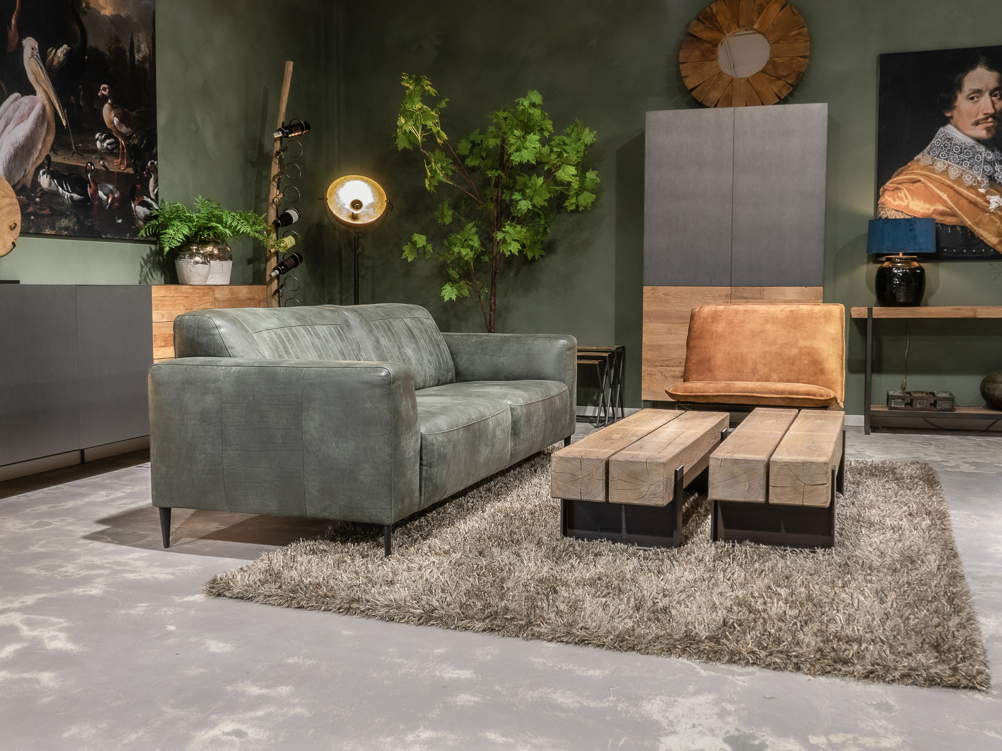Deze bank staat in onze showroom in Sliedrecht in het geschuurde leer dark green als 3 zits, daarnaast ook in het leer met een open eiland in walnut. In Gramsbergen staat deze als 3 zits in het bull eco leder moss