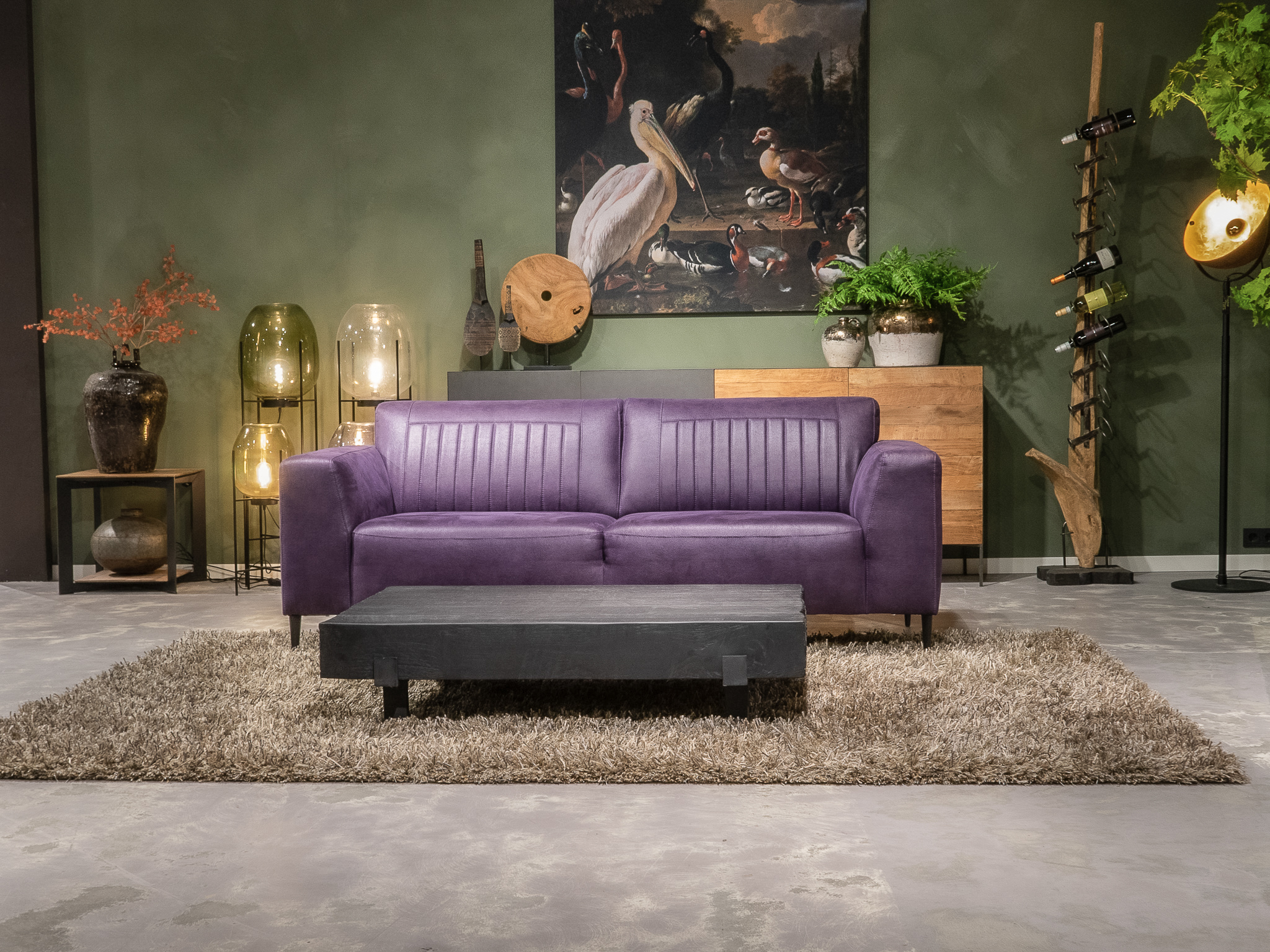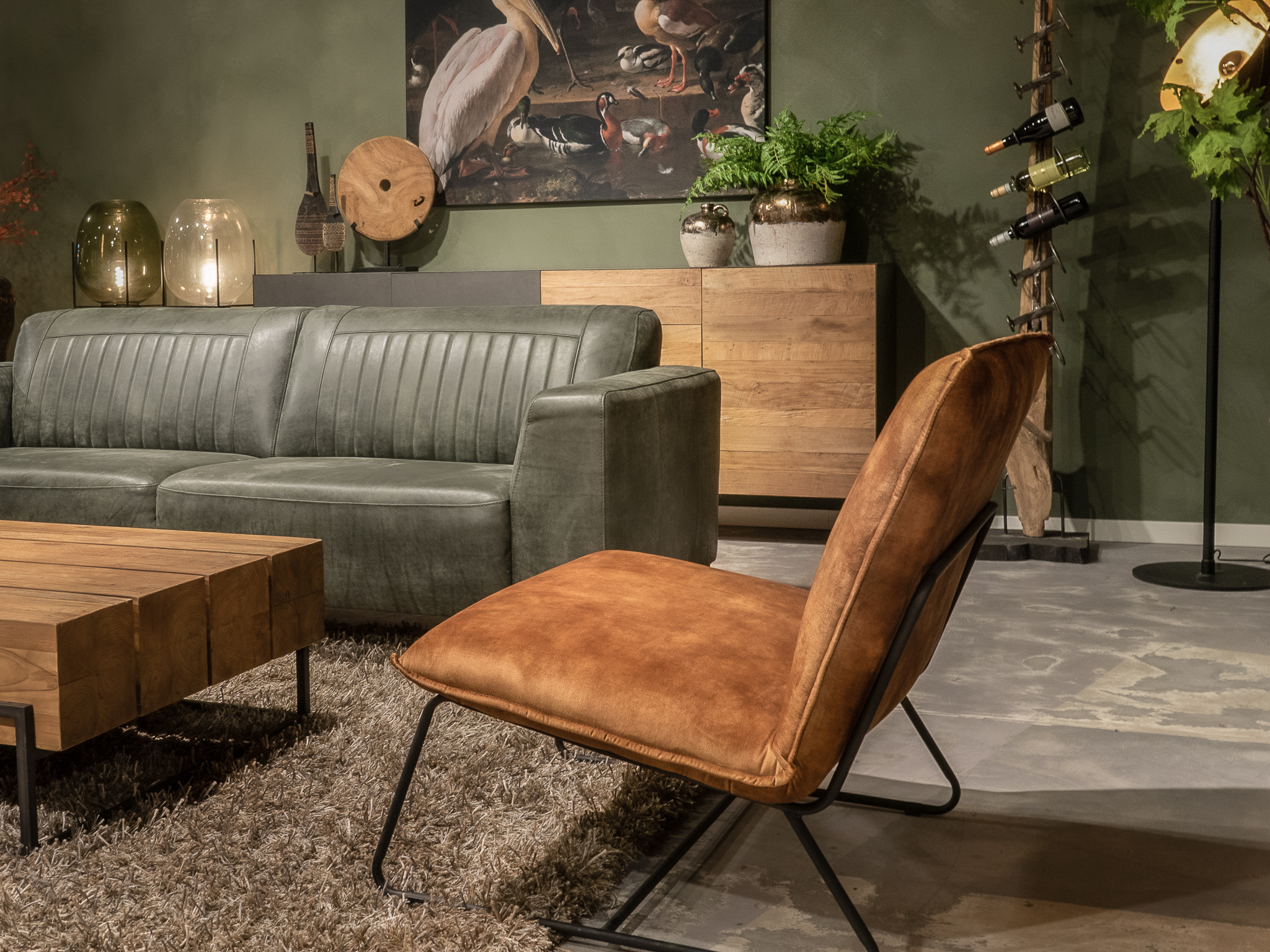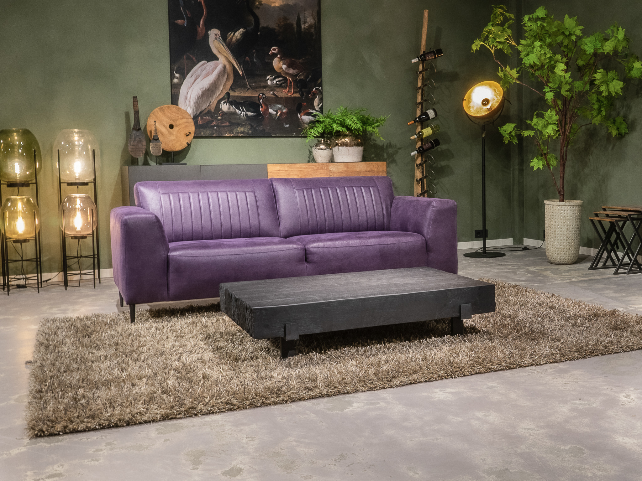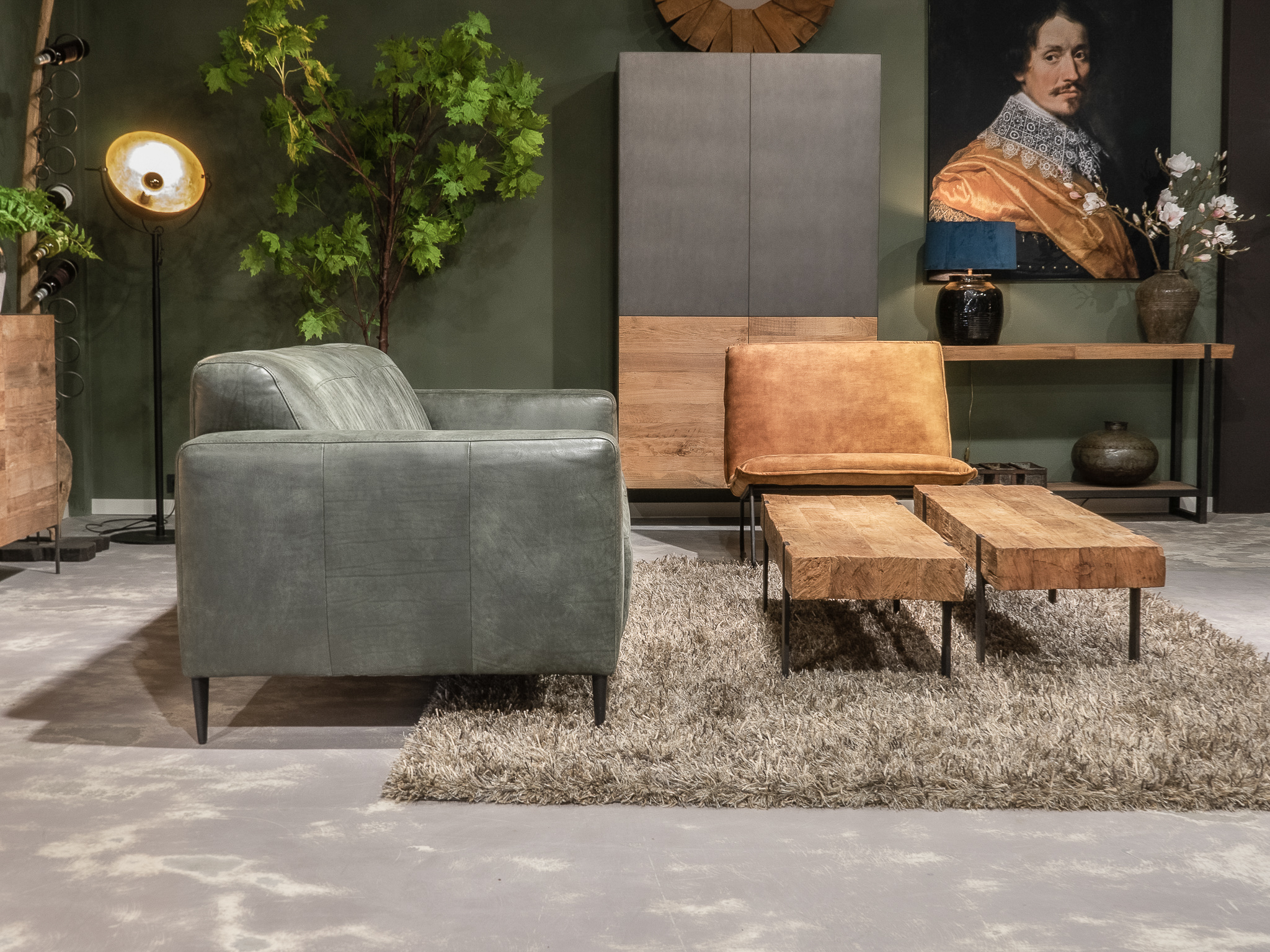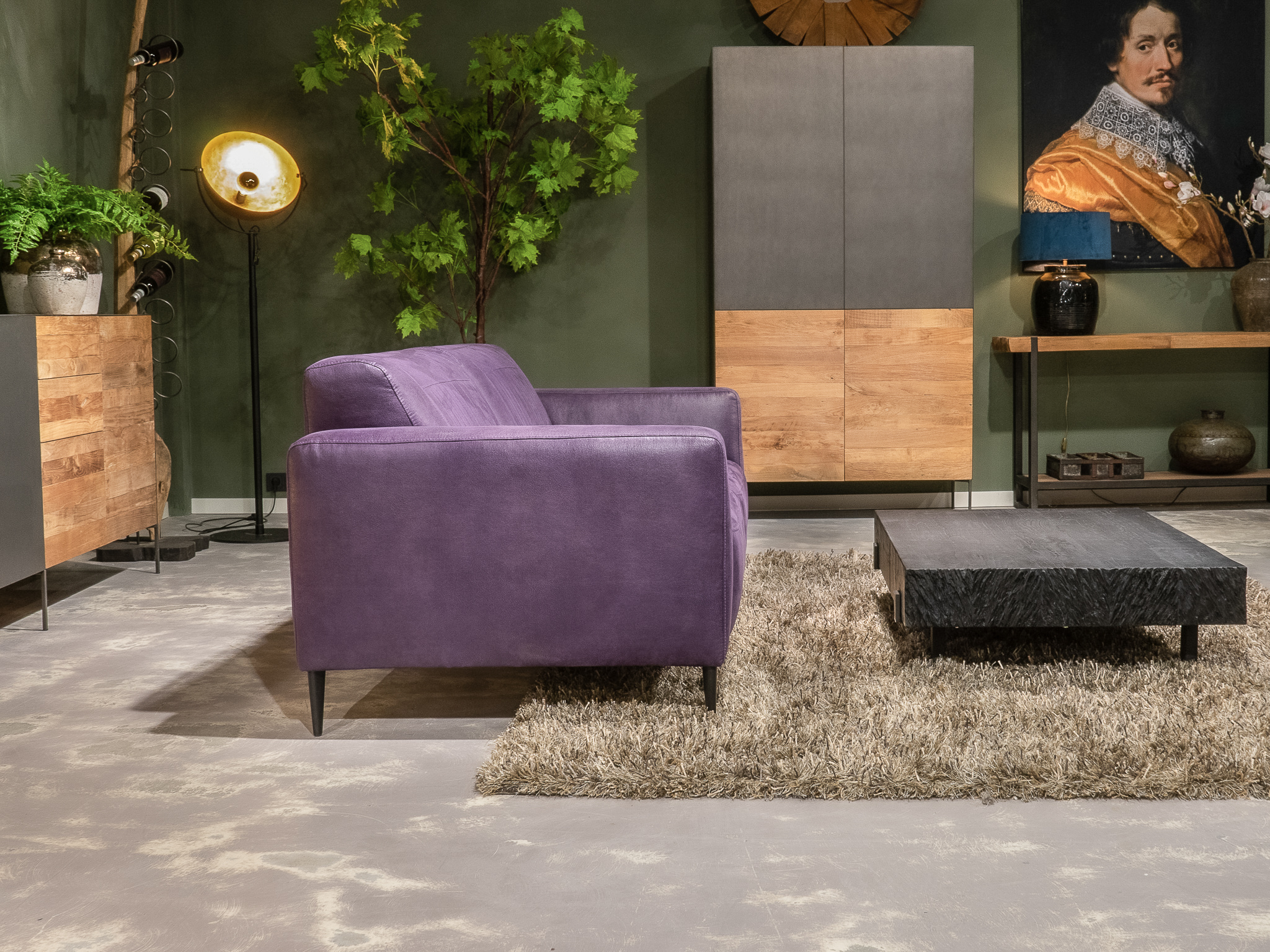 Deze bank staat in onze showroom in Sliedrecht in het geschuurde leer dark green als 3 zits, daarnaast ook in het leer met een open eiland in walnut. In Gramsbergen staat deze als 3 zits in het bull eco leder moss