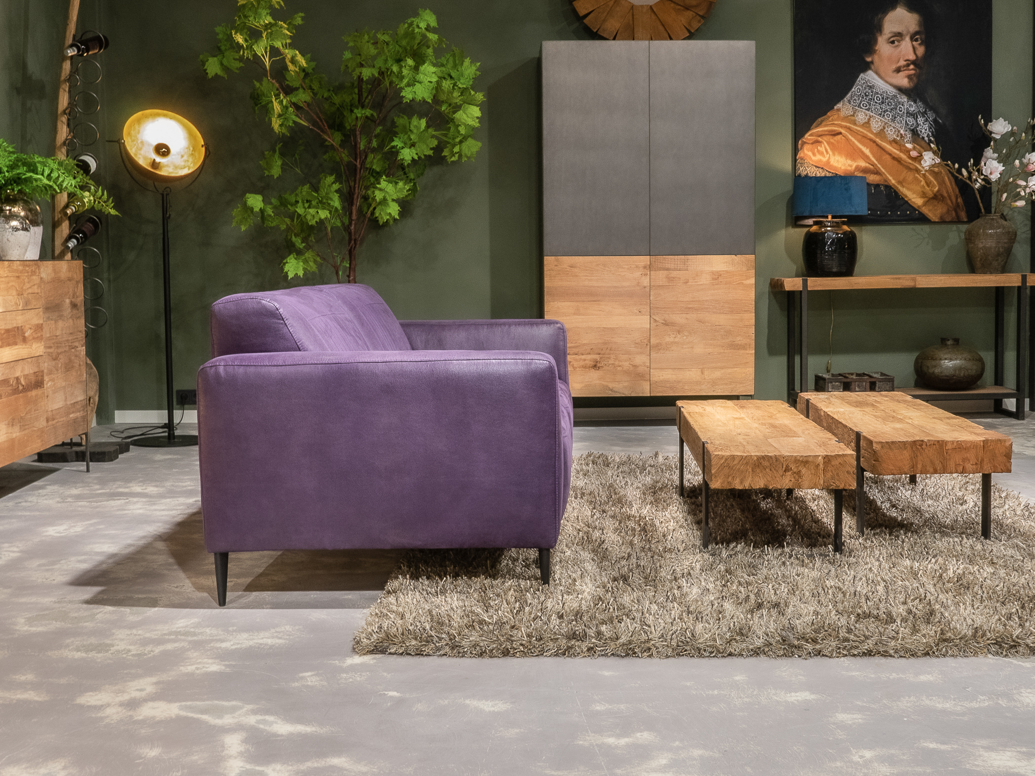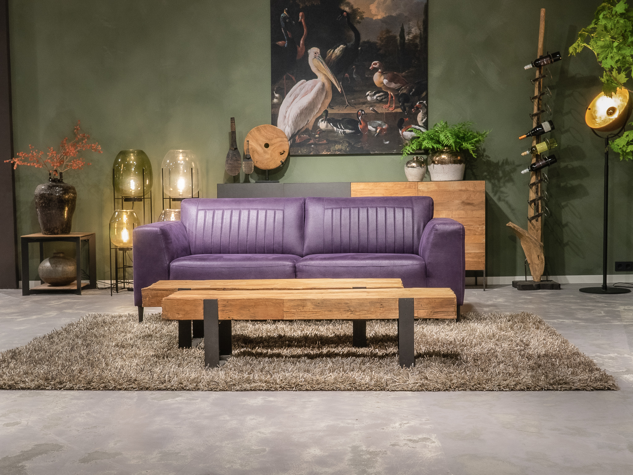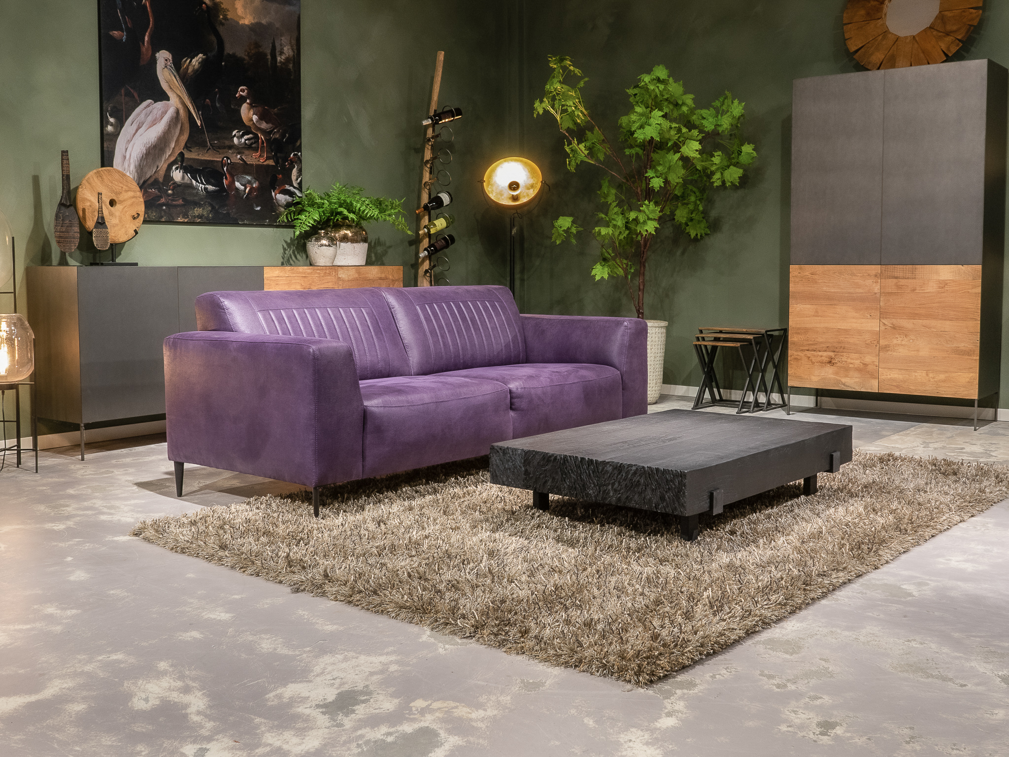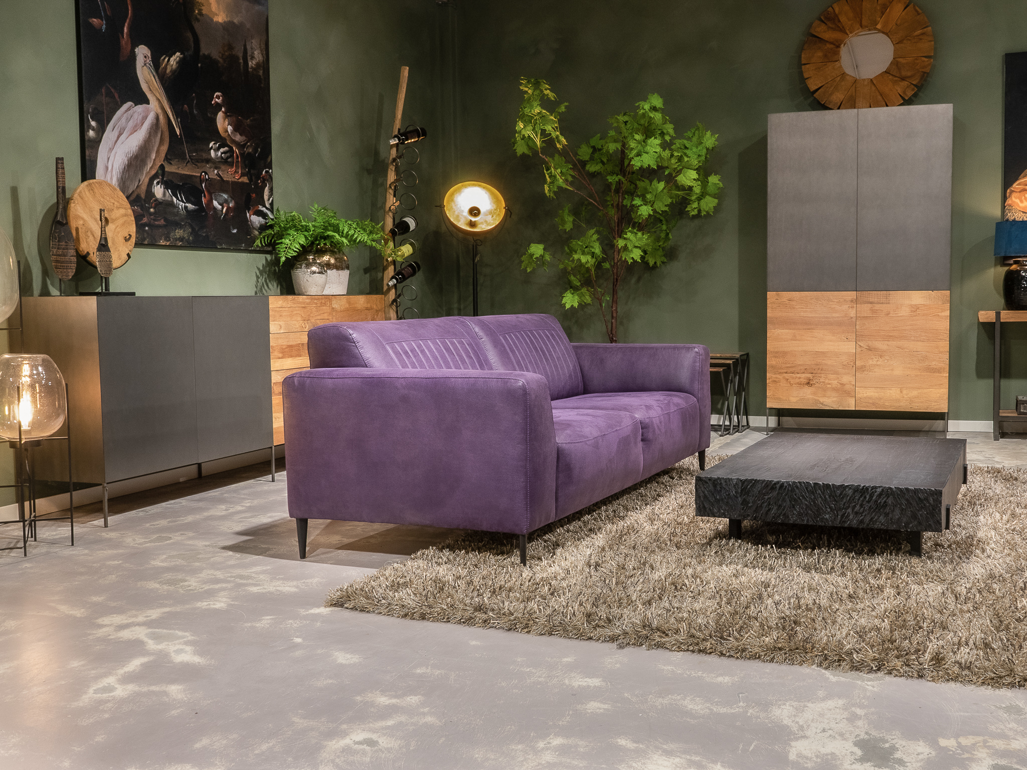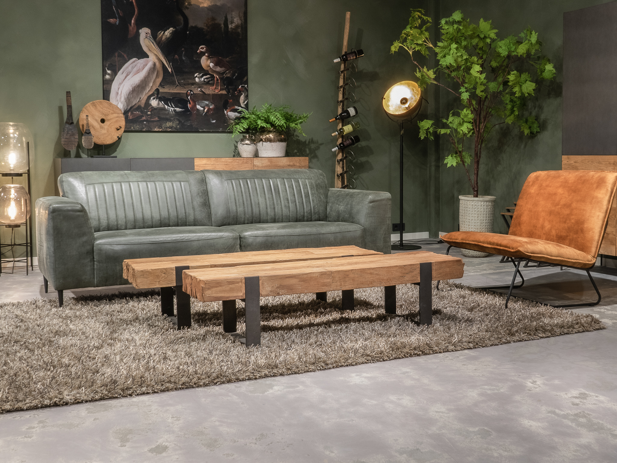 Deze bank staat in onze showroom in Sliedrecht in het geschuurde leer dark green als 3 zits, daarnaast ook in het leer met een open eiland in walnut. In Gramsbergen staat deze als 3 zits in het bull eco leder moss