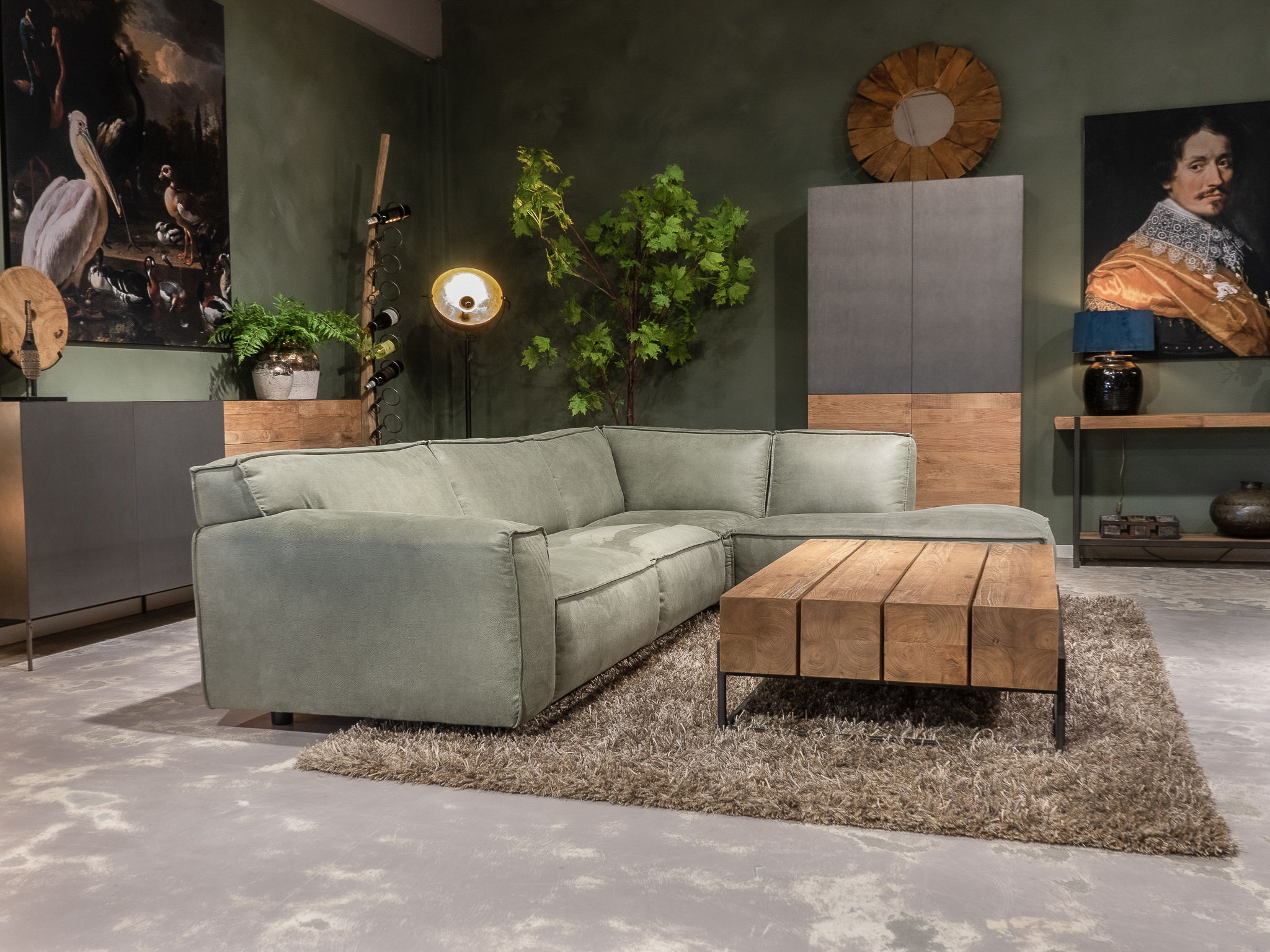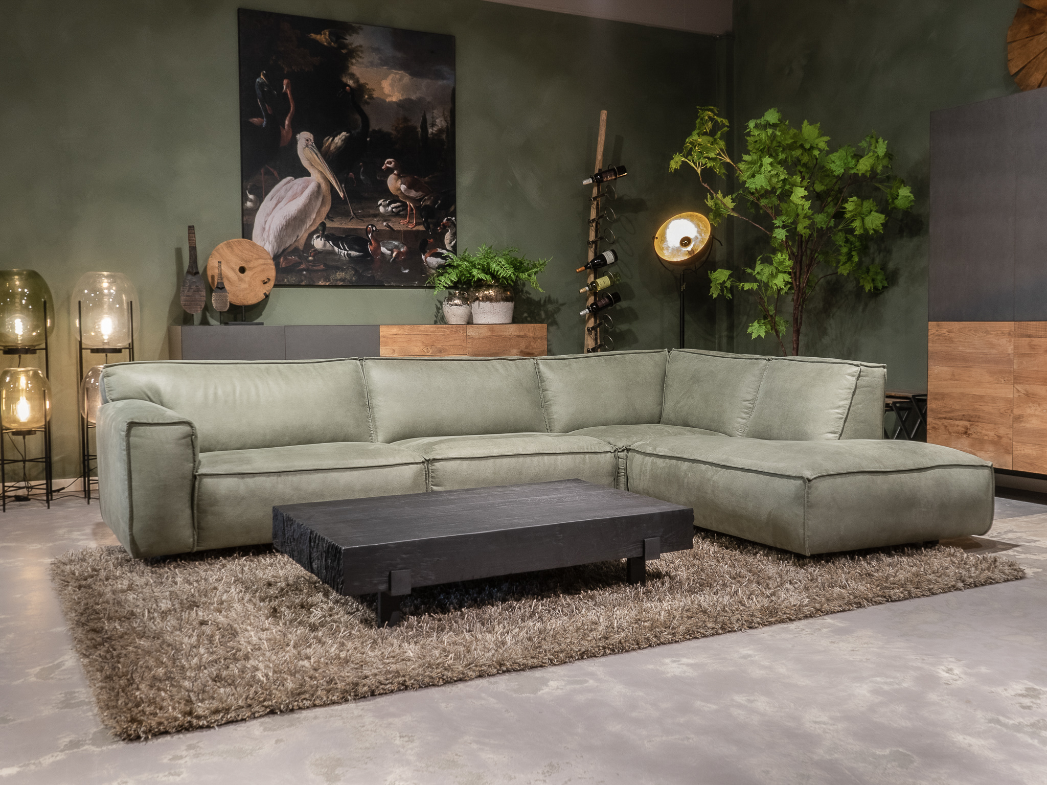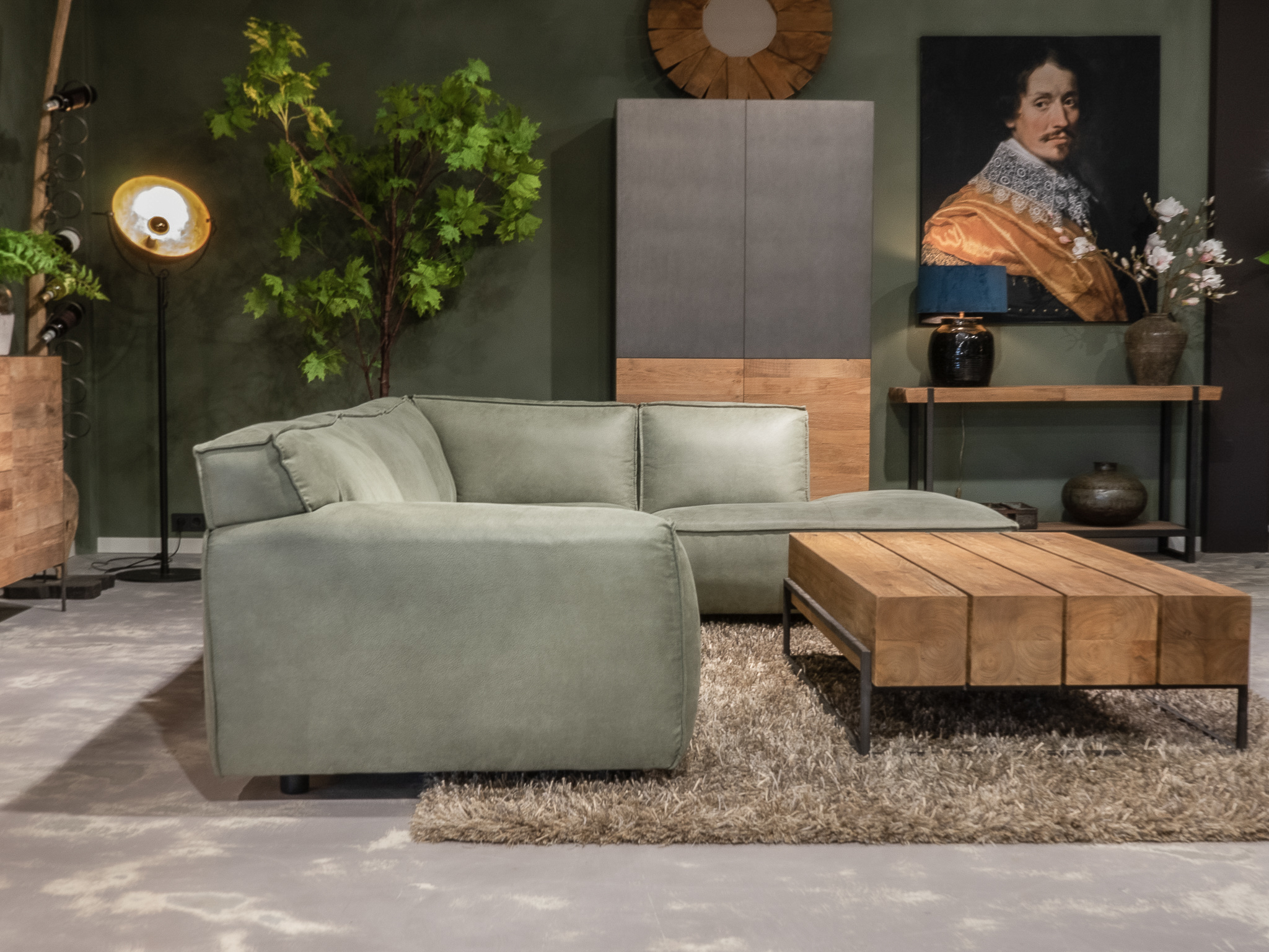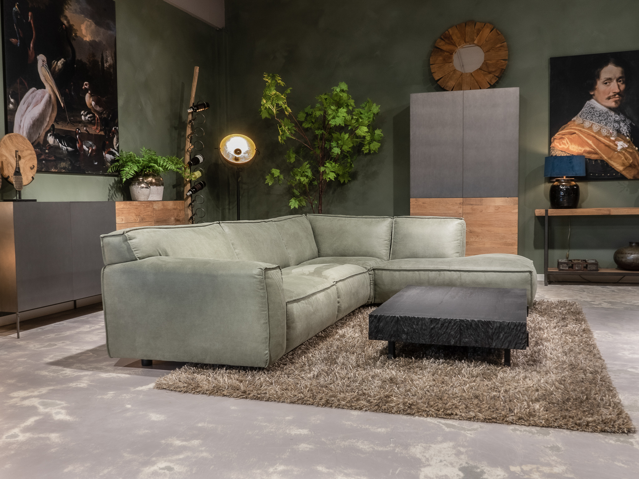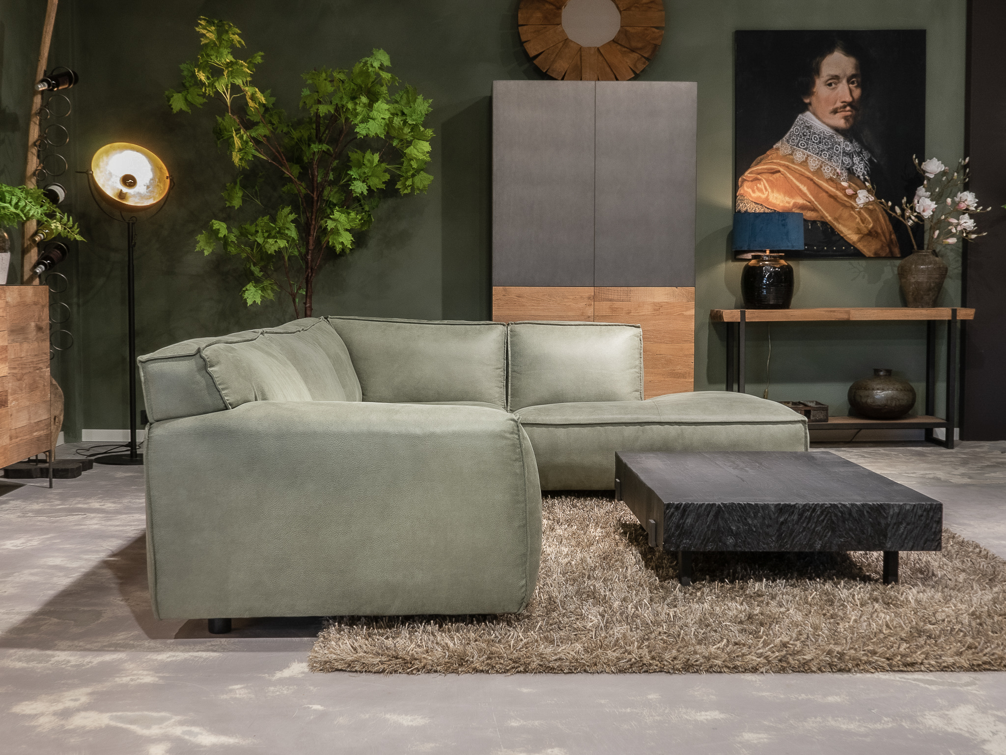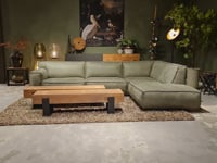 Dit model staat in beide showrooms in als hoekbank in de relax stof kleur turtle.