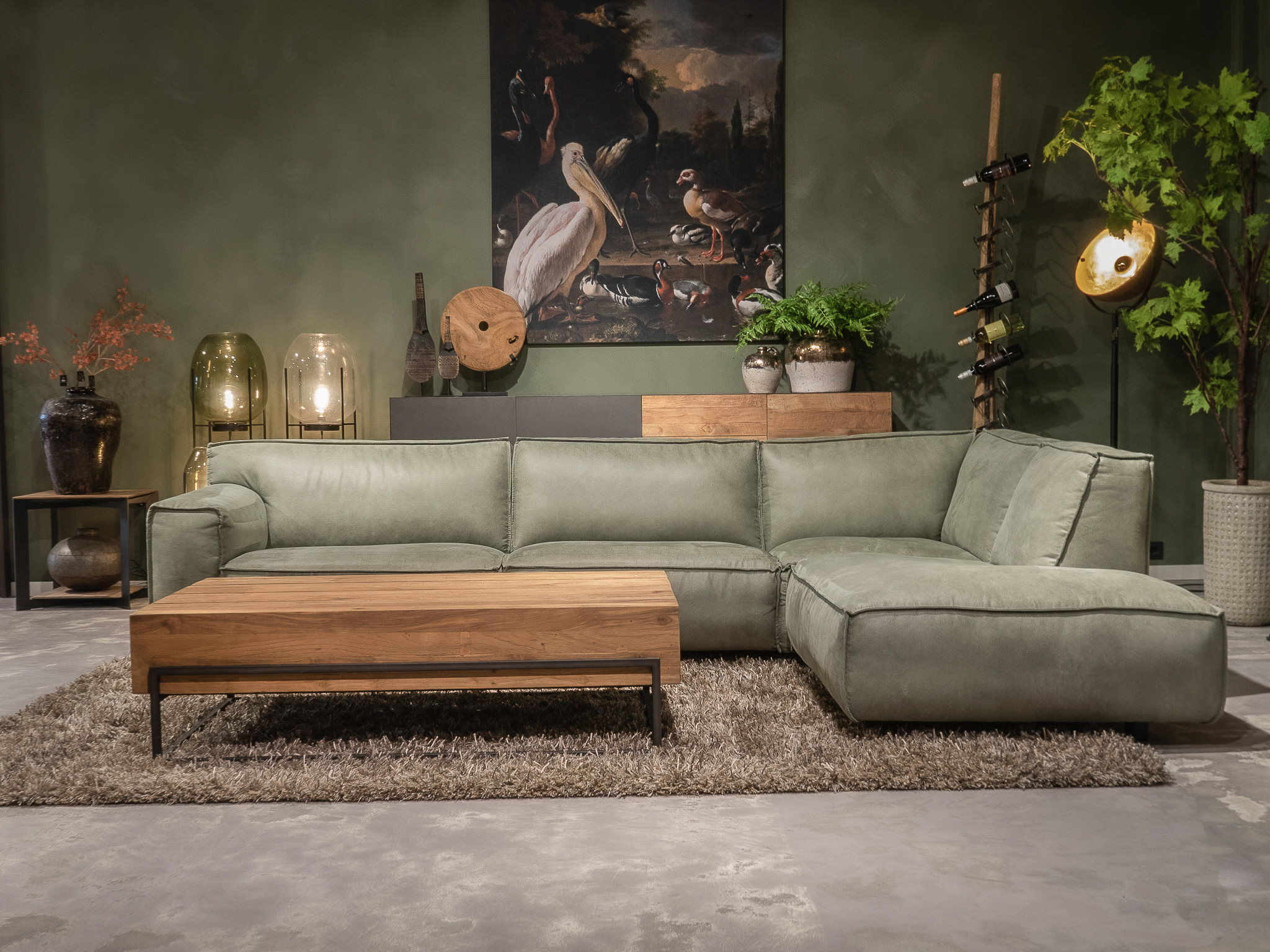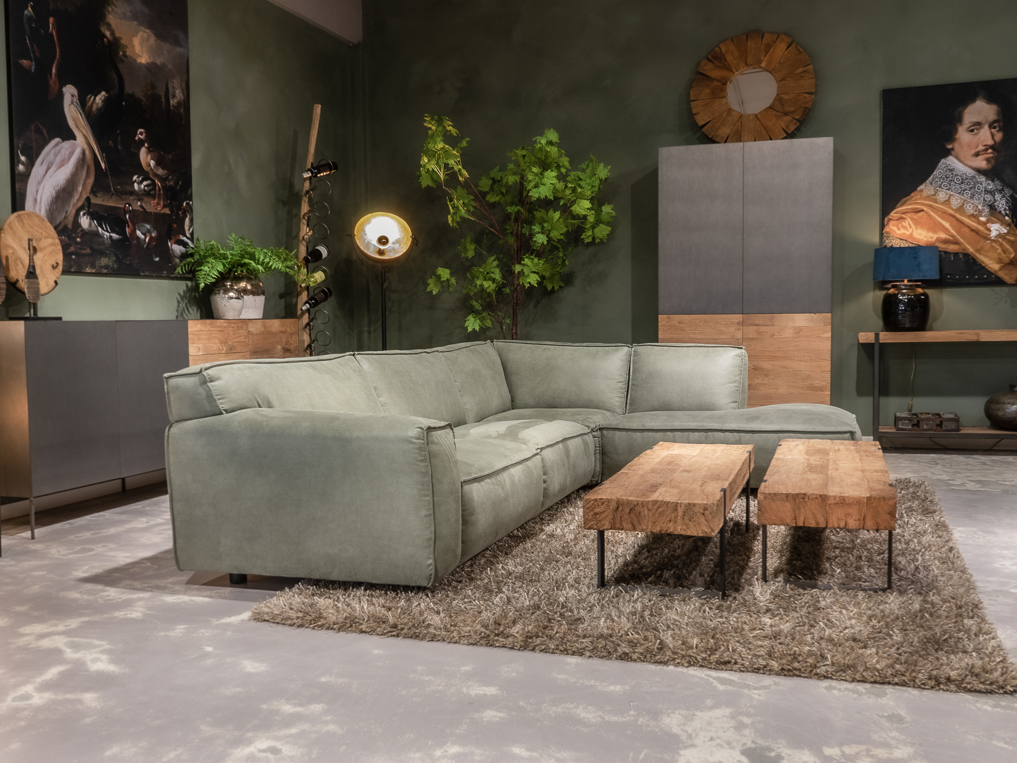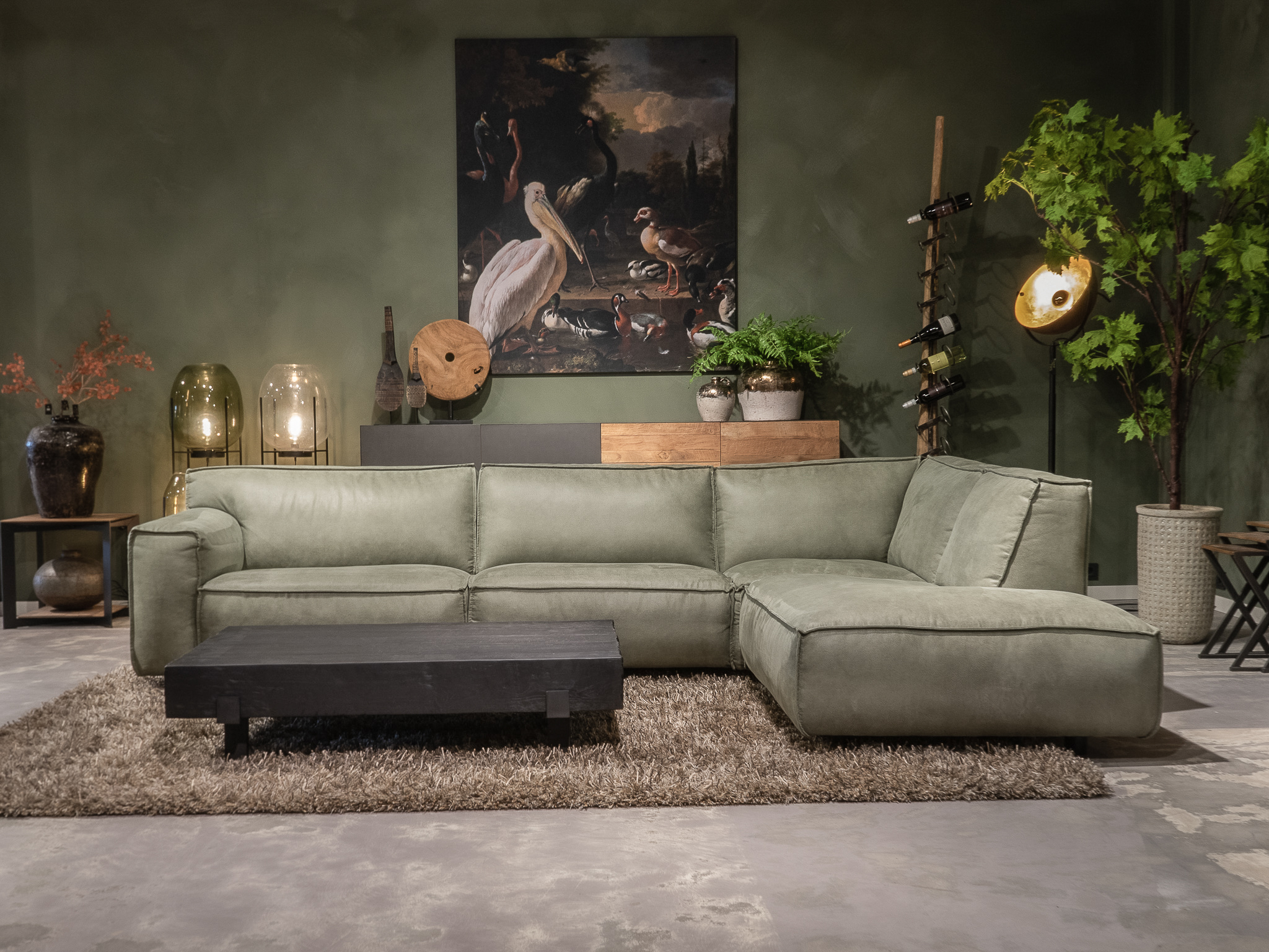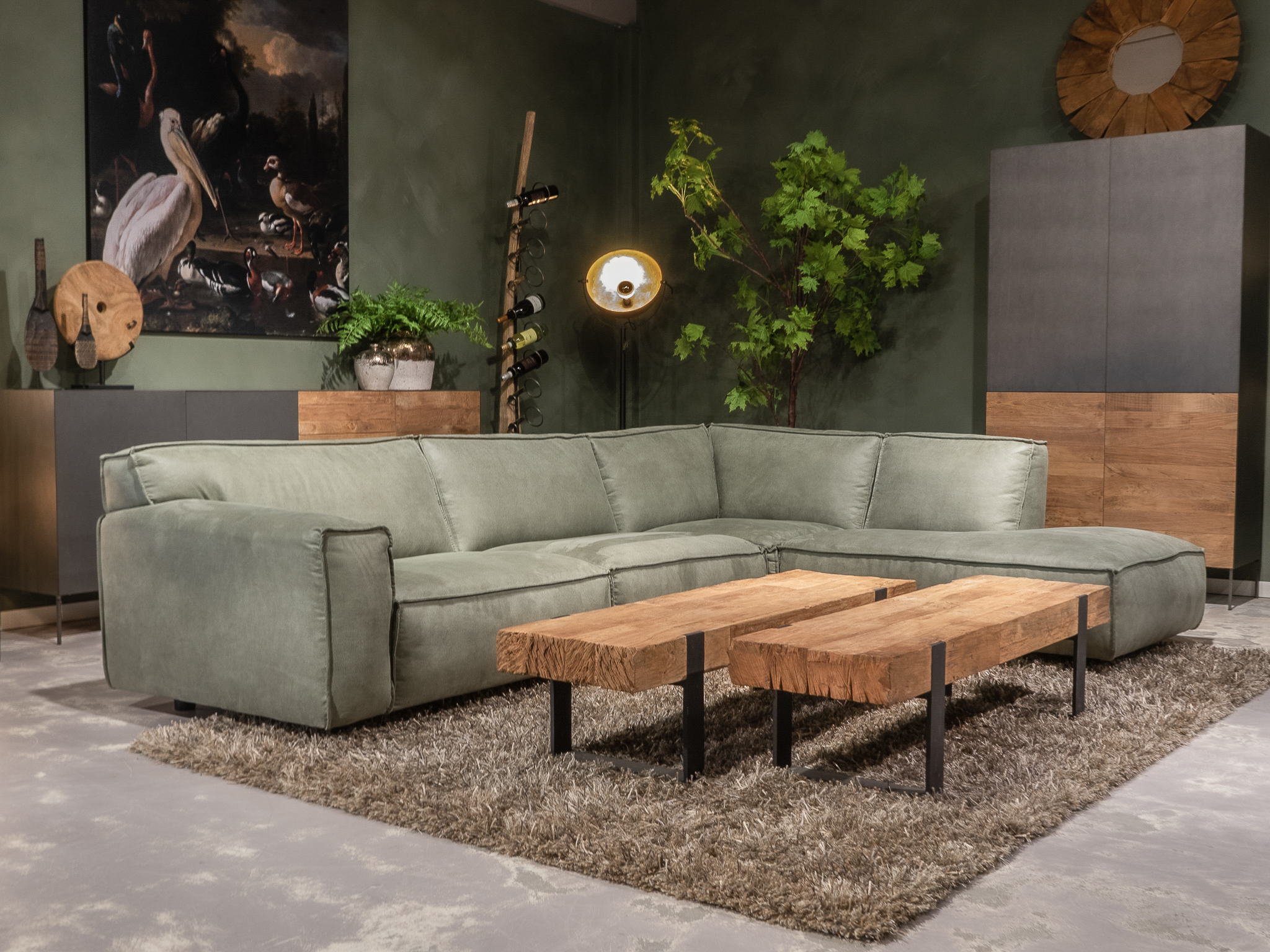 Dit model staat in beide showrooms in als hoekbank in de relax stof kleur turtle.