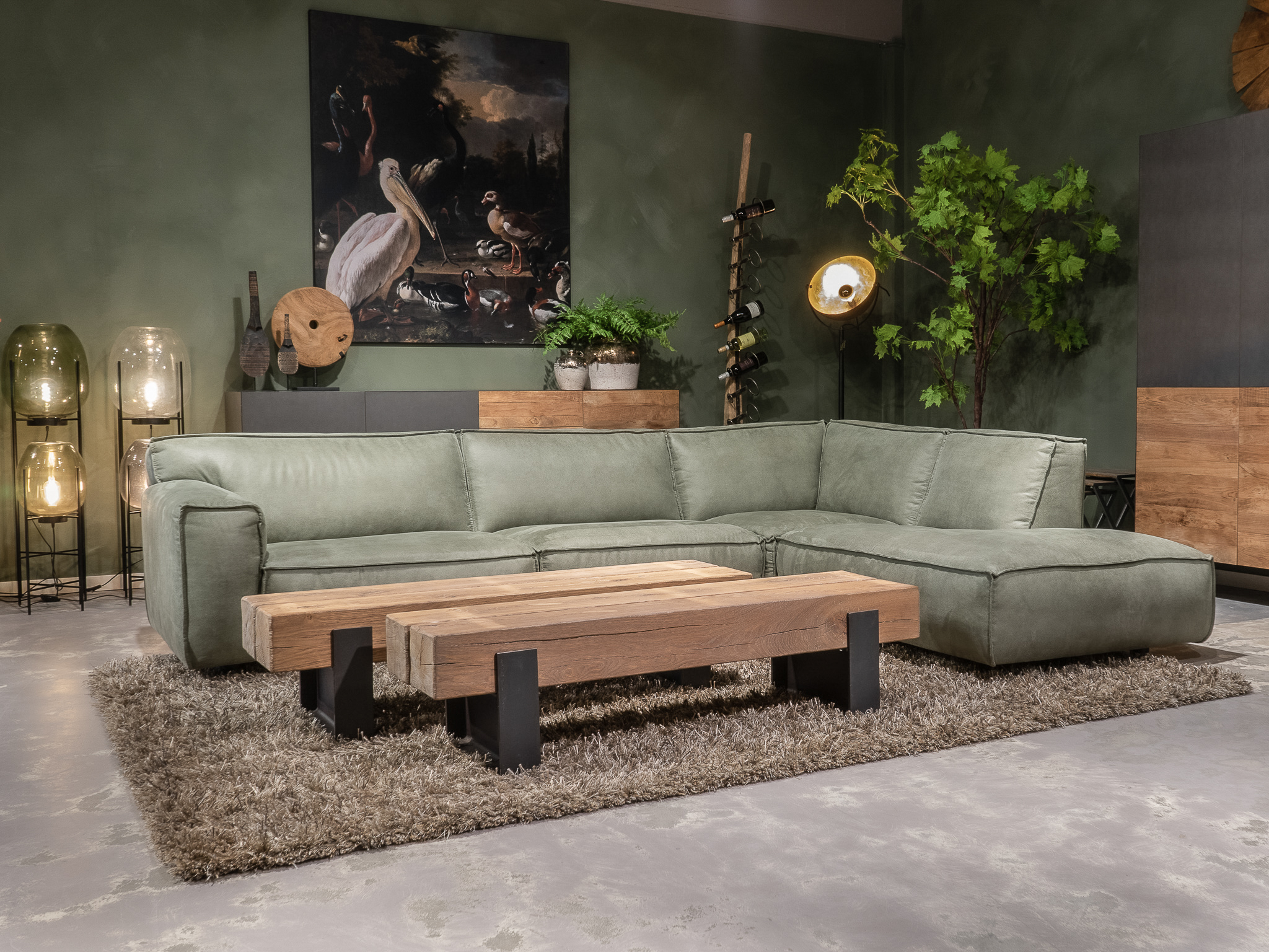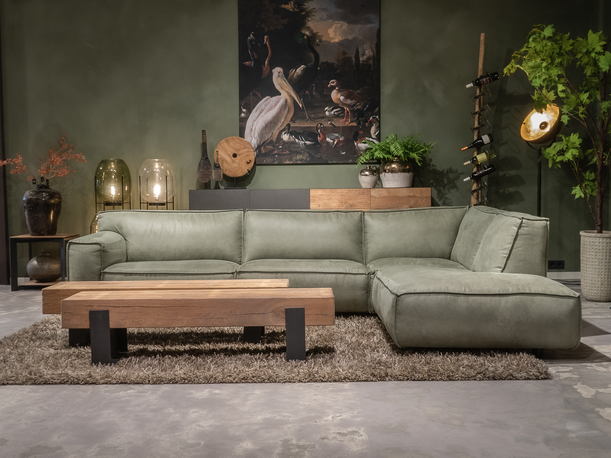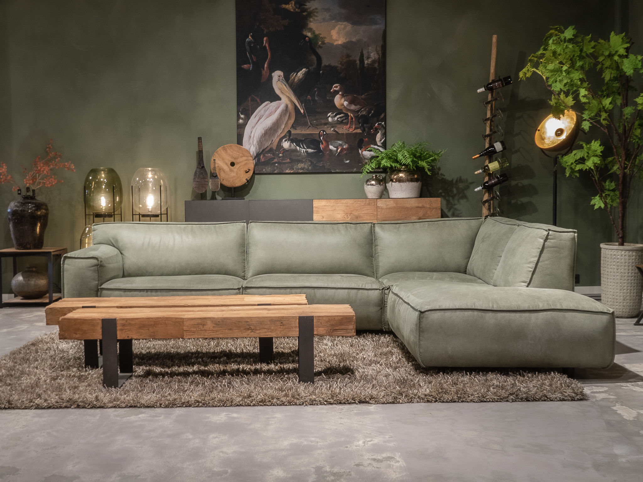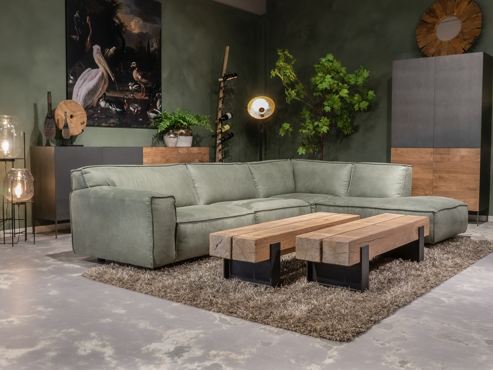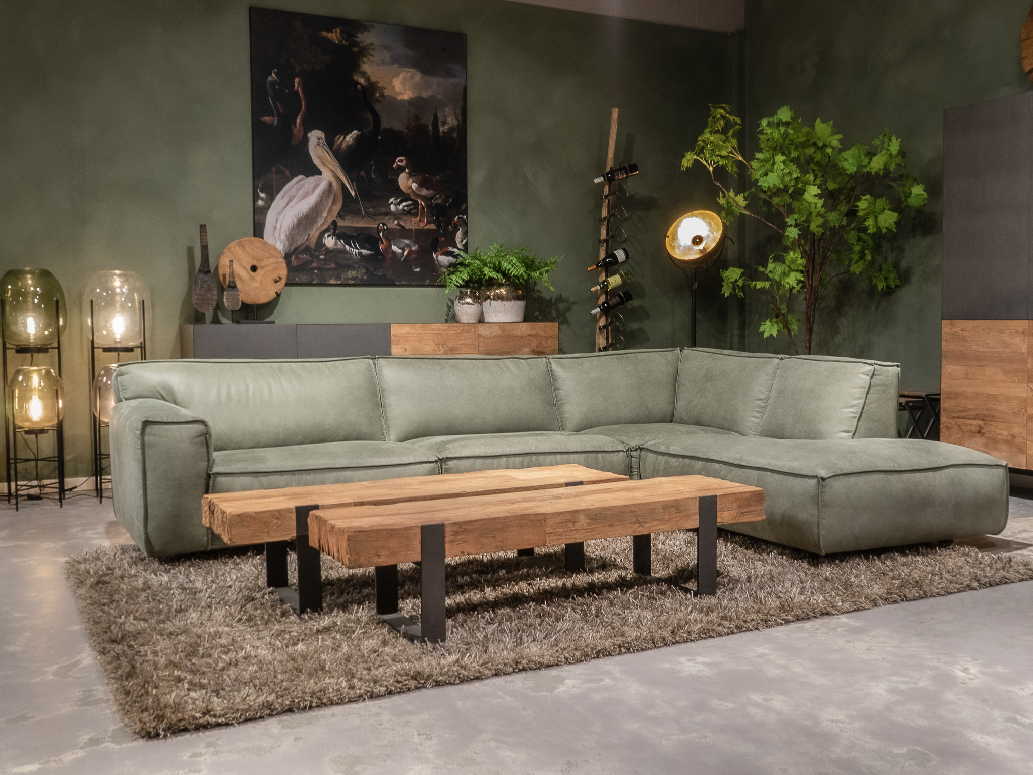 Dit model staat in beide showrooms in als hoekbank in de relax stof kleur turtle.