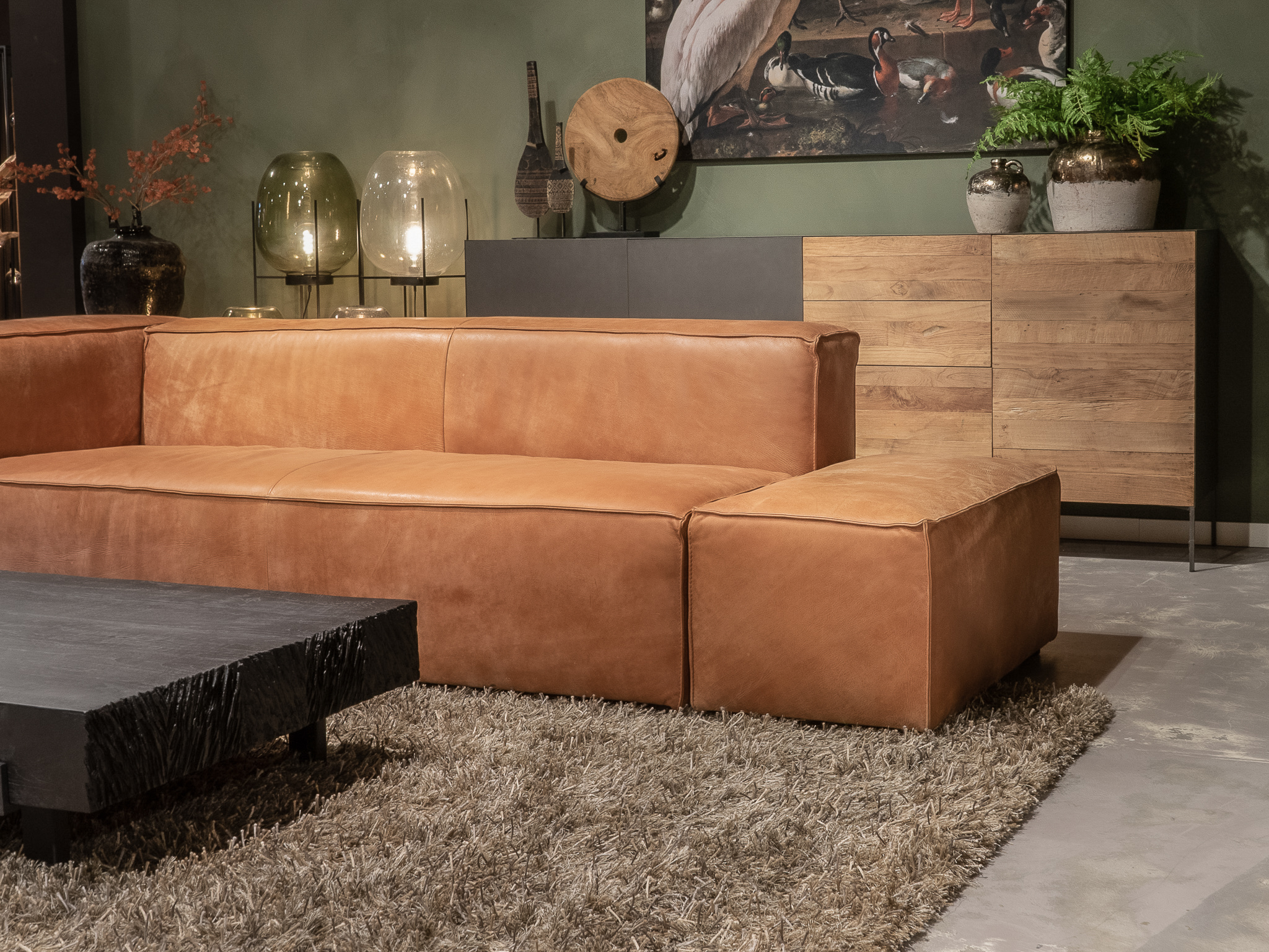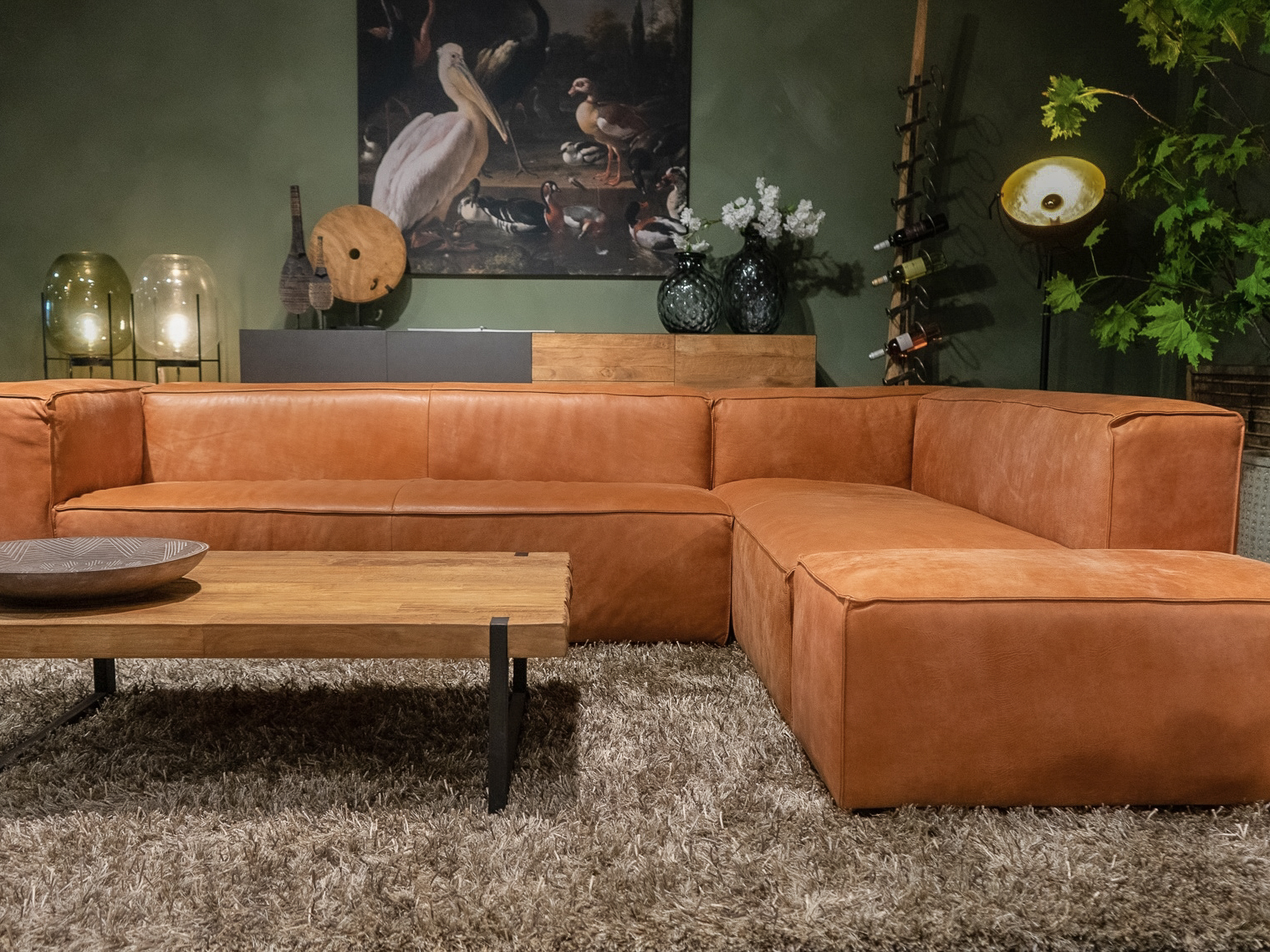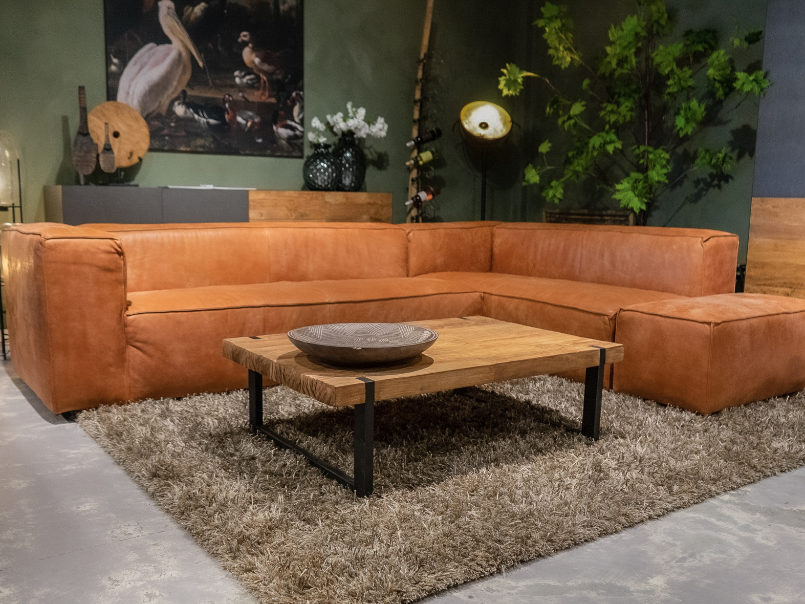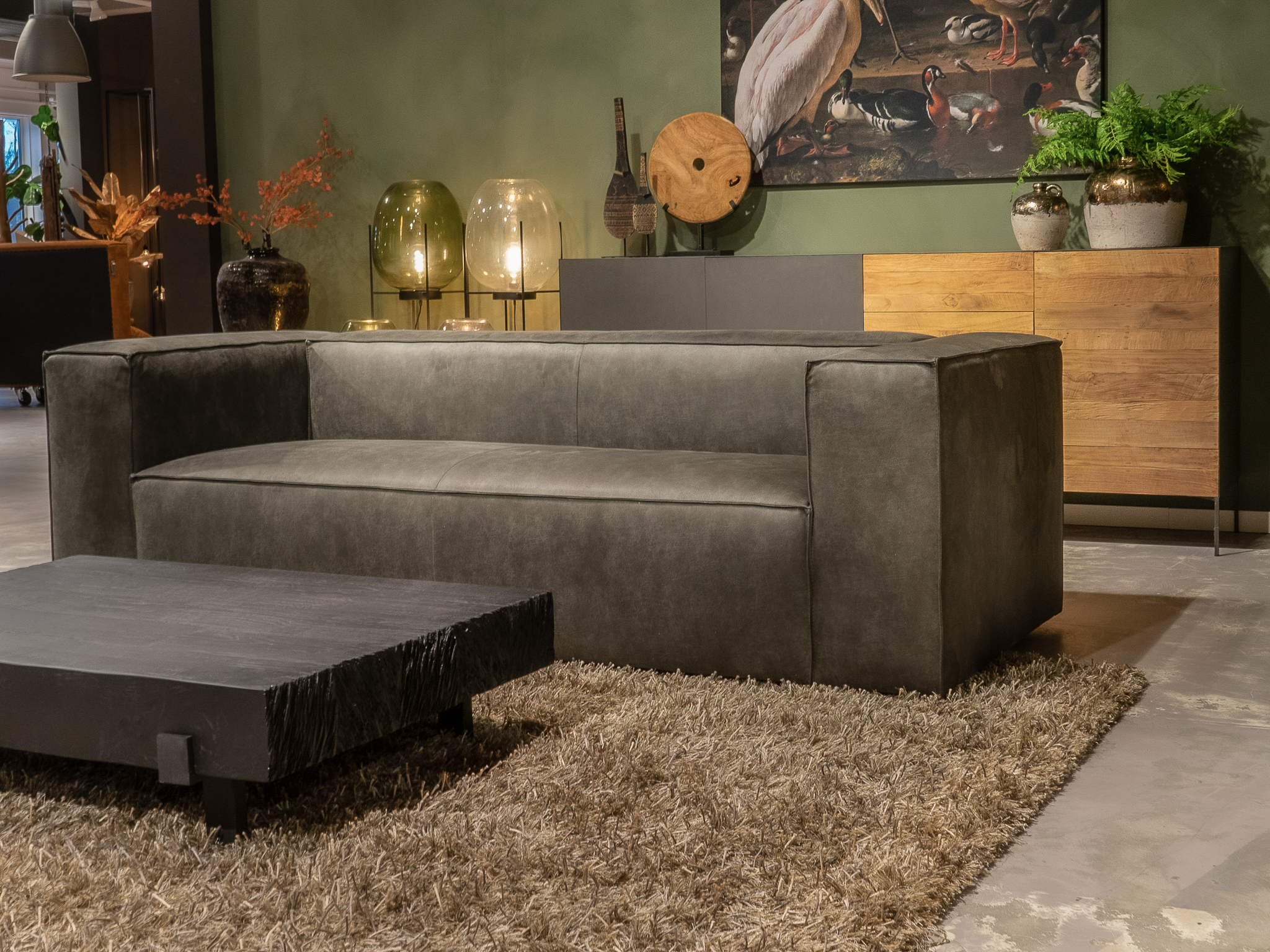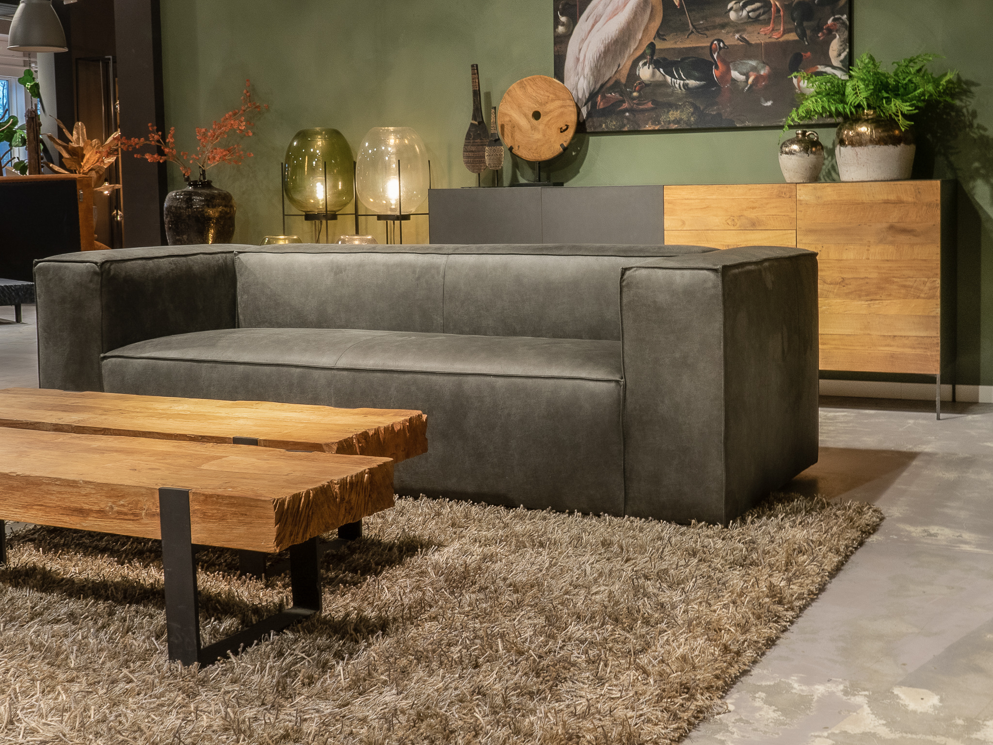 Deze bank staat in onze showroom in Sliedrecht als hoekbank in relax stof, kleur hunter.