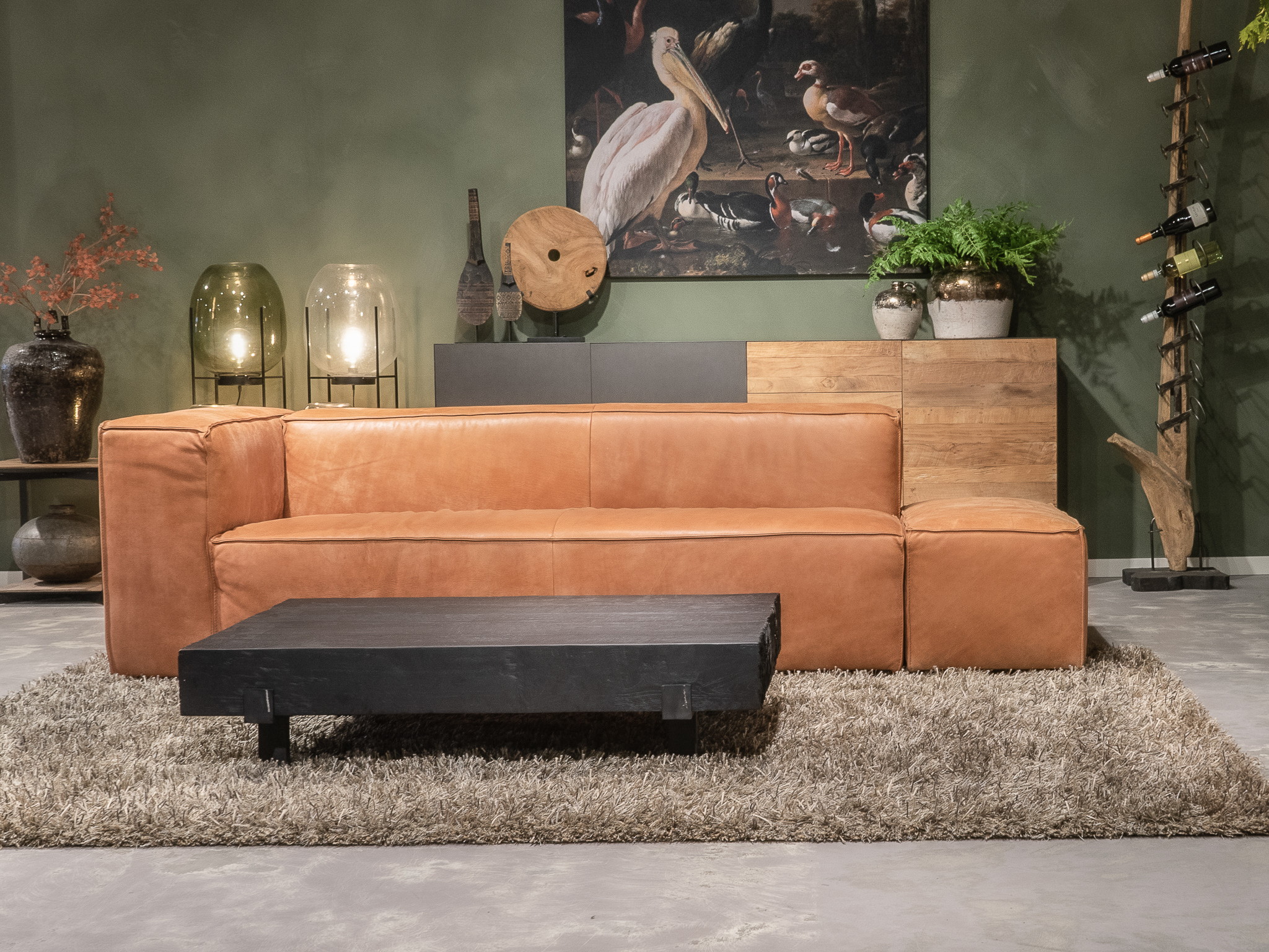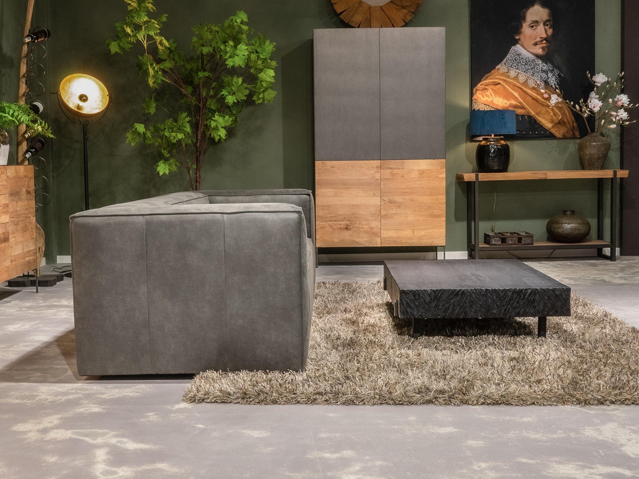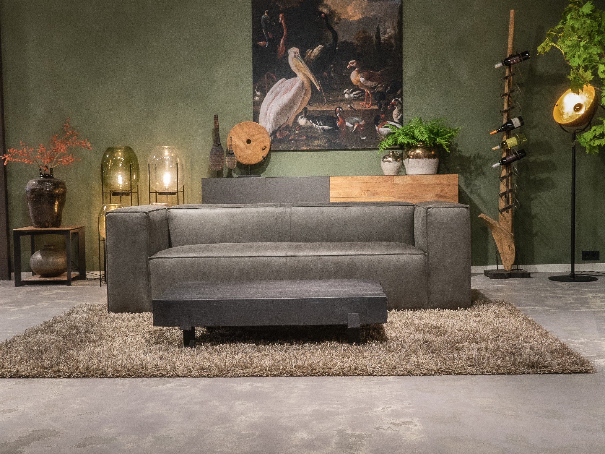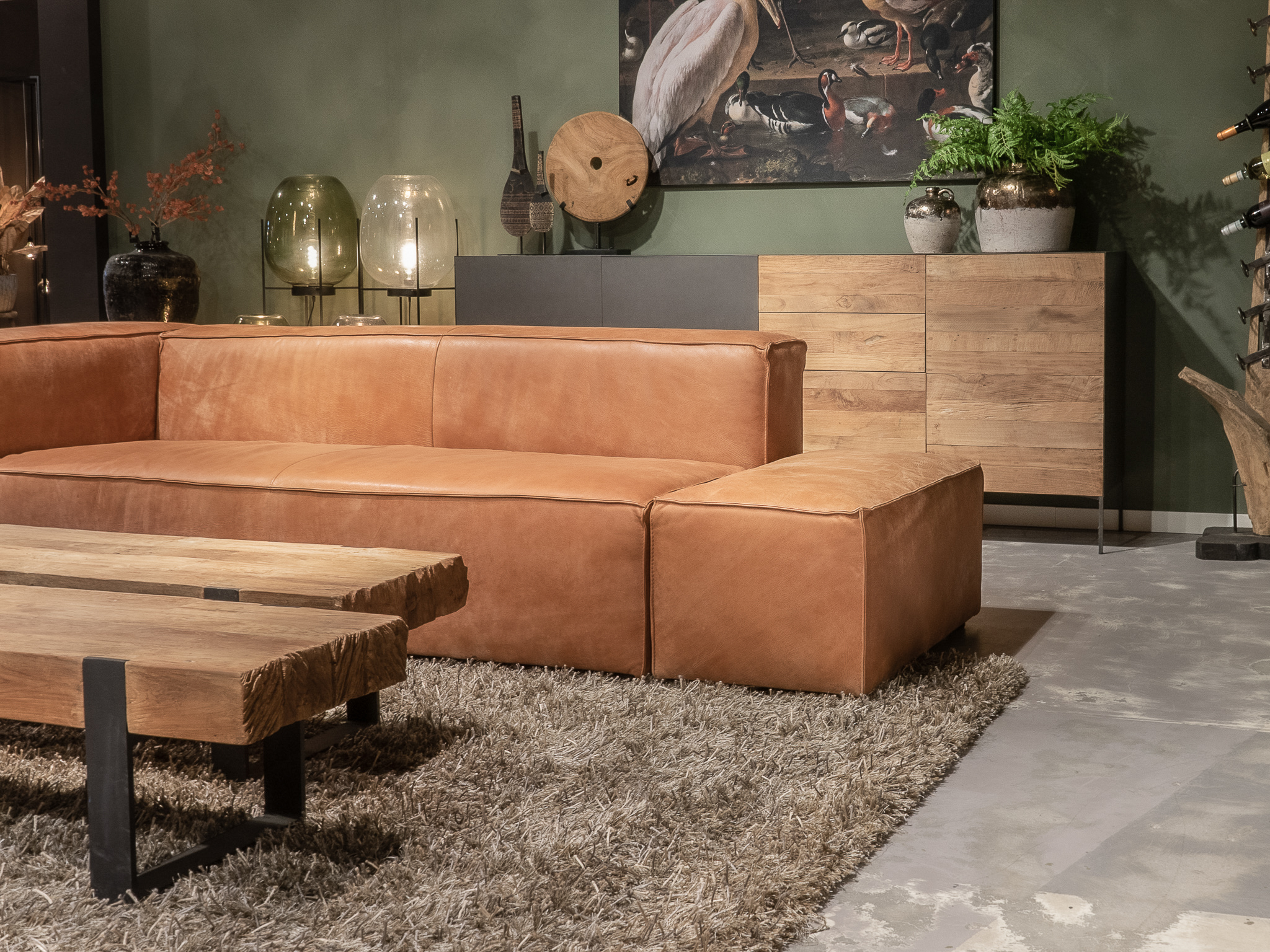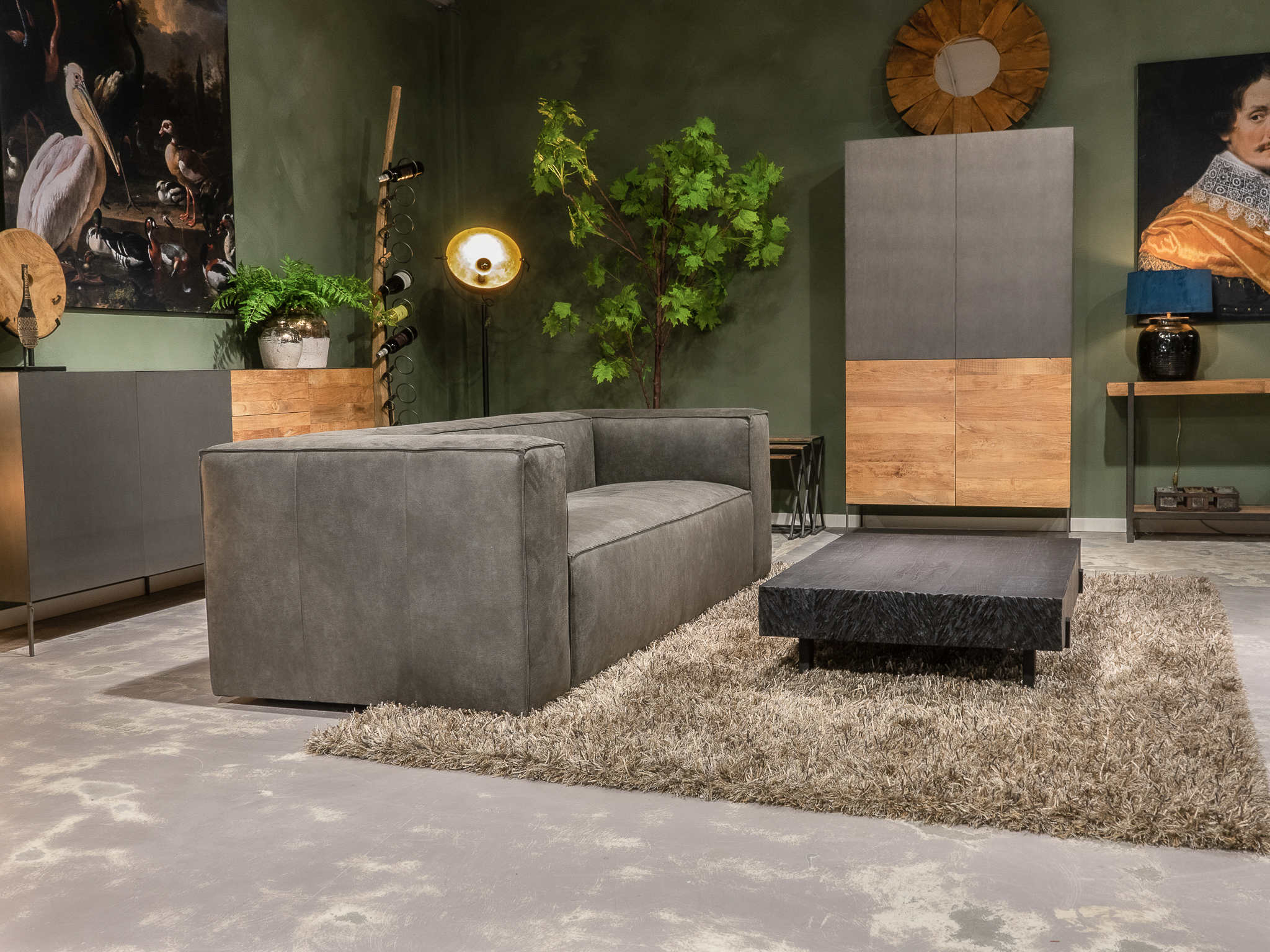 Deze bank staat in onze showroom in Sliedrecht als hoekbank in relax stof, kleur hunter.