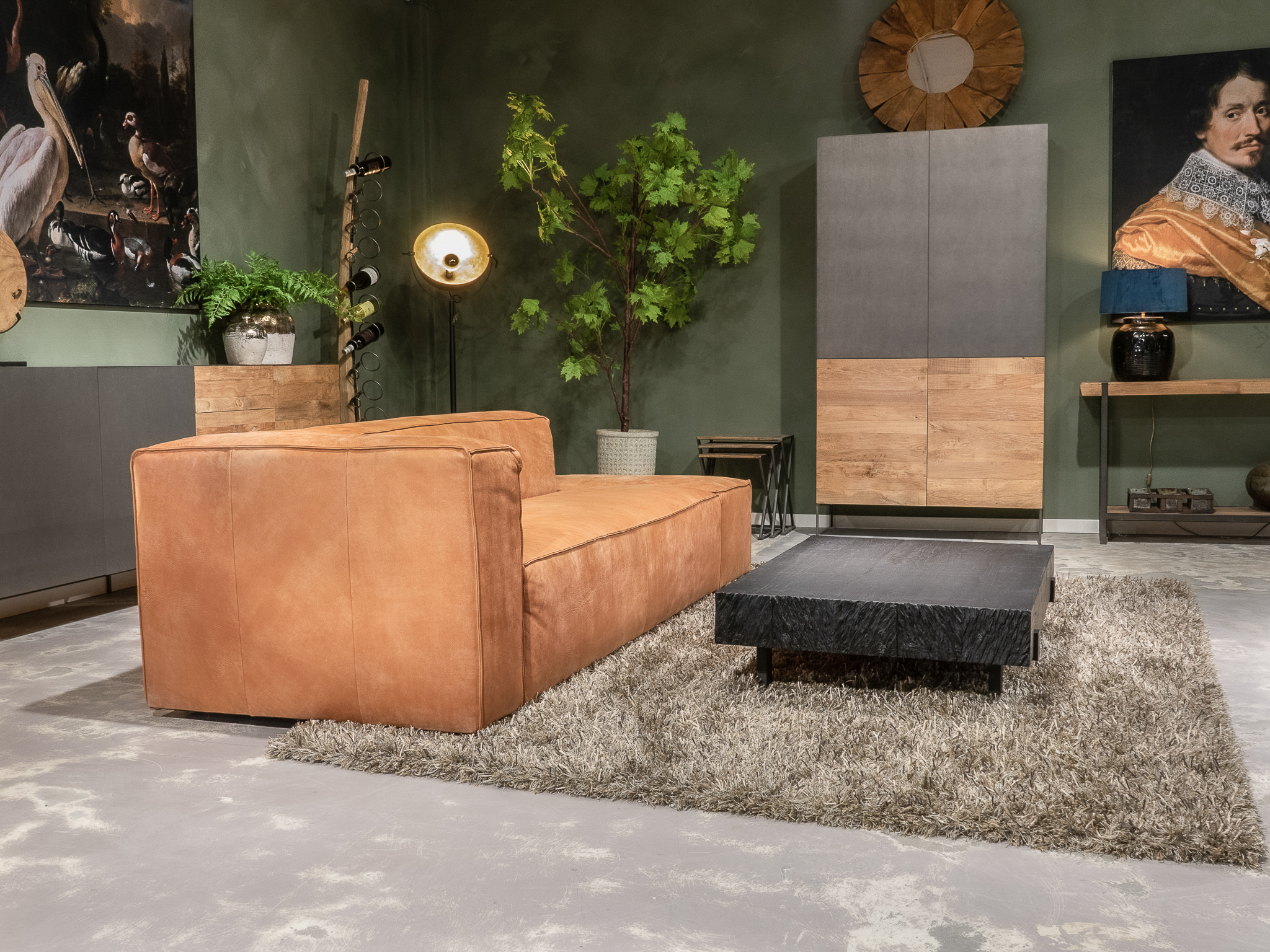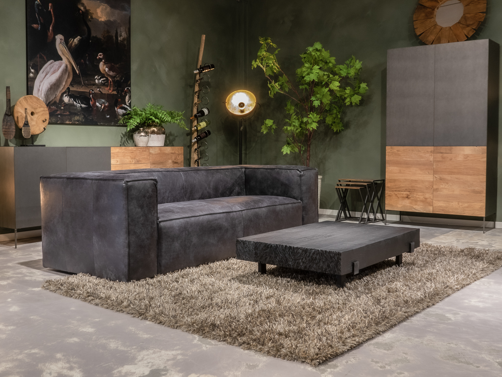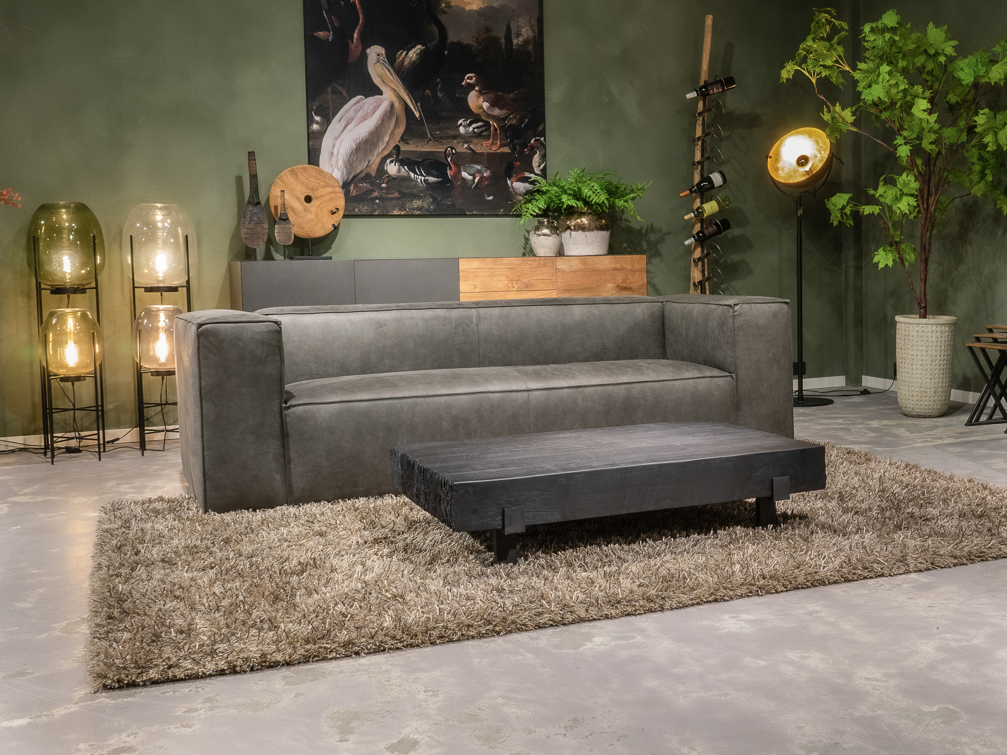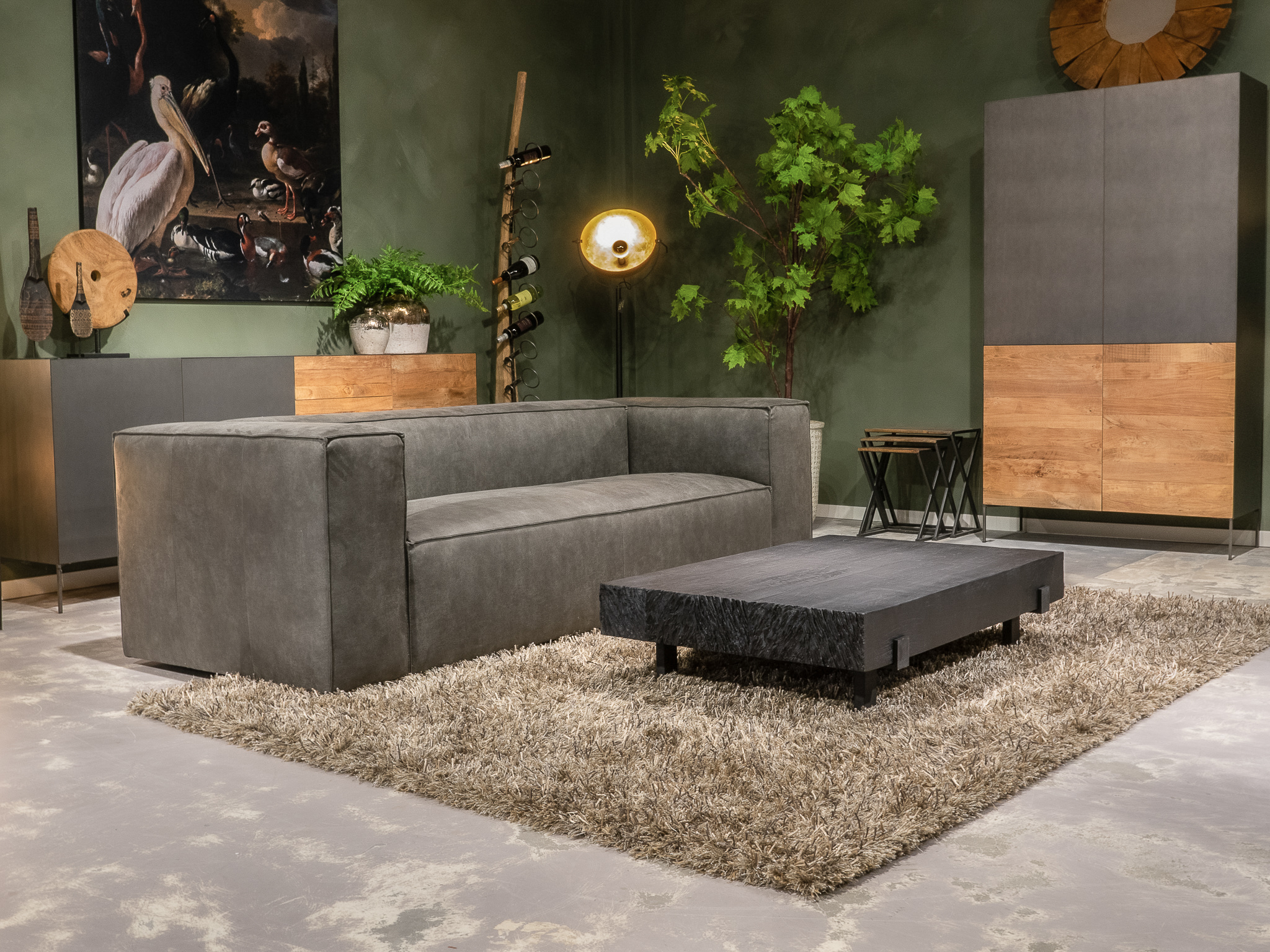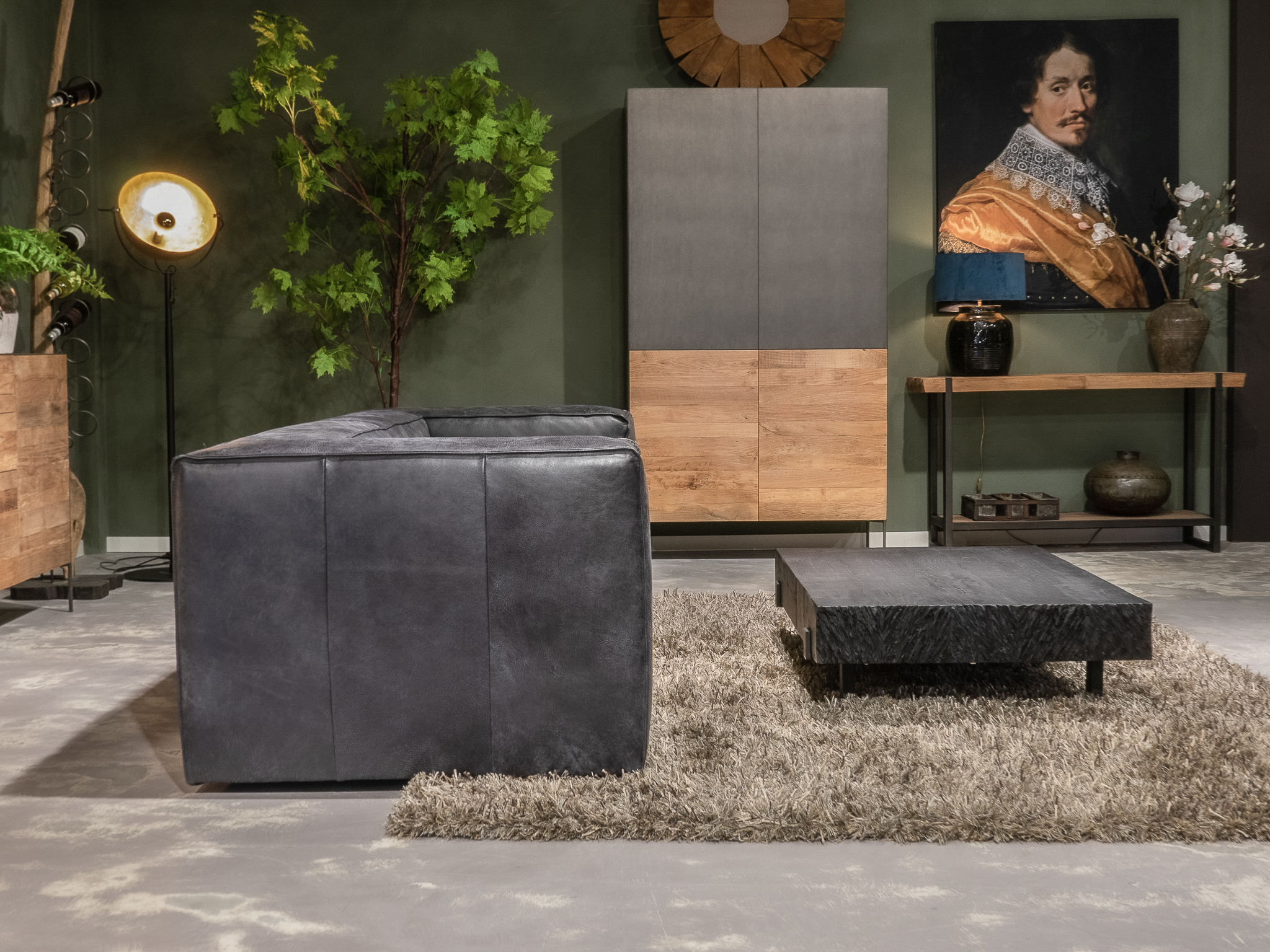 Deze bank staat in onze showroom in Sliedrecht als hoekbank in relax stof, kleur hunter.