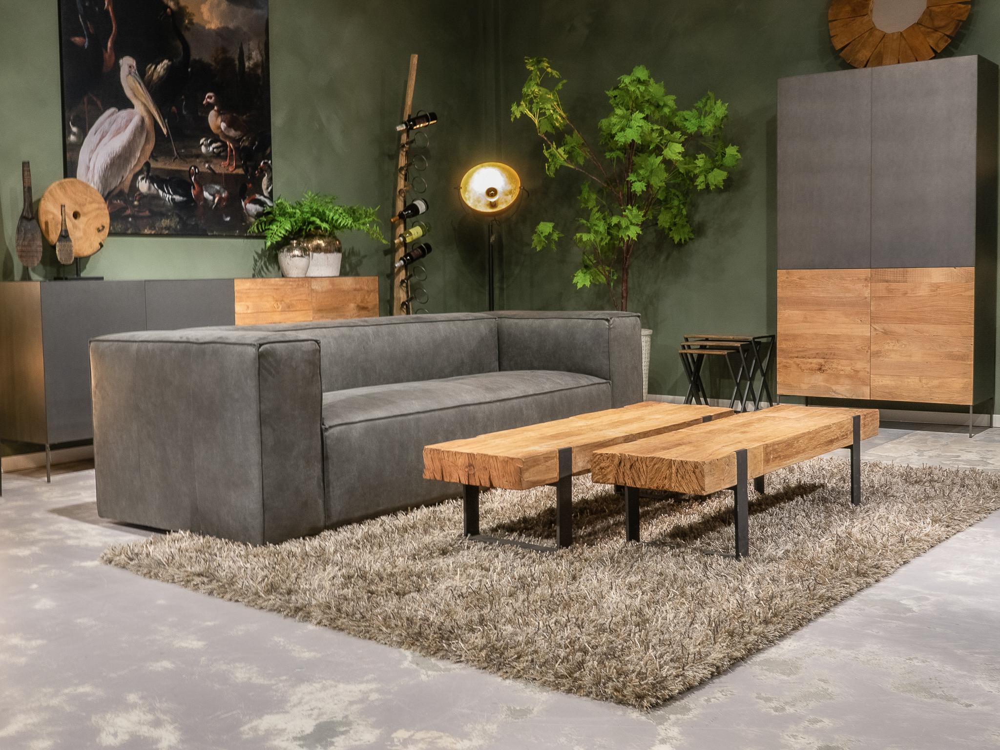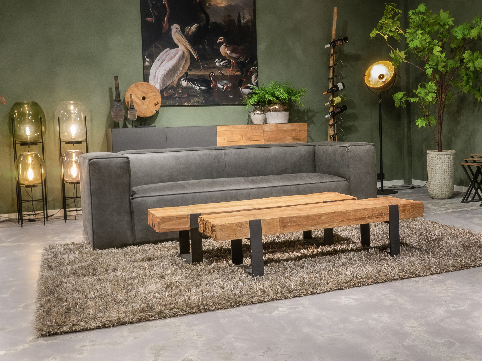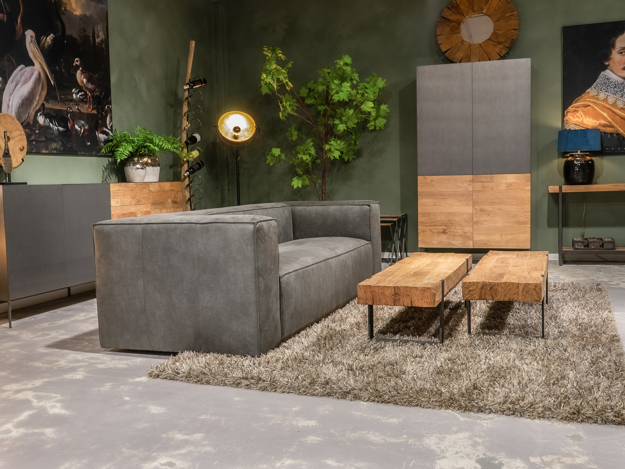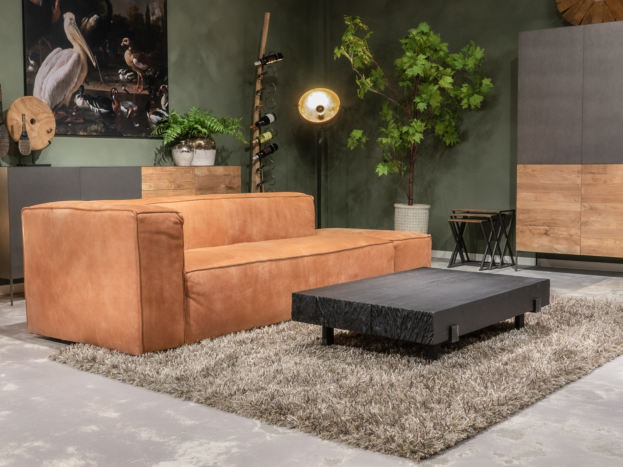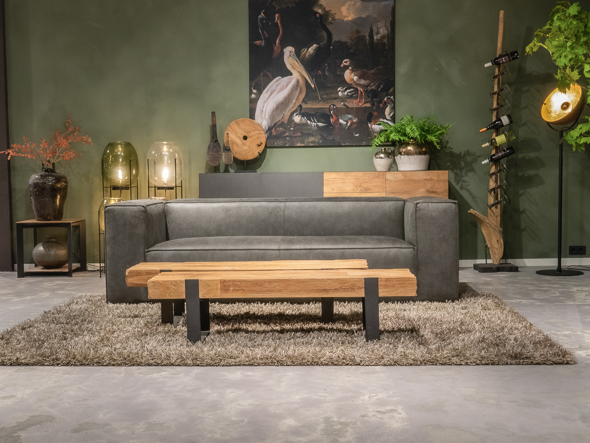 Deze bank staat in onze showroom in Sliedrecht als hoekbank in relax stof, kleur hunter.