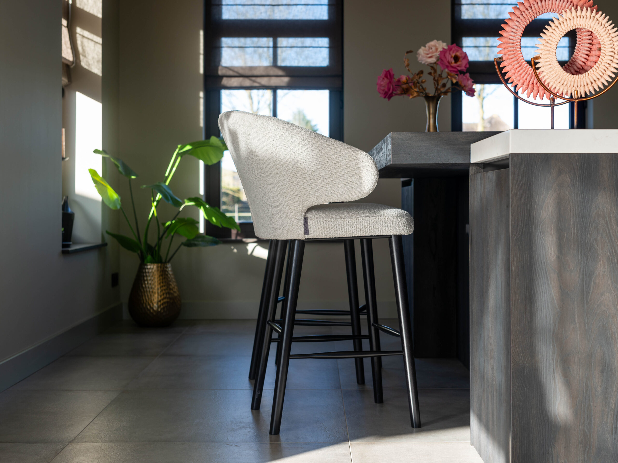 Luxe barkruk Sabana met zachte details. Doorgaans is deze elegante barkruk direct uit voorraad leverbaar in 2 kleuren velours (khaki en stone) en één in boucle stof (wit). Deze barkruk kunt u herkennen aan meerdere fraaie details. Zoals bijvoorbeeld de ergonomische rug en ideale zithoogte. Combineer deze krukken met een prachtige bartafel om de setting compleet maken.