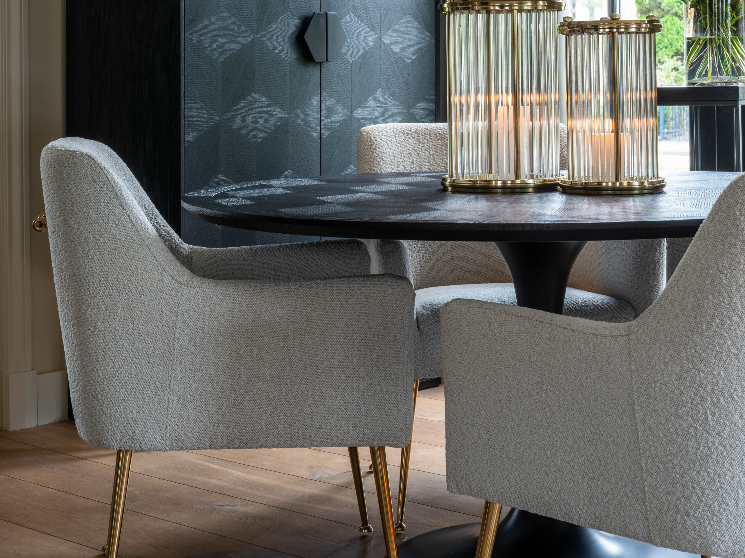 De chique eetkamerstoel Branson van Robuuste Tafels is een opvallende toevoeging aan uw interieur! Deze eetkamerstoel is verkrijgbaar in 4 kleuren velours stof: croco black, green, stone & bouclé white. De stoel nodigt echt uit om er in te gaan zitten! De ranke poten van deze stoel zijn gemaakt van metaal en zijn in een goudkleur afgewerkt. Tevens heeft deze stoel een handige handgreep op de rugleuning, wat het erg makkelijk maakt om de stoel naar achter te trekken of aan te schuiven.