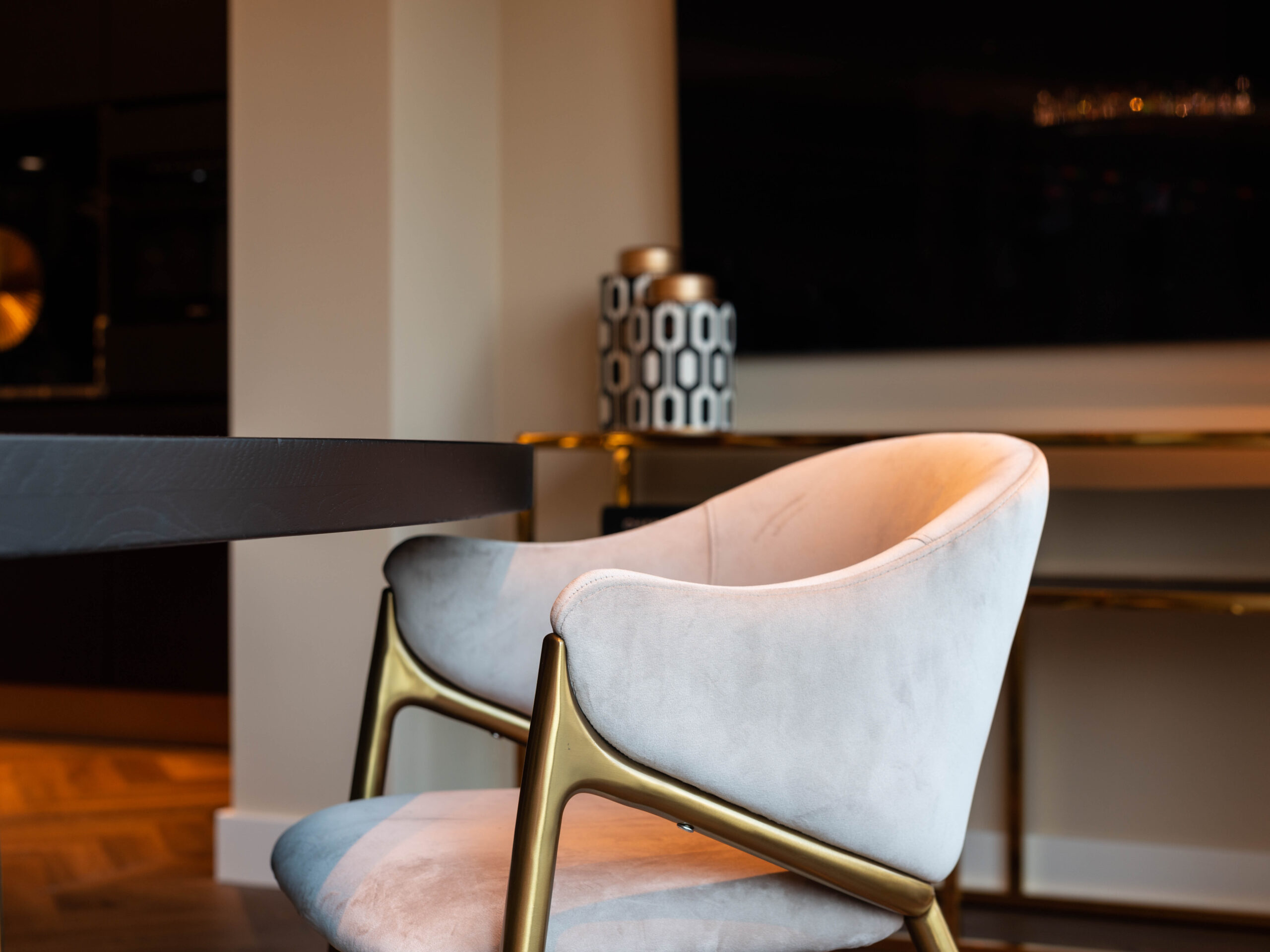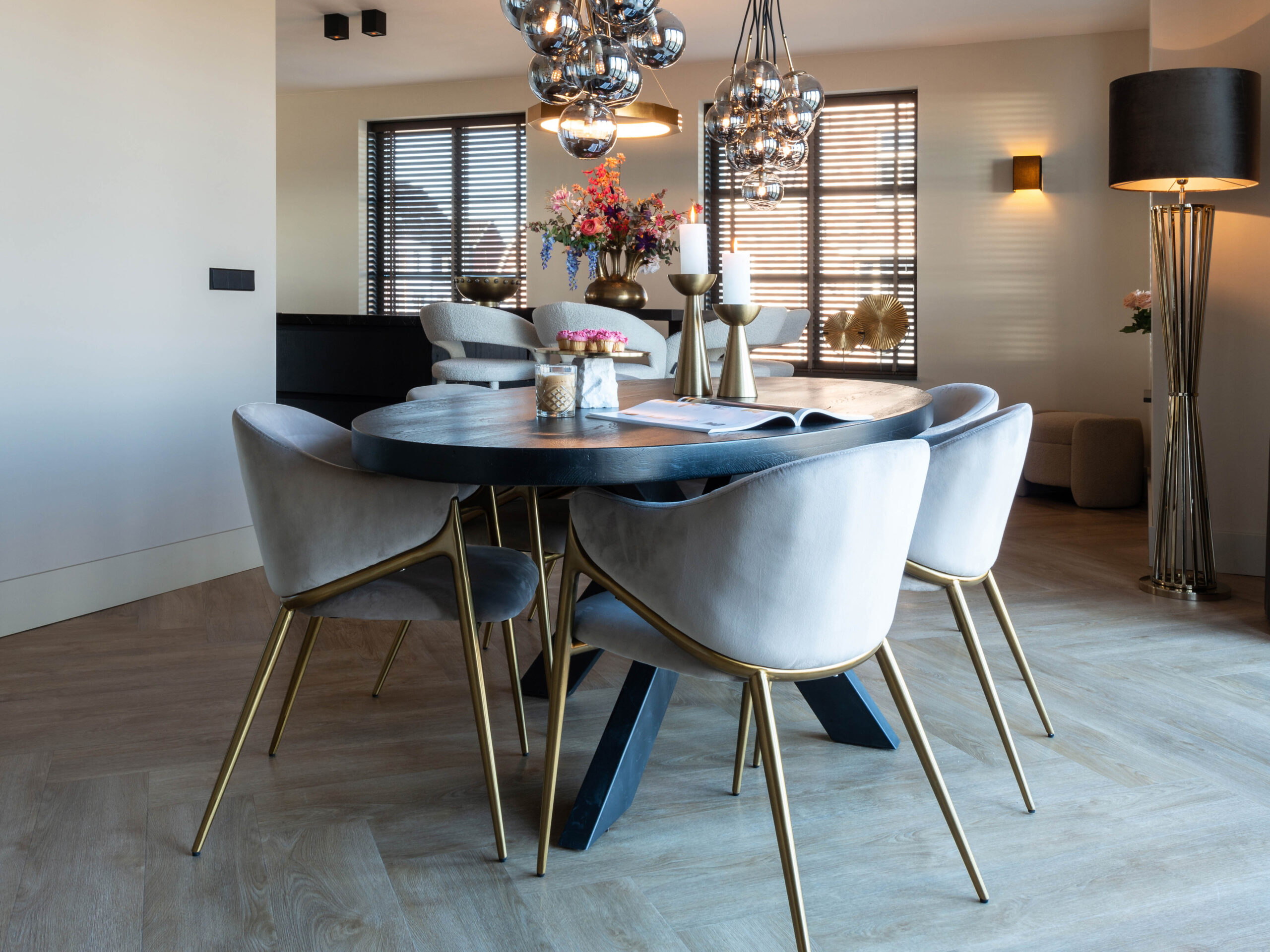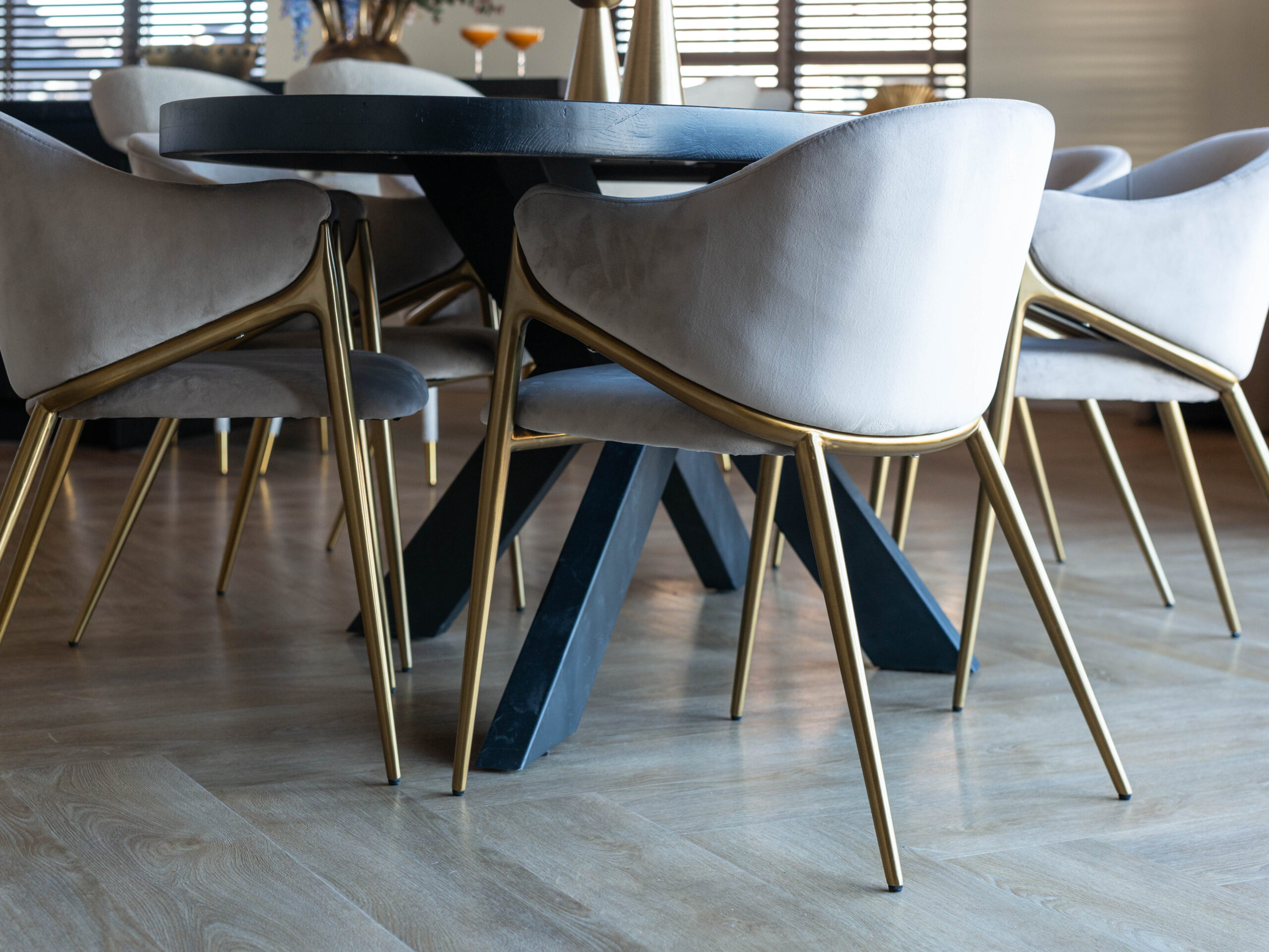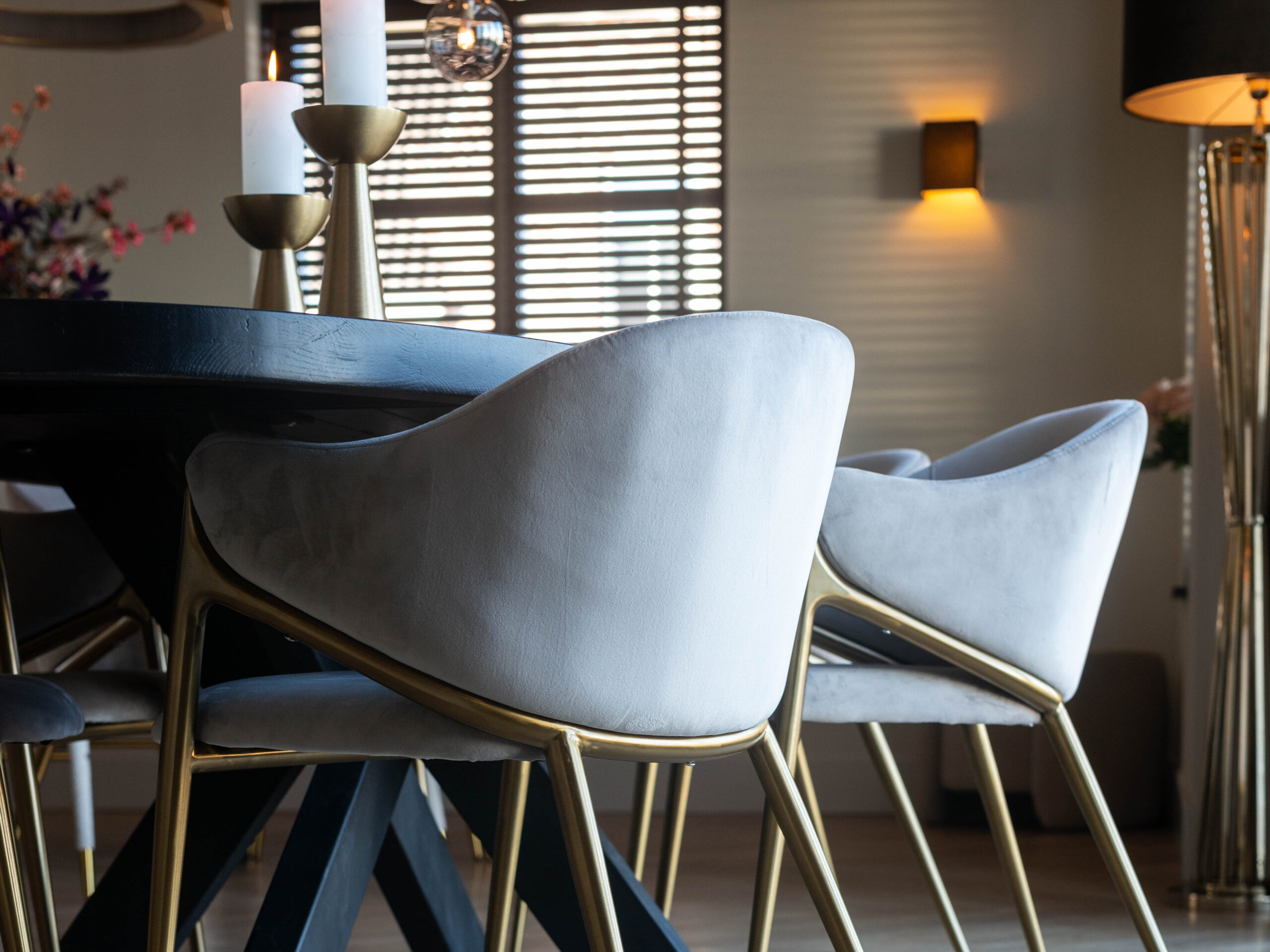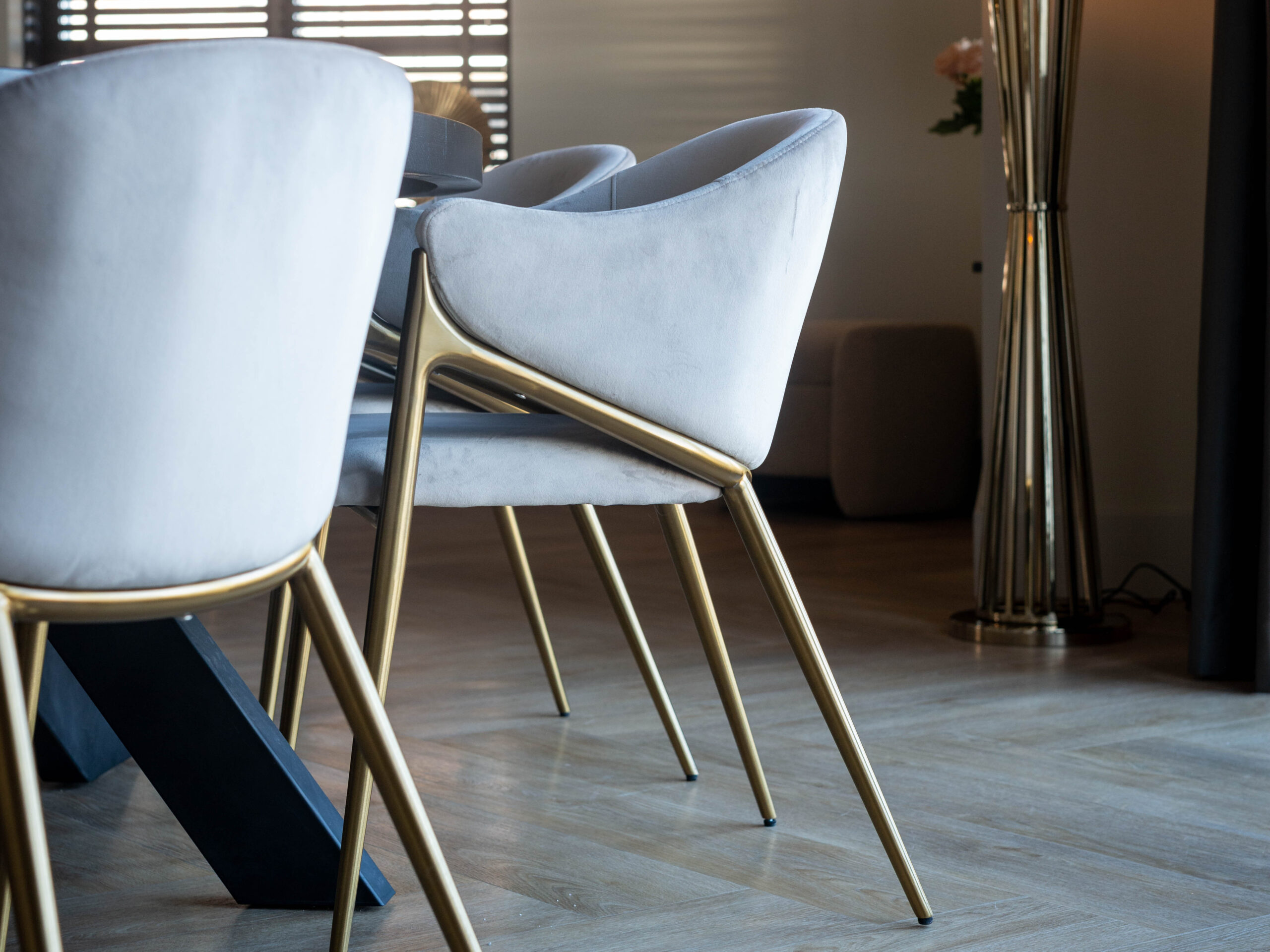 De ergonomisch eetkamerstoel Calama van Robuuste Tafels is een chique toevoeging aan uw interieur! Deze eetkamerstoel is verkrijgbaar in een luxe grijze velvet velours stof. Een groot voordeel hiervan is zijn kwaliteit. Deze stof ziet u vaker terug in bijvoorbeeld de horeca vanwege zijn hoge slijtvastheid. De stoel valt op door zijn unieke design van de gouden poten die overlopen in de armleuningen. Verder loopt de rugleuning rond af in de armleuningen zodat u overal steun heeft en comfortabel zit.