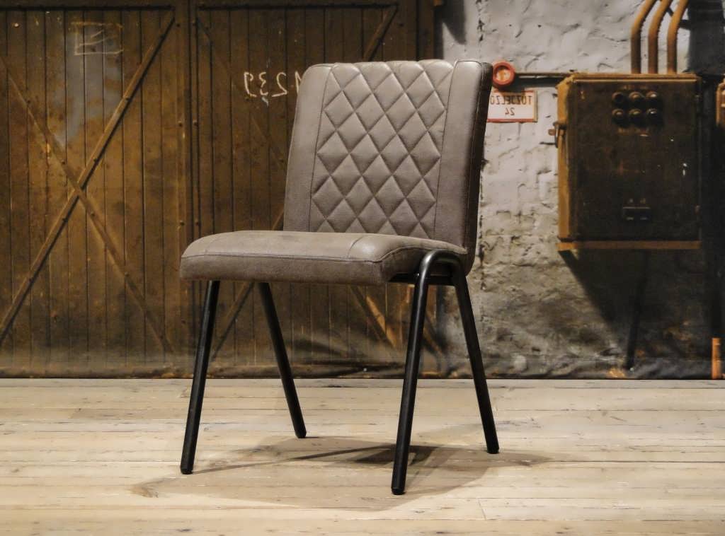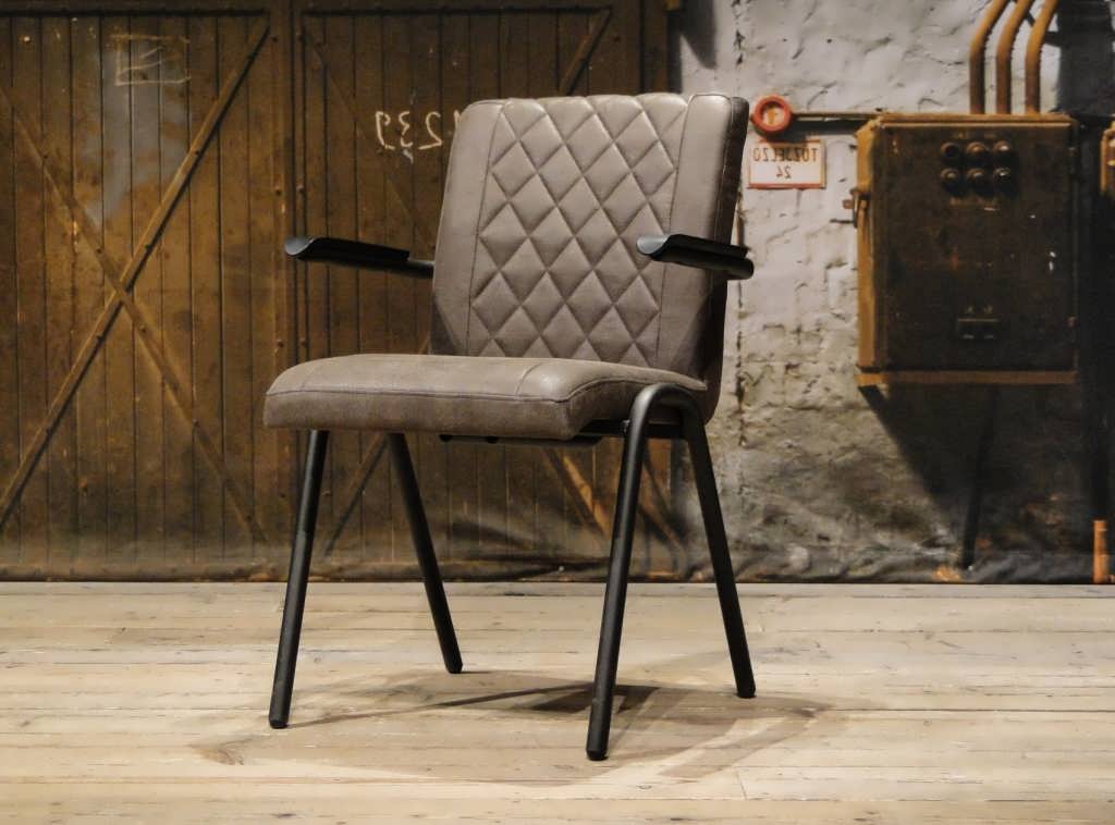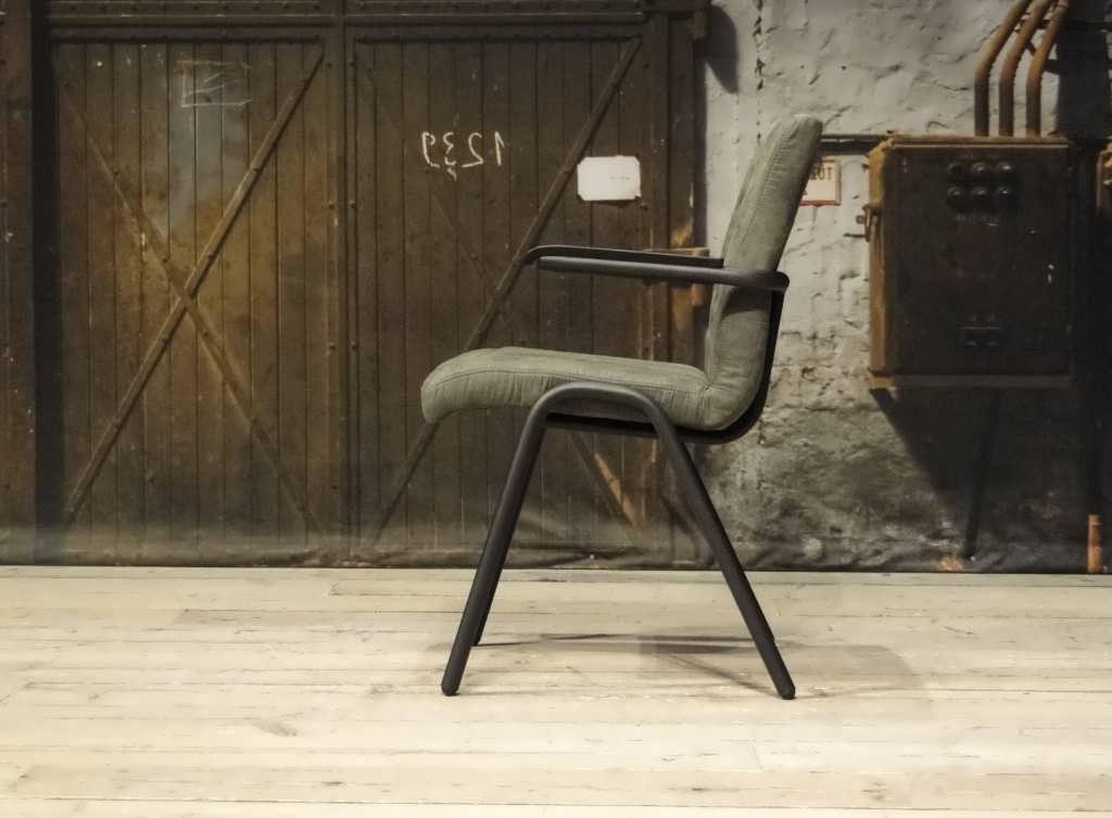 Stoere industriële eetkamerstoel leverbaar in leer en stof. Dit model leveren we in 2 soorten doorgekleurd leer en in 2 soorten stof waarvan 1 exclusief bij ons verkrijgbaar . Zowel in het stof als leer een zeer luxe eetkamerstoel, leverbaar met of zonder armleuning. Het metalen frame is voorzien van een beschermende poedercoat en maakt de stoere industriële uitstraling compleet.