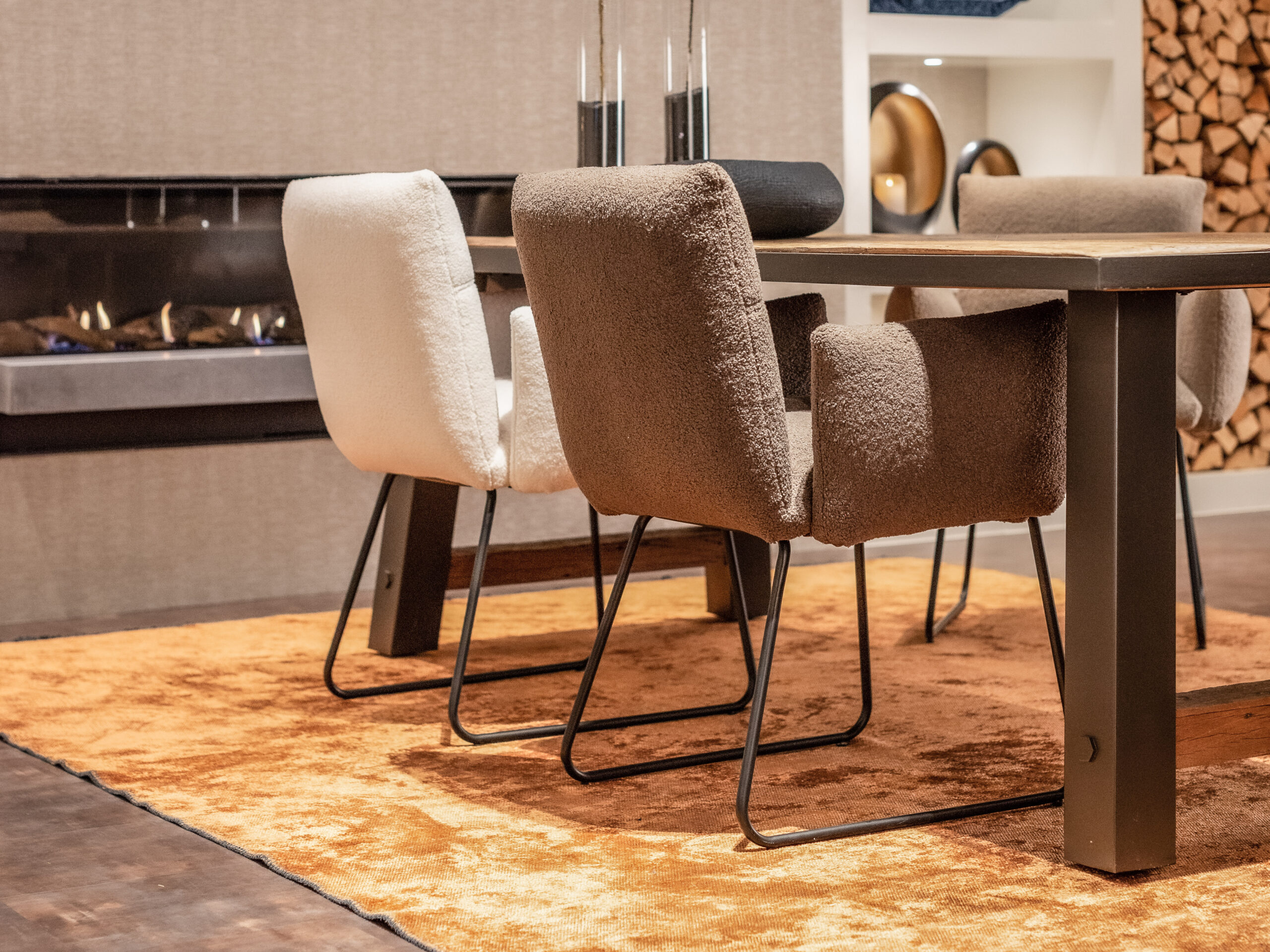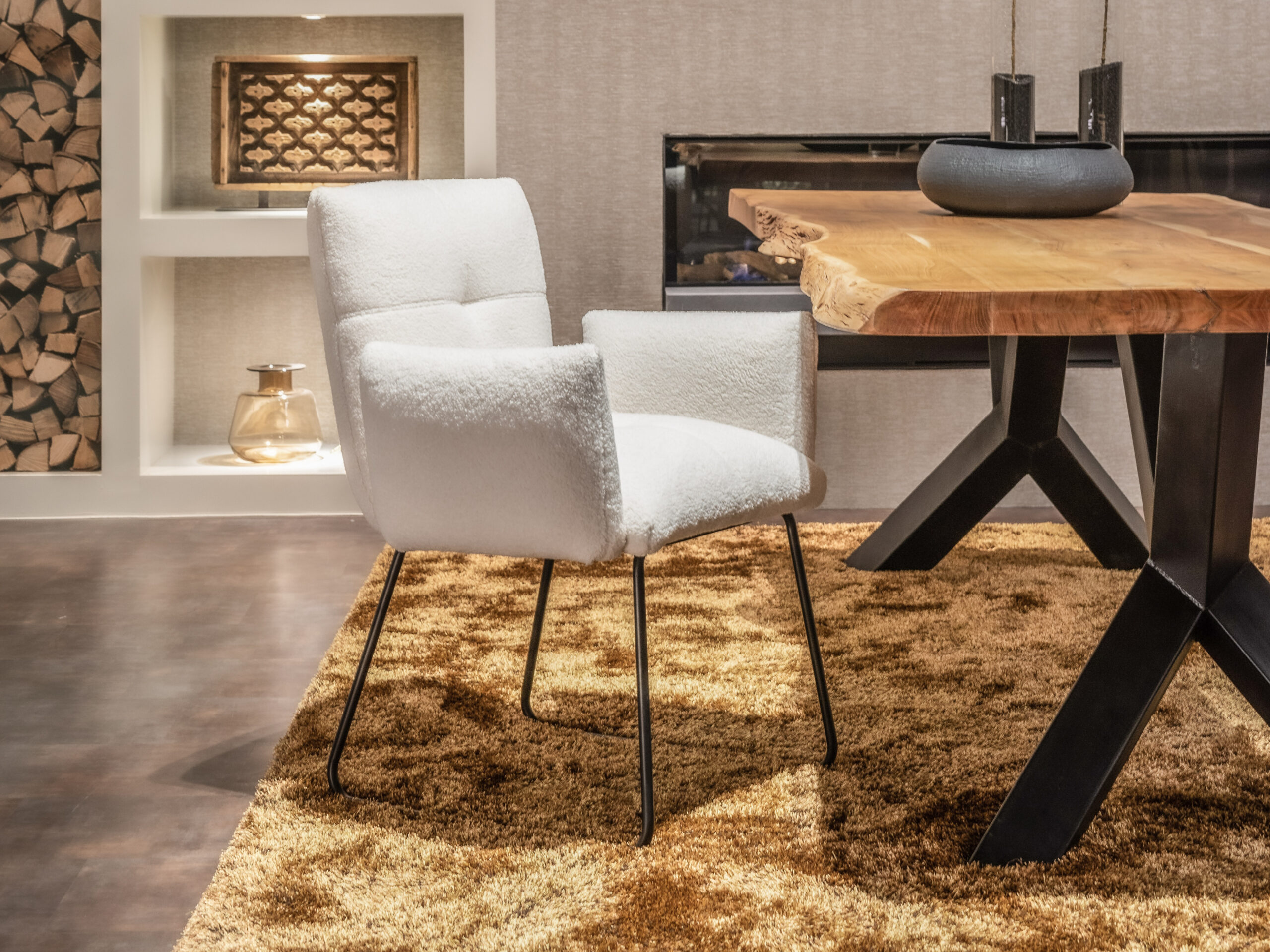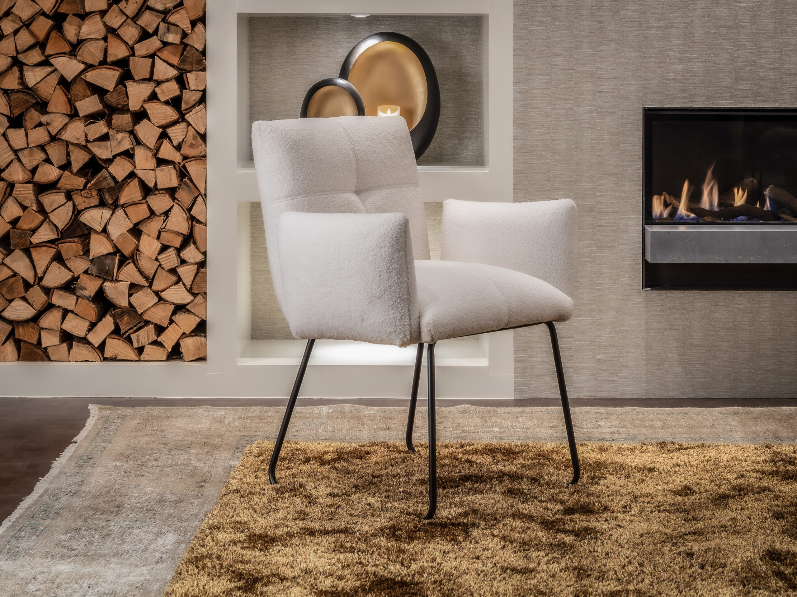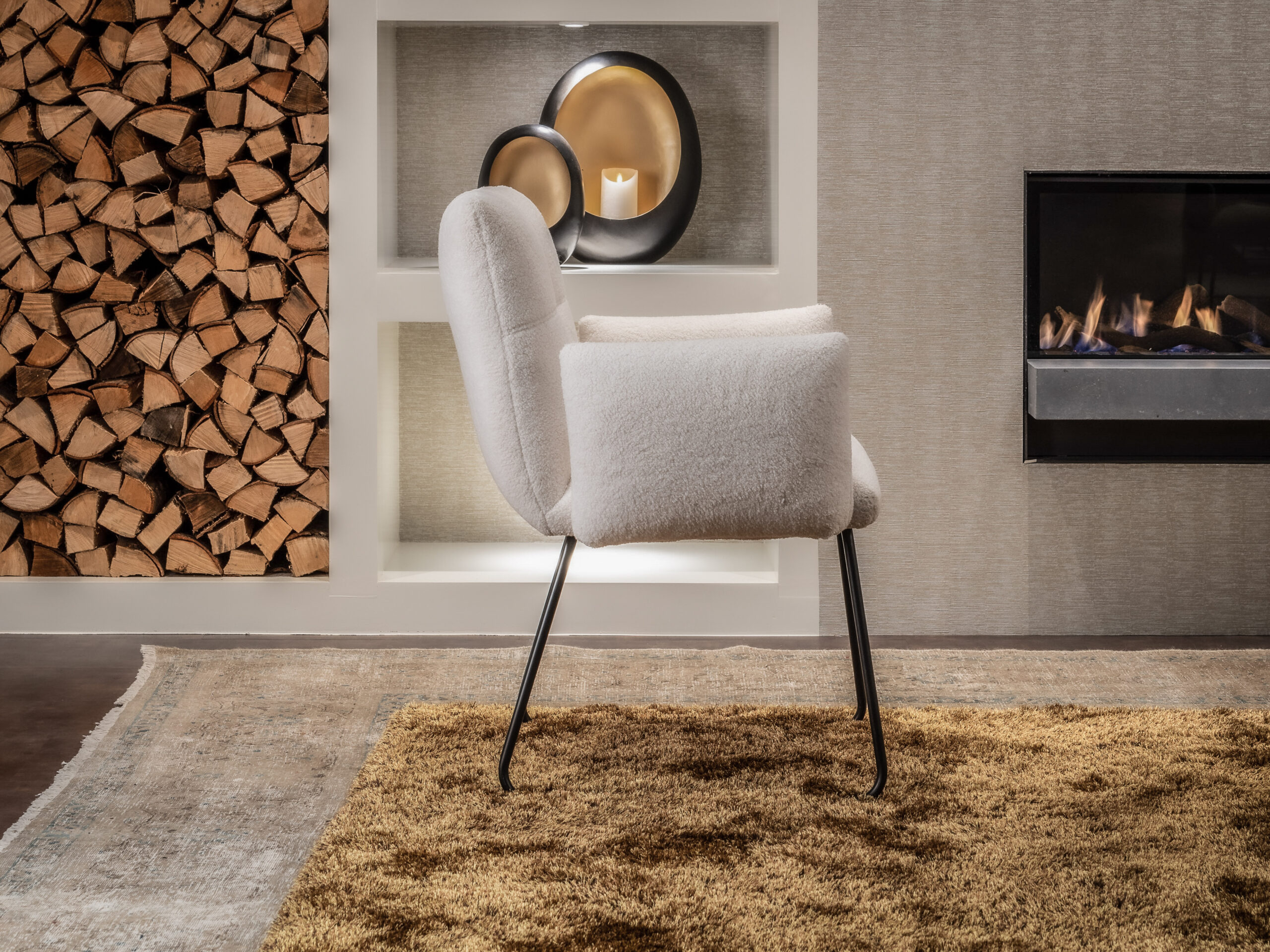 Waanzinnig knuffelbare eetkamerstoel Brampton direct uit voorraad in 3 kleuren teddy stof (wit, lichtbruin & donkerbruin), ook wel bouclé genoemd. Deze zitting van deze elegante eetkamerstoel is zacht, de armleuning is zacht, de rugleuning is zacht en dat in combinatie met de enorm zachte teddy stof maakt dit een ware knuffelbeer!