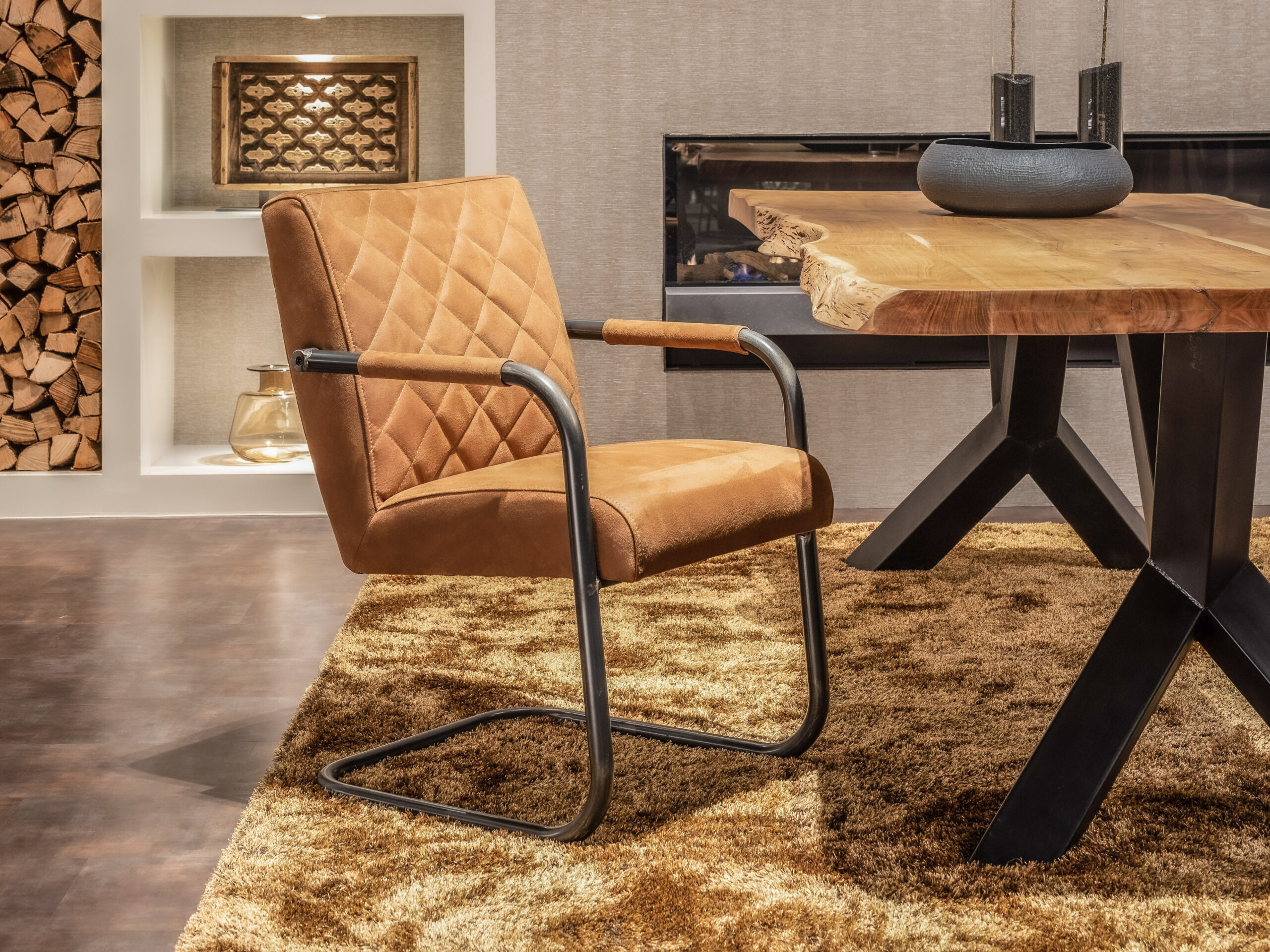 De eetkamerstoel Caledon is een fraaie toevoeging aan onze collectie industriële eetkamerstoelen. Deze stoere eetkamerstoel heeft een donker stalen sledepoot met fraaie vintage uitstraling De sledepoot loopt aan 1 stuk door, van de armleuningen naar de sledepoot en weer terug. Het bull eco leder (antraciet, camel en moss) is exact hetzelfde materiaal als wij voor onze andere gestoffeerde meubels gebruiken en zijn dus leuk te combineren!