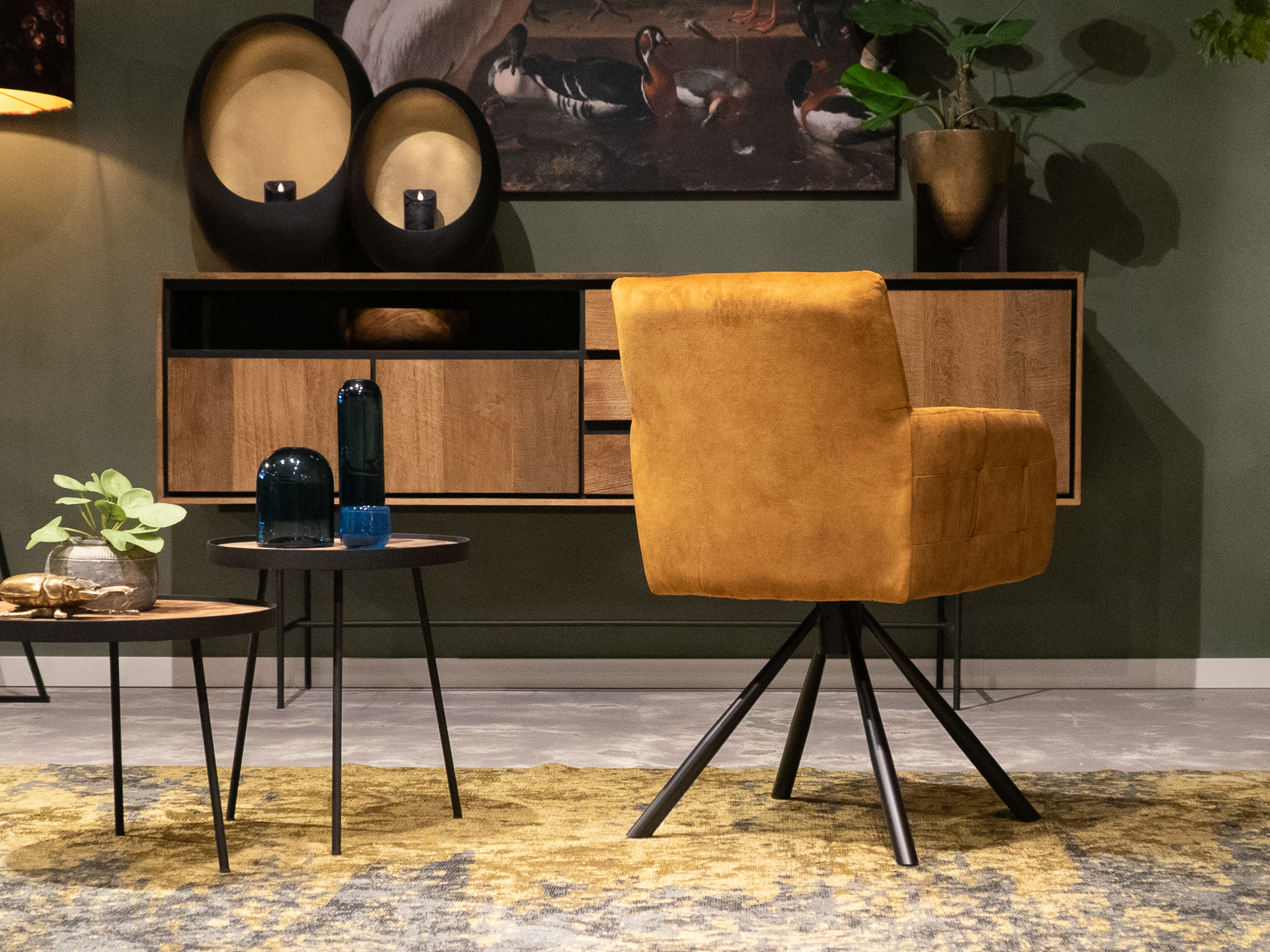 Mooie industriële draaibare eetkamerstoel met armleuningen en auto return draaisysteem. Deze eetkamerstoel bevat een mooi zwart stalen frame en is leverbaar in al onze vaste leer en stofsoorten. Bezoek onze showroom om te kunnen proefzitten en voor verdere inspiratie!