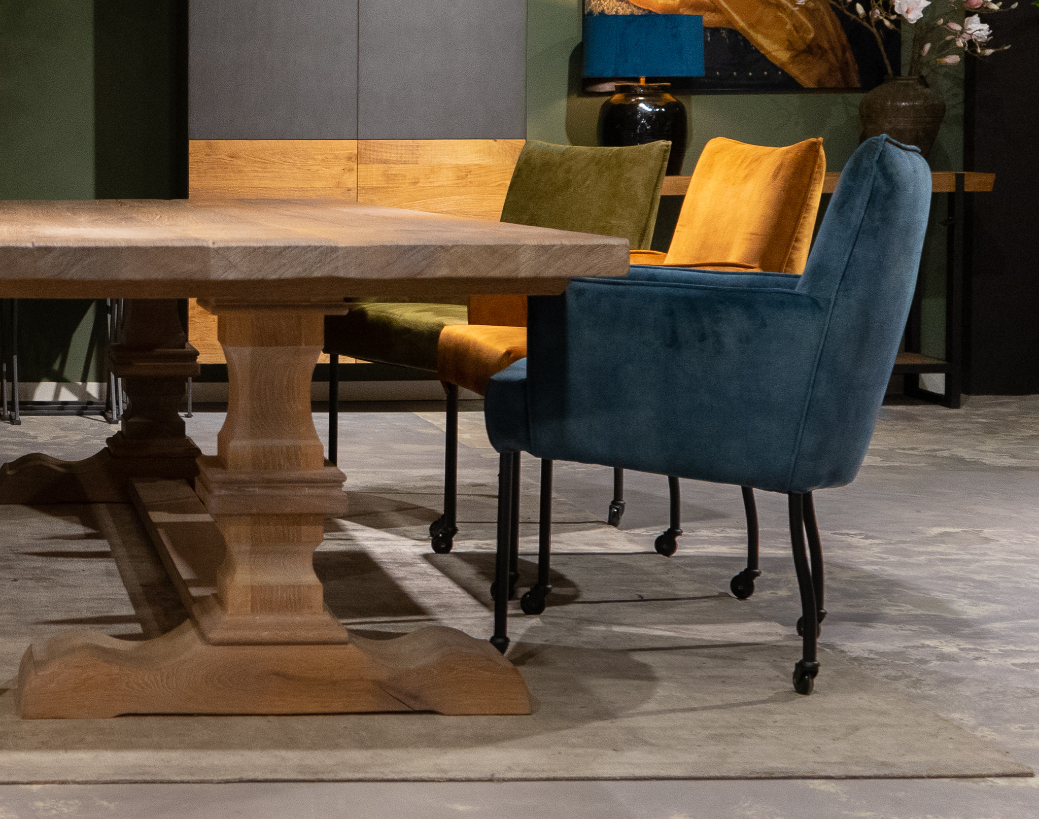 Luxe eetkamerstoel op wielen met bijzonder comfortabele zit, leverbaar in mooi dik doorgekleurd leer en onze vaste stoffen de relax, velvet en bull eco leder.
