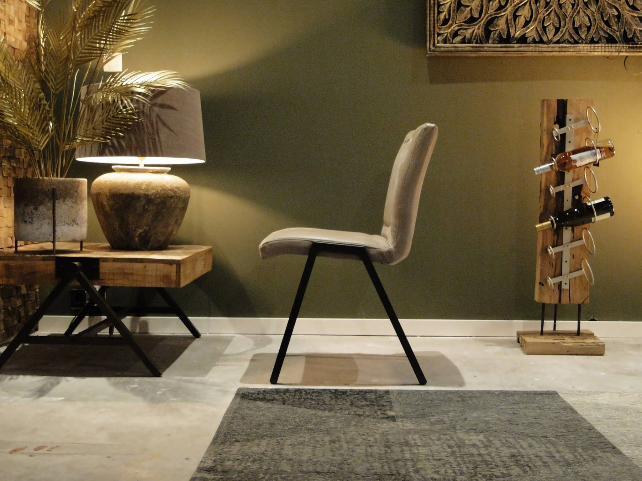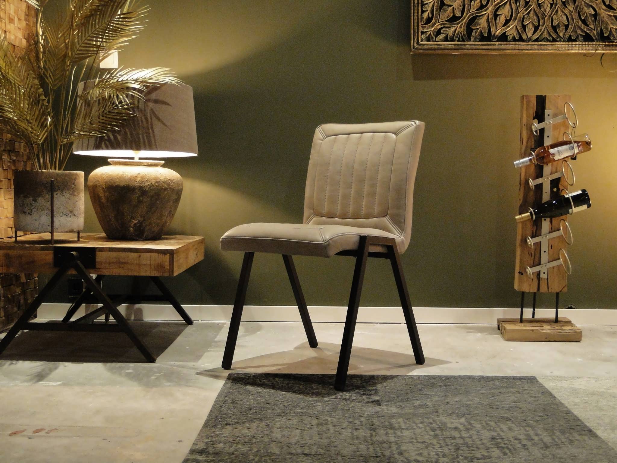 Stoere industriële eetkamerstoel leverbaar in leer en stof. Dit model leveren we in 2 soorten doorgekleurd leer en in 2 soorten stof waarvan 1 exclusief bij ons verkrijgbaar . Zowel in het stof als leer een zeer luxe eetkamerstoel, leverbaar met of zonder armleuning. Het metalen frame is voorzien van een beschermende poedercoat en maakt de stoere industriële uitstraling compleet.