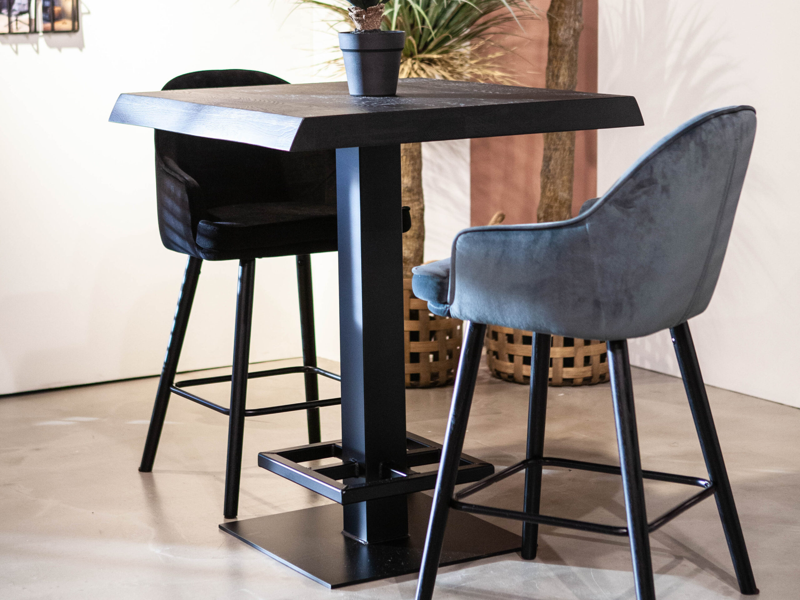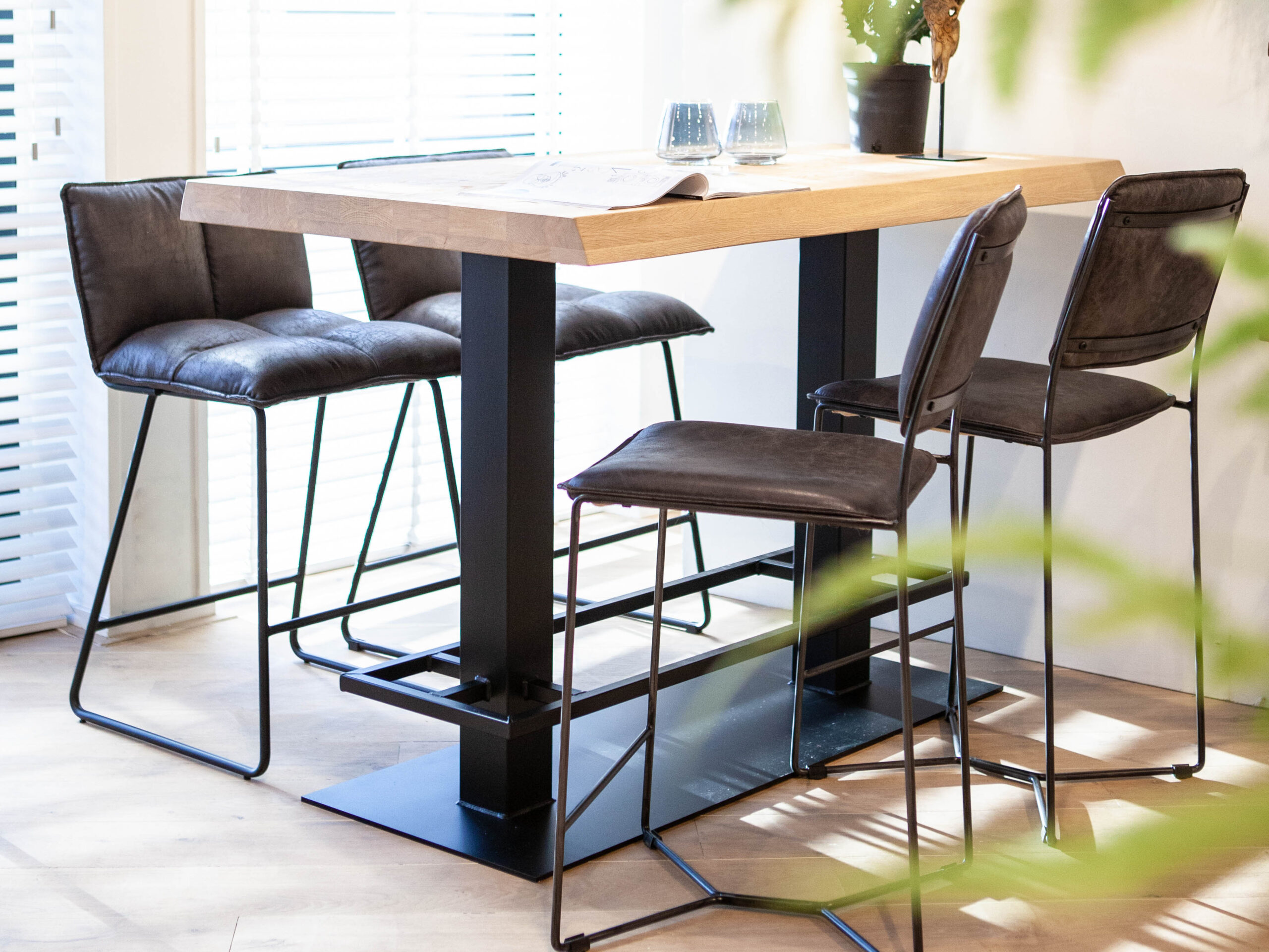 Stoere industriële bartafel met zwart stalen bistro onderstel en voetenbalk. Deze bartafel is gemaakt van robuust licht eikenhout in naturel of zwart en is doorgaans direct uit voorraad leverbaar. De bartafel Lorette is ook leuk te combineren met diverse barkrukken uit onze collectie.