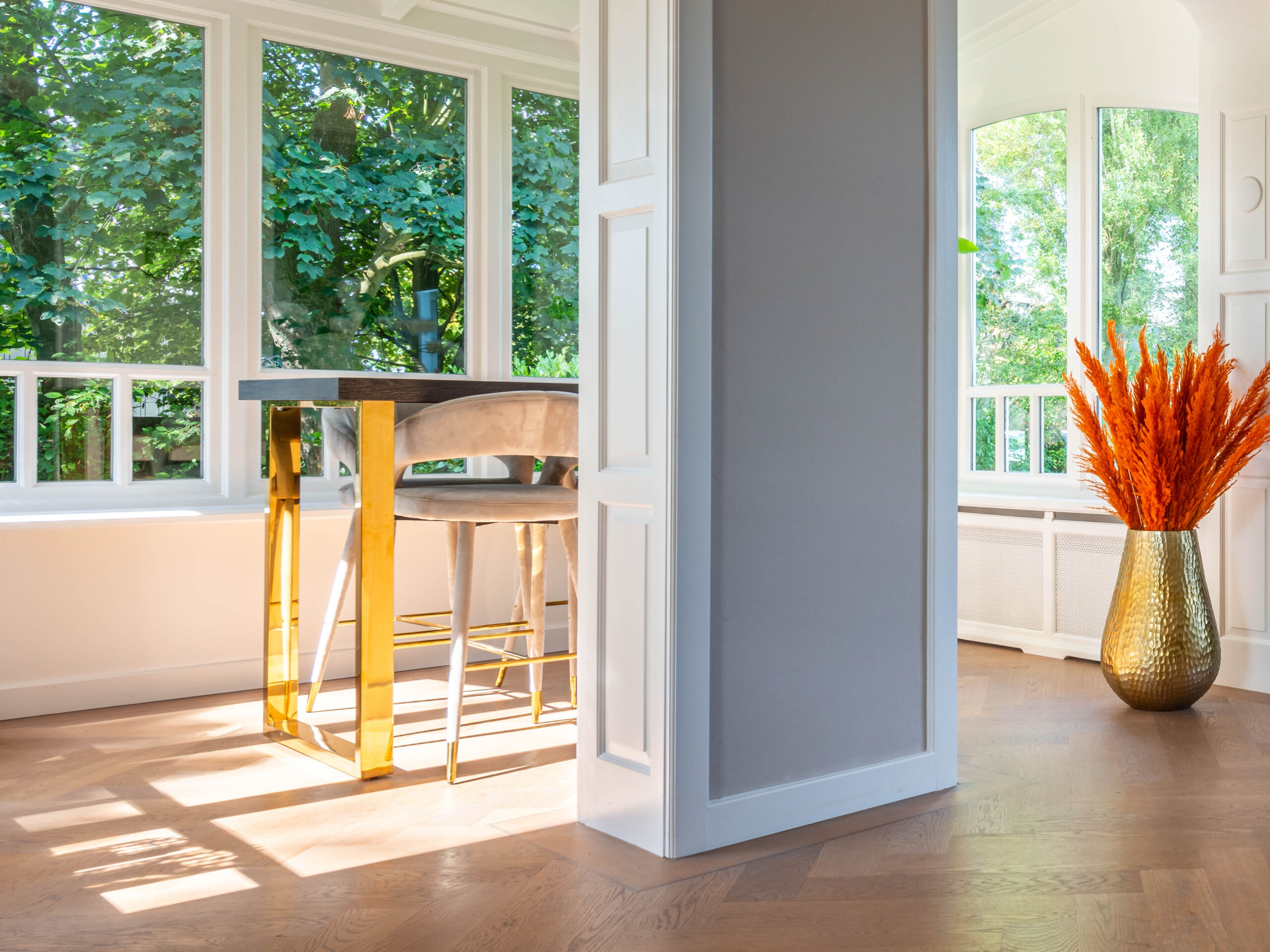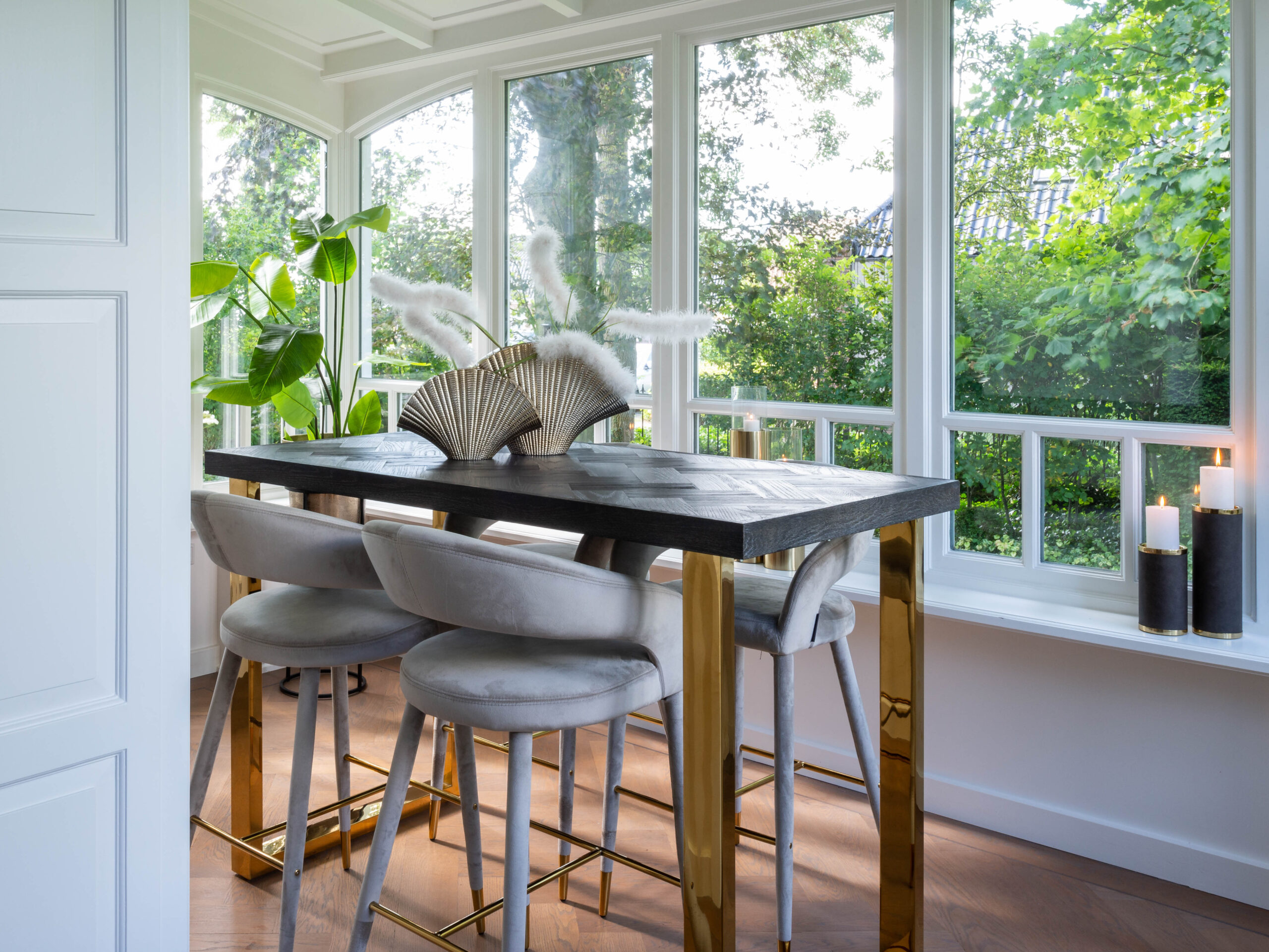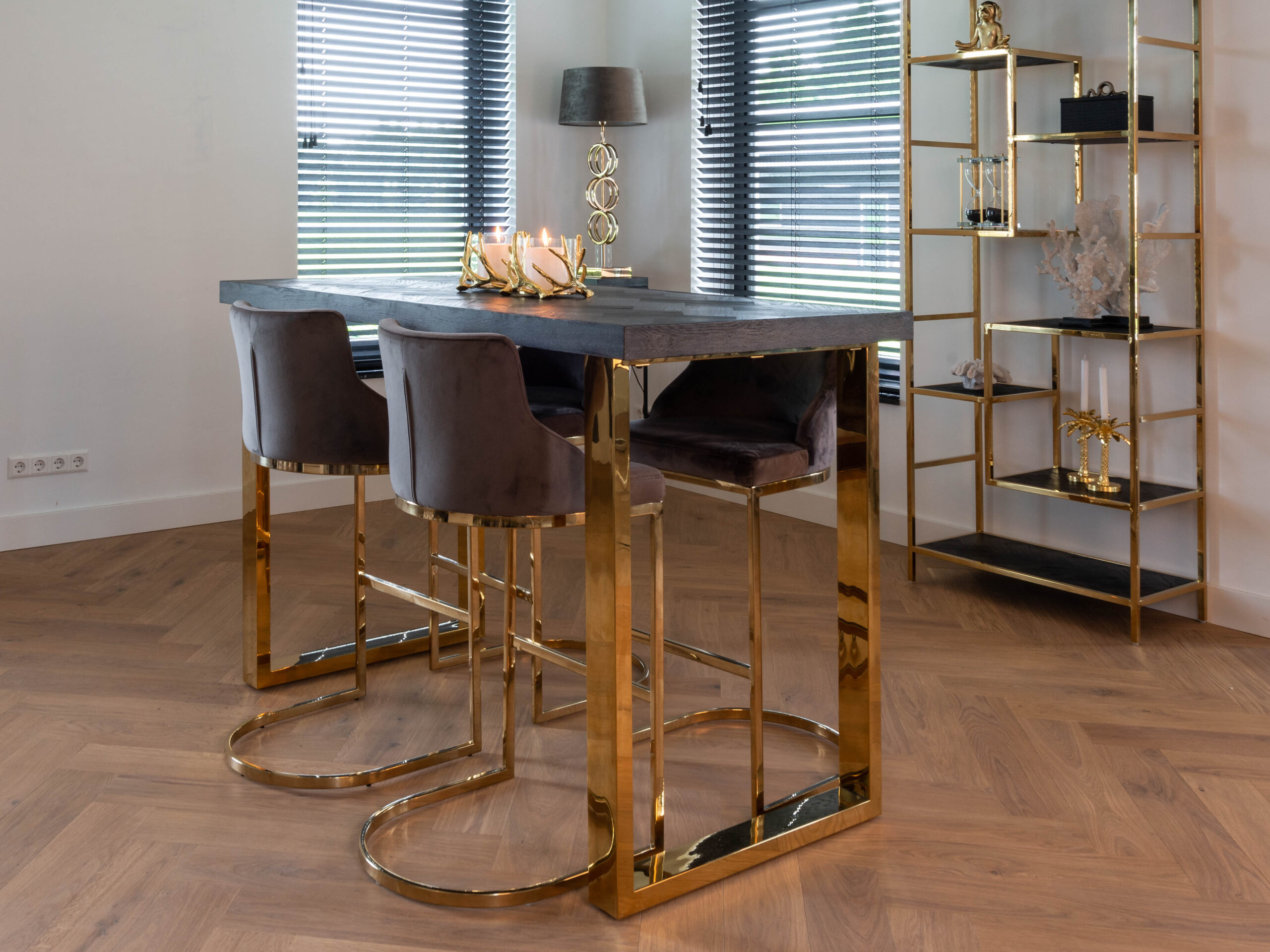 De luxe bartafel Nancy is net een tikje anders dan alle andere bartafels. Hier is bij het ontwerp echt eens buiten de bestaande kaders gedacht! Het tafelblad is gemaakt van nieuwe, zwart gebeitst eikenhout waarvan de planken in visgraatmotief zijn geplaatst. Voor het onderstel heeft u de keuze uit de kleur zilver of goud. Deze chique bartafel heeft een lengte van 160cm, een breedte van 80cm en een hoogte van 105cm. Voor het gouden onderstel geldt een meerprijs van € 200,00.