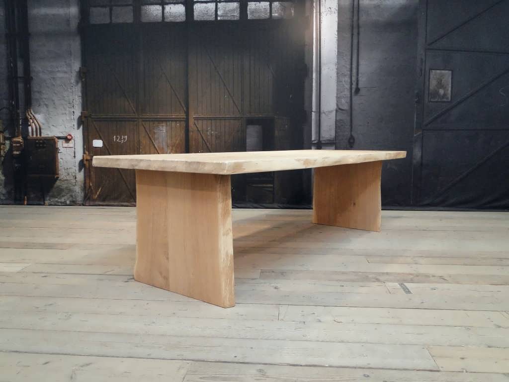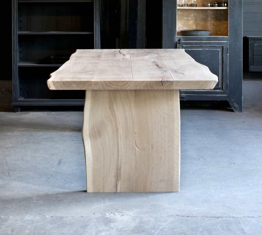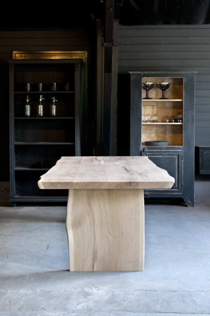 Massief eiken boomstamtafel Kai, deze maatwerk boomstamtafel met eiken wangen maken we geheel op maat in eigen werkplaats.