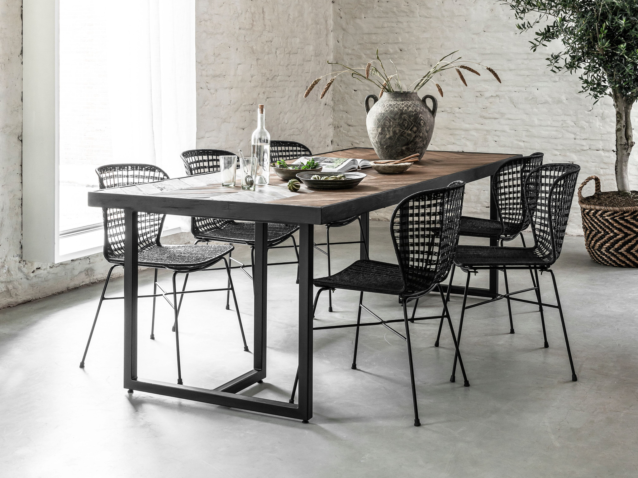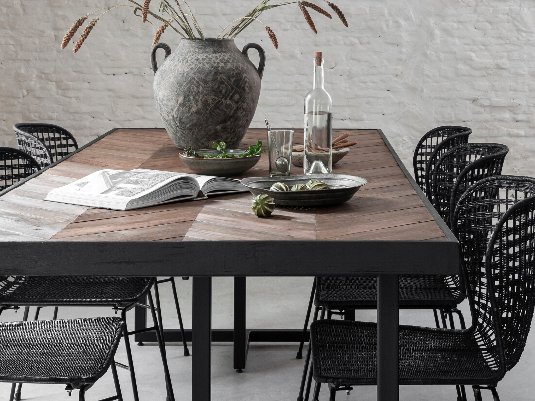 Stijlvolle eettafel Padula van oud recyled teak en zwart stalen onderstel, leverbaar doorgaans uit voorraad. De eettafel is leverbaar in de lengtematen 160cm, 200cm, 220cm en 280cm. De Padula serie is uniek doordat de teak planken in visgraat motief zijn geplaast om zo het meubel een karakteristiek uiterlijk te geven. De combinatie van het zwart gebeitste hout en het oude gerecyclede teak zorgt voor een erg warme en robuuste uitstraling.
