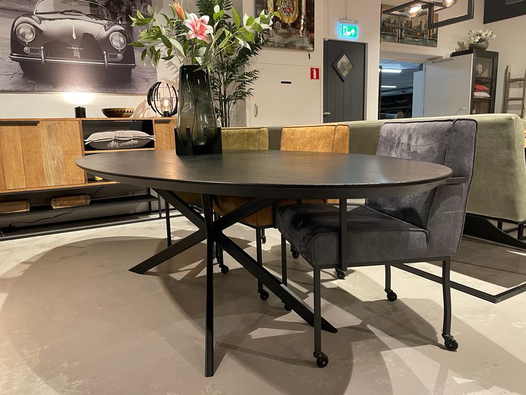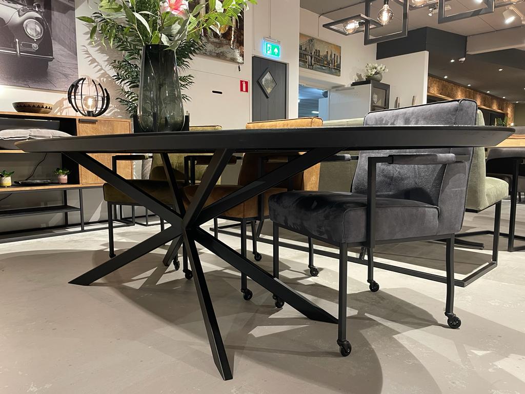 Stoere industriële eiken tafel in de kleur naturel of zwart. U combineert dit blad met bijvoorbeeld een spin poot zoals op de foto, of kies uit ruim 10 andere onderstellen. Ook het blad is te kiezen. Kijk bijvoorbeeld eens naar de kiezel, druppel of deens ovale variant. Welke u ook kiest, u slaag altijd!