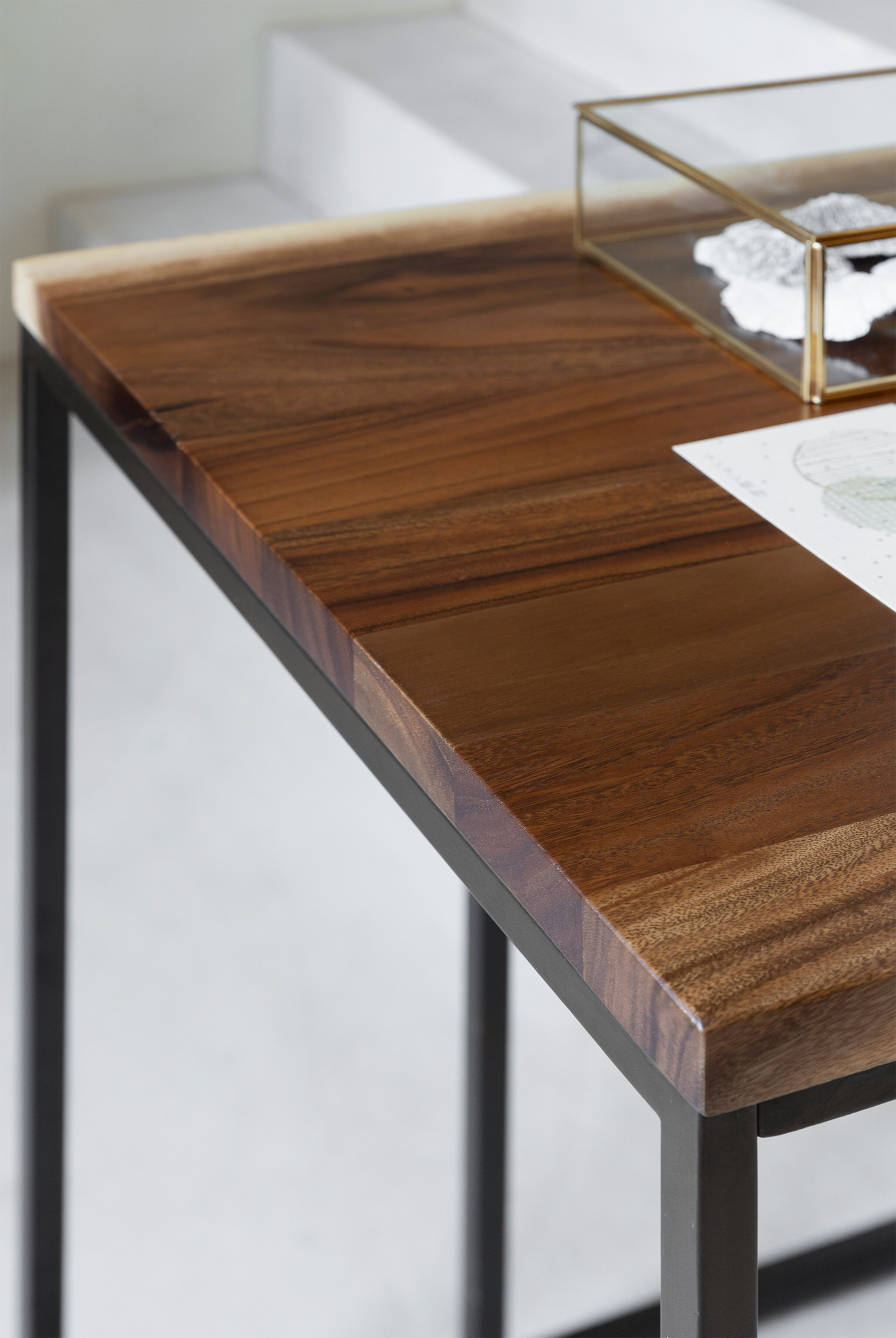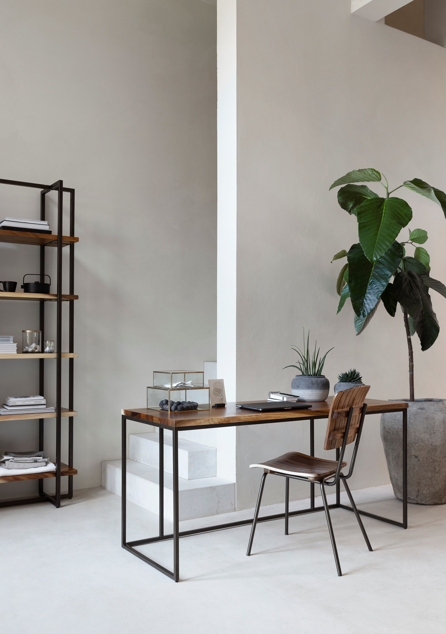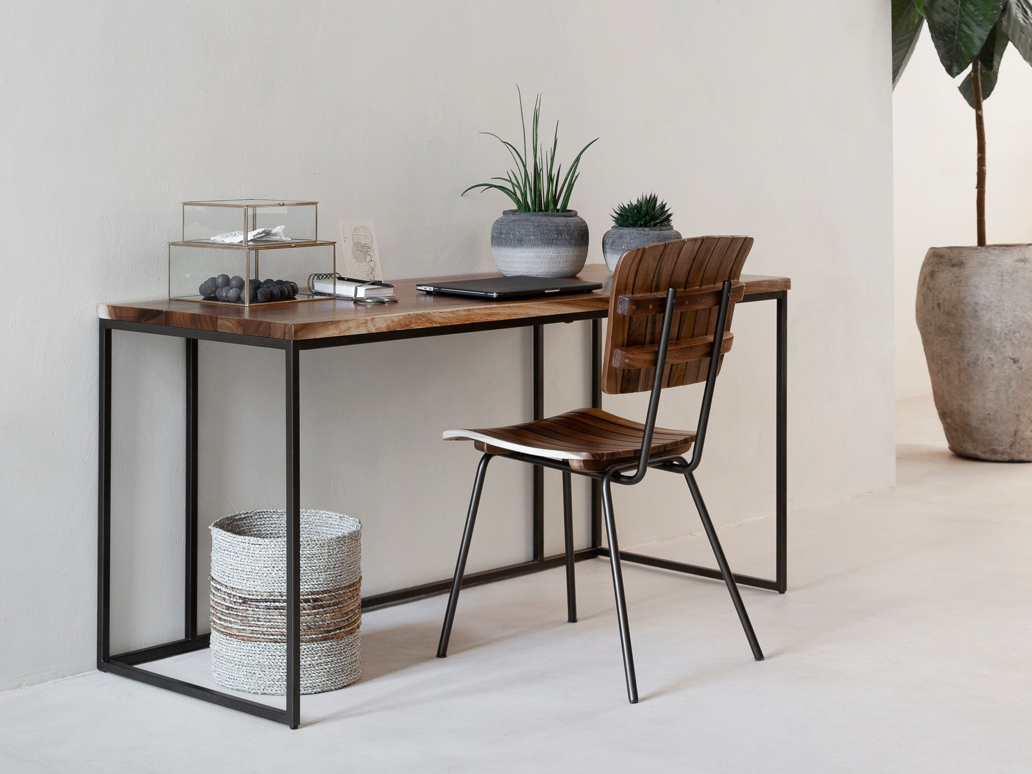 Ranke industriële bureautafel met rondom een stalen frame. Deze bureautafel komt uitsluitend in de maat 140x60x76cm en is gemaakt van sfeervol suarhout. Doorgaans is dit meubel direct uit voorraad leverbaar. De Fontenay bureautafel is leuk te combineren met andere meubels uit dezelfde serie.