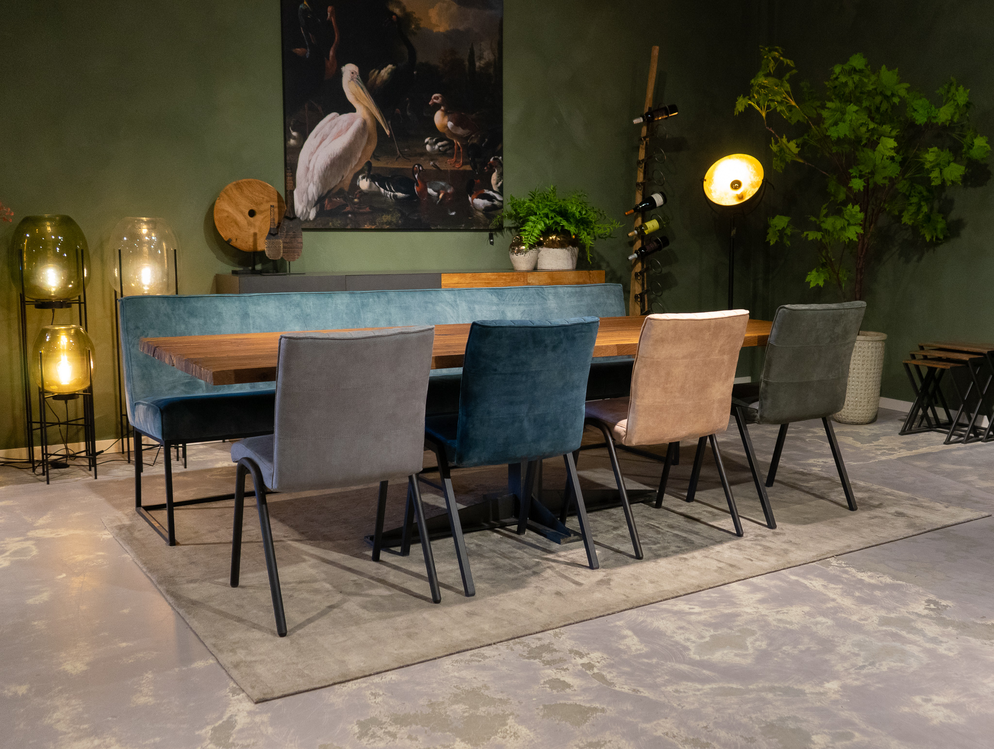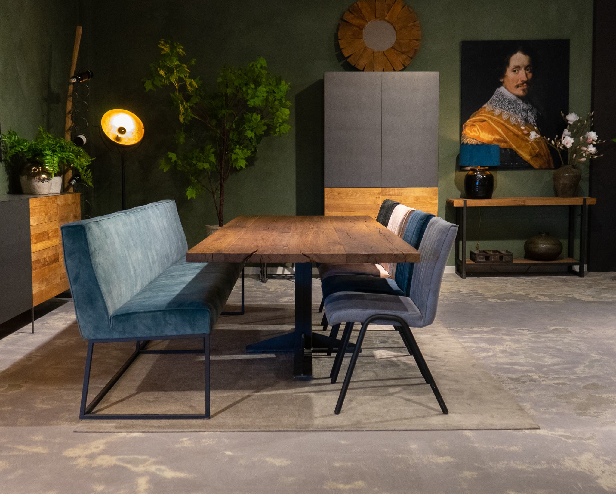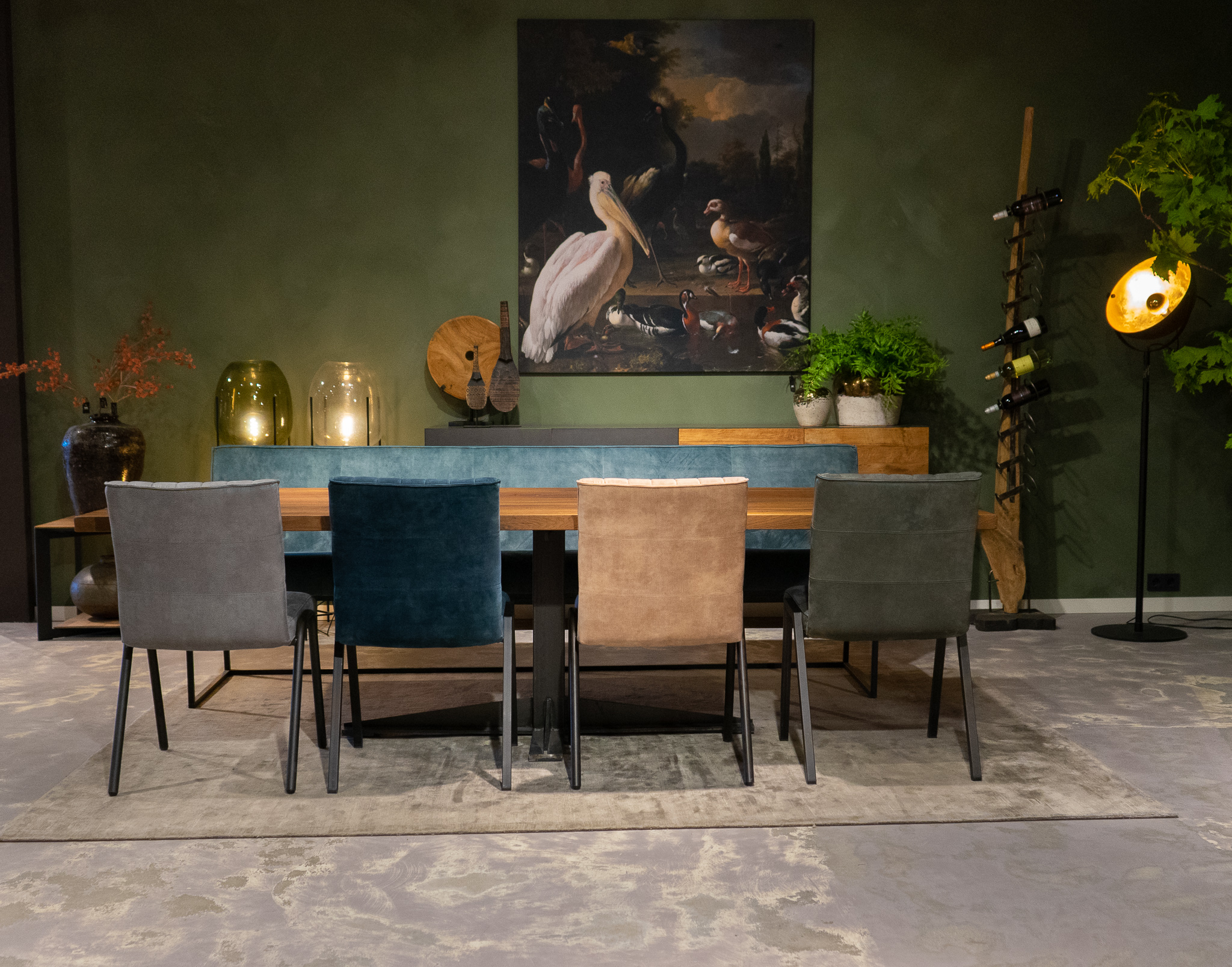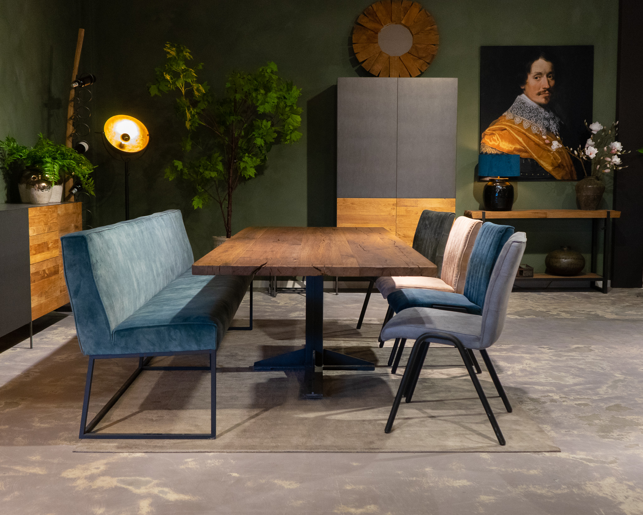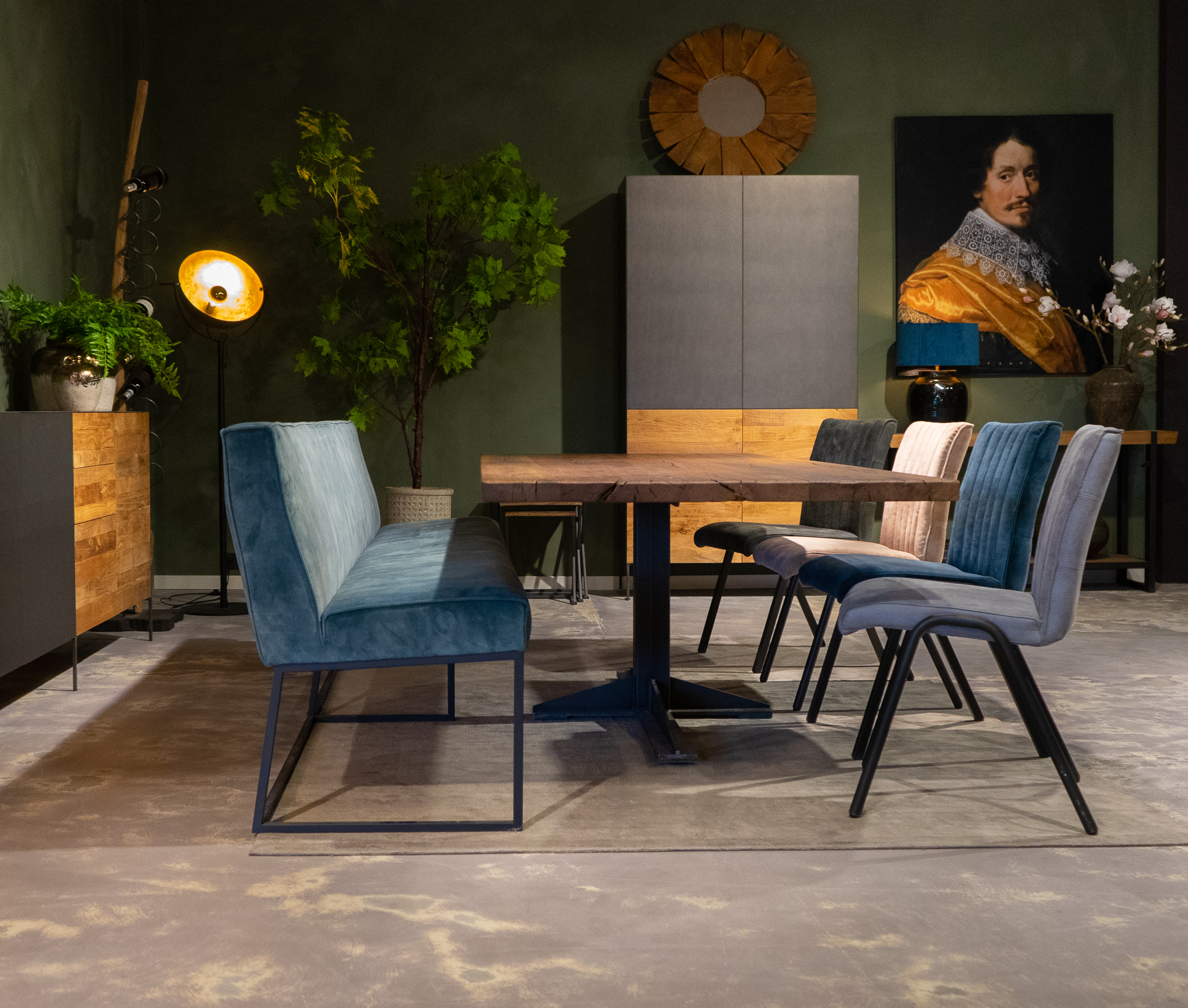 U kunt de eetkamertafel Villefranche mooi combineren met een eetkamerbank. Het onderstel zit u namelijk niet in de weg bij het inschuiven. Wij adviseren om de eetkamerbank circa 10-20cm korter te nemen t.o.v. de lengte van de tafel. Ook is het mogelijk om een extra eetkamerstoel aan de kopse kant te plaatsen mocht het nodig zijn.