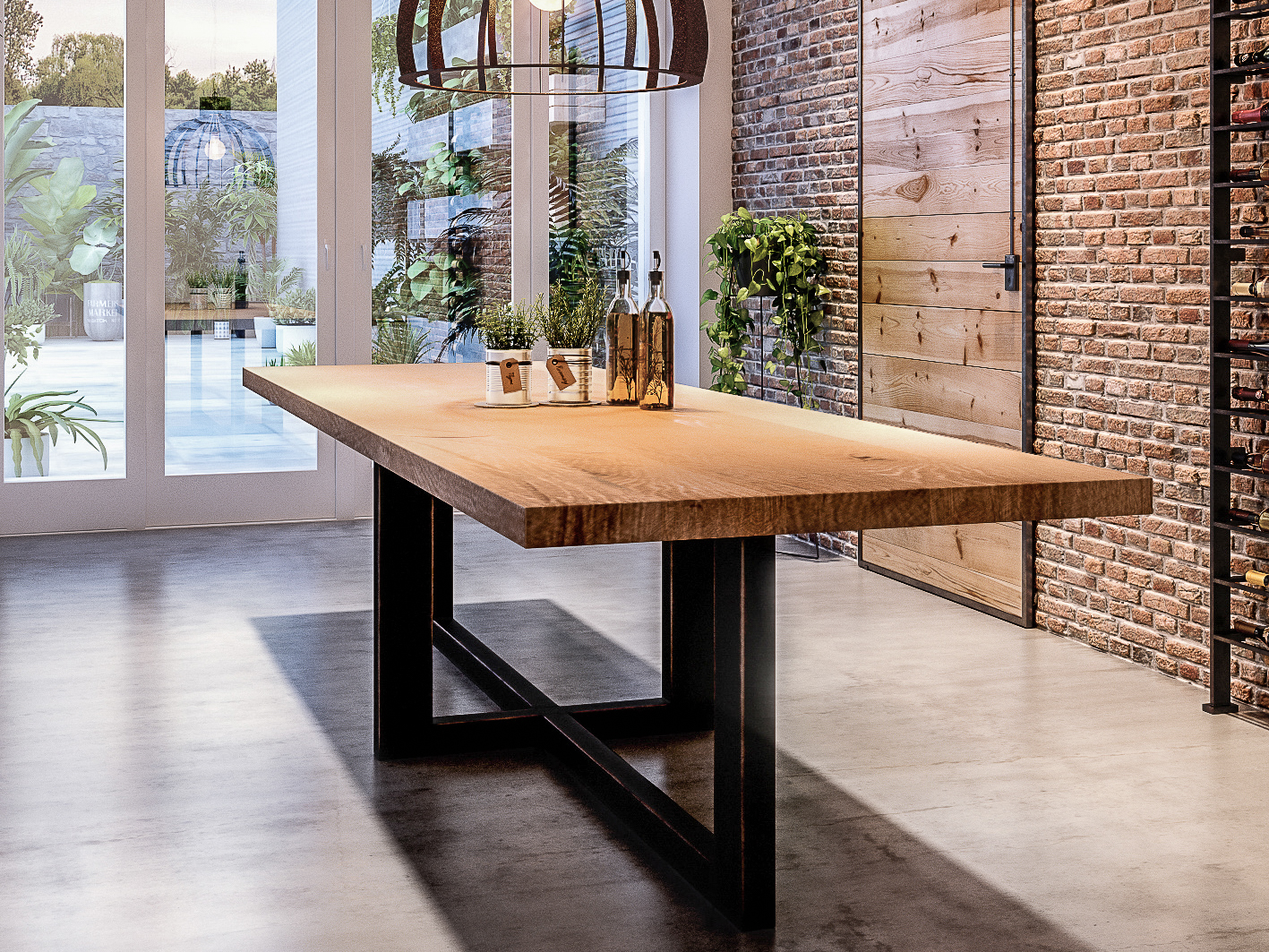 Minstens 100 jaar duurt het, voor de stam van een eik dik en sterk genoeg is om er robuuste tafels met slechts 3 of 4 brede planken van te maken. Het hout wordt zorgvuldig geselecteerd uit duurzaam beheerde Duitse en Franse productiebossen. Alleen het mooiste en beste hout wordt geselecteerd om dit model van te maken. Na het drogingsproces worden de juiste planken geselecteerd om uw geheel op maat gemaakte tafel van te maken. Dit model uit eigen werkplaats is ook leverbaar groter dan een 3 meter tafel, zelfs tot wel 4 meter lang en 120cm breed. Voor tafels groter dan 3 meter vragen we wel wat assisterende spierballen bij levering. Montage verzorgen wij.