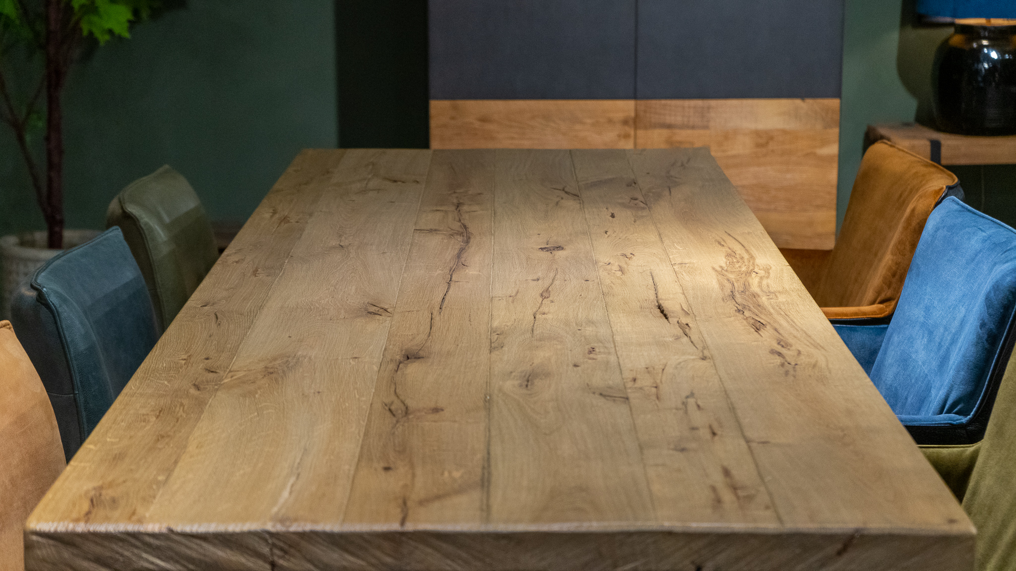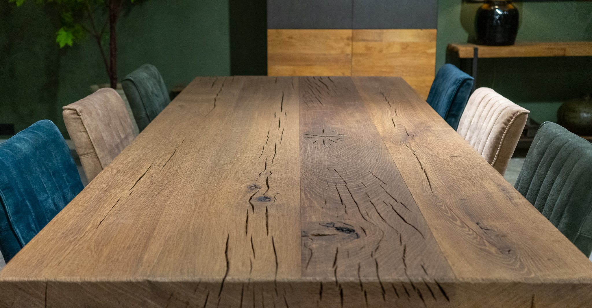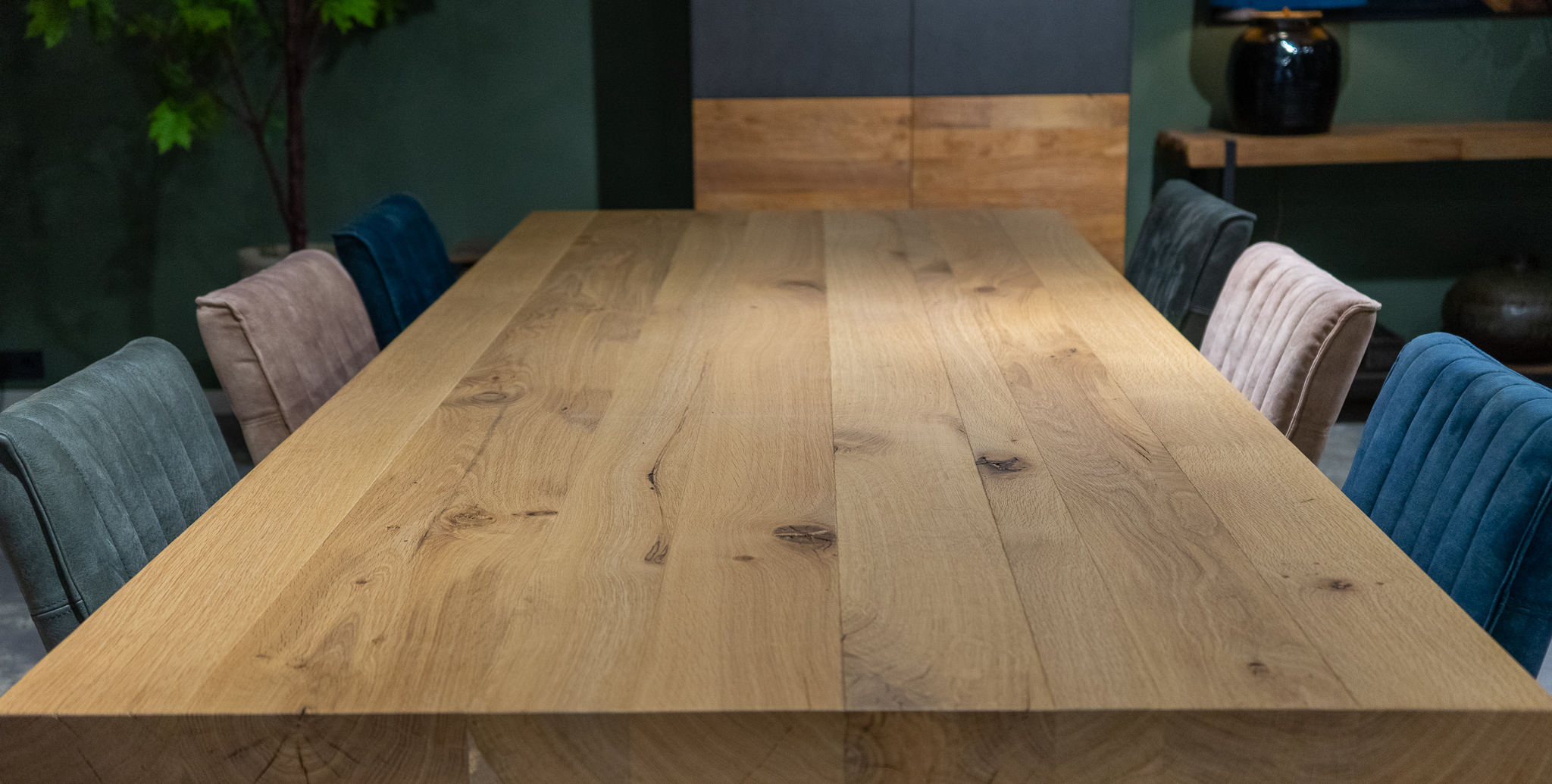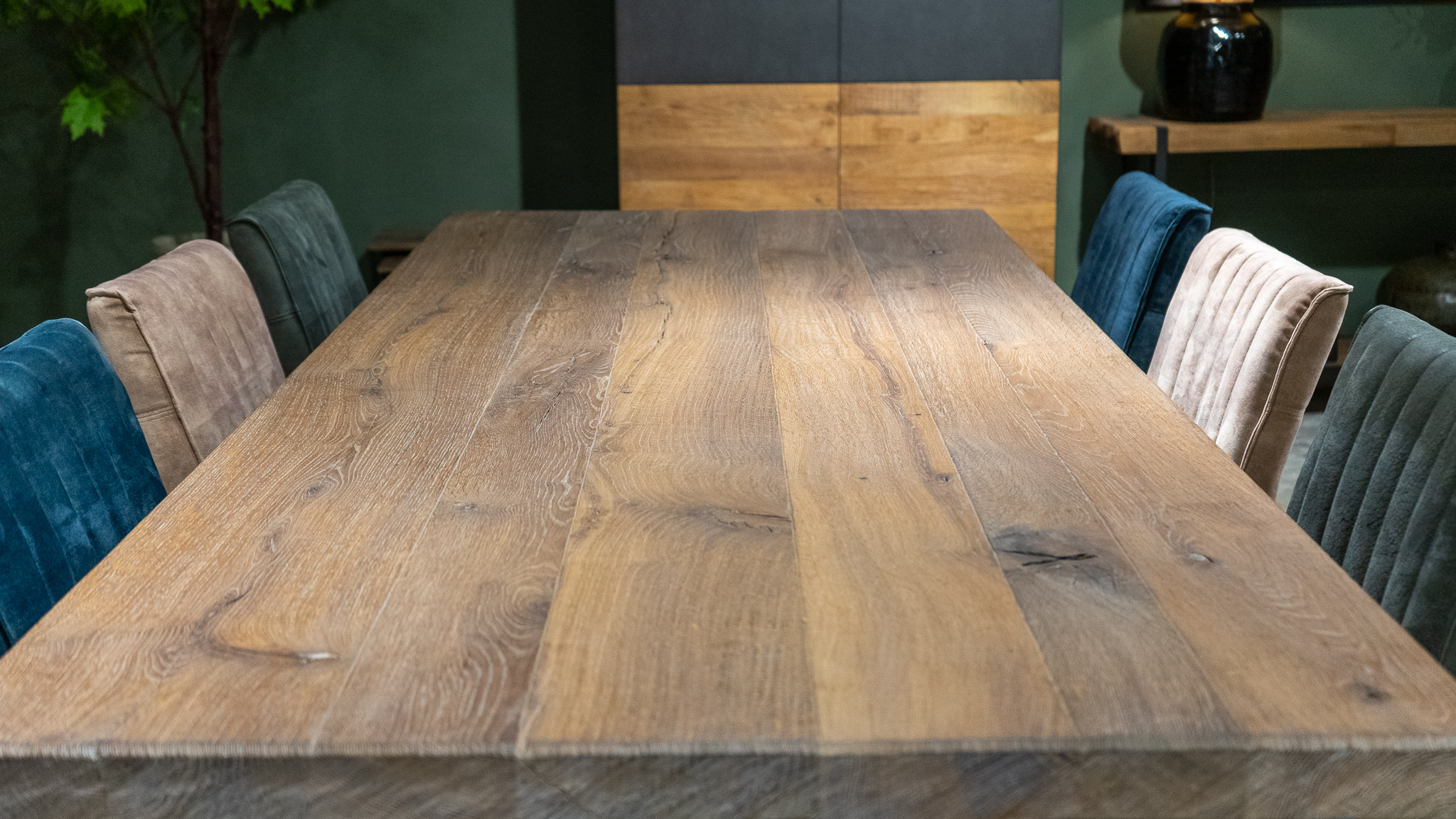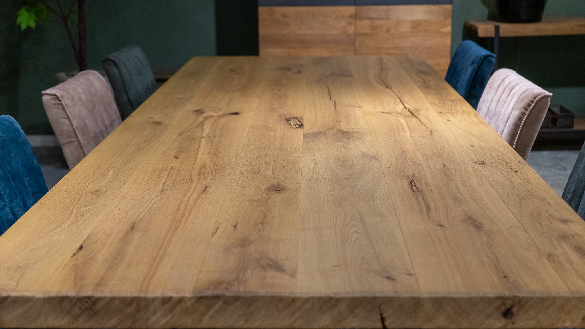 Bovenstaande afbeeldingen zijn puur ter indicatie, door gebruik van natuurlijke materialen en de unieke manier van behandelen zal er altijd kleurverschil zijn t.o.v. bovenstaande voorbeelden en de voorbeelden welke we in de showrooms hebben staan. Indien u een geoliede tafel heeft kiest, raden wij u ten zeerste aan om de tafel de eerste 4 weken volledig te ontzien. Gebruik bijvoorbeeld placemats voor borden en onderzetters voor glazen. Ook is het heel belangrijk om de tafel de eerste weken uitsluitend af te nemen met een droge doek.