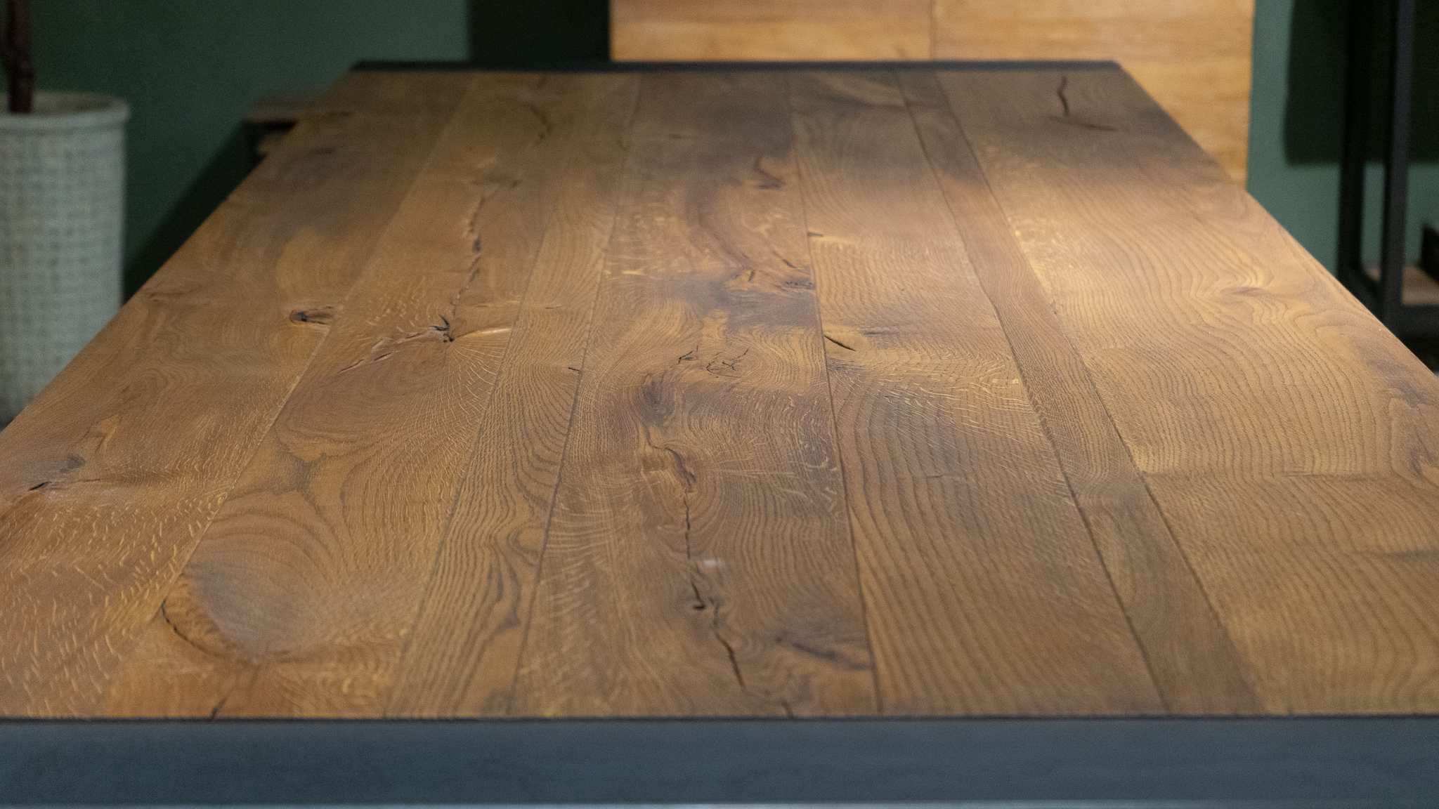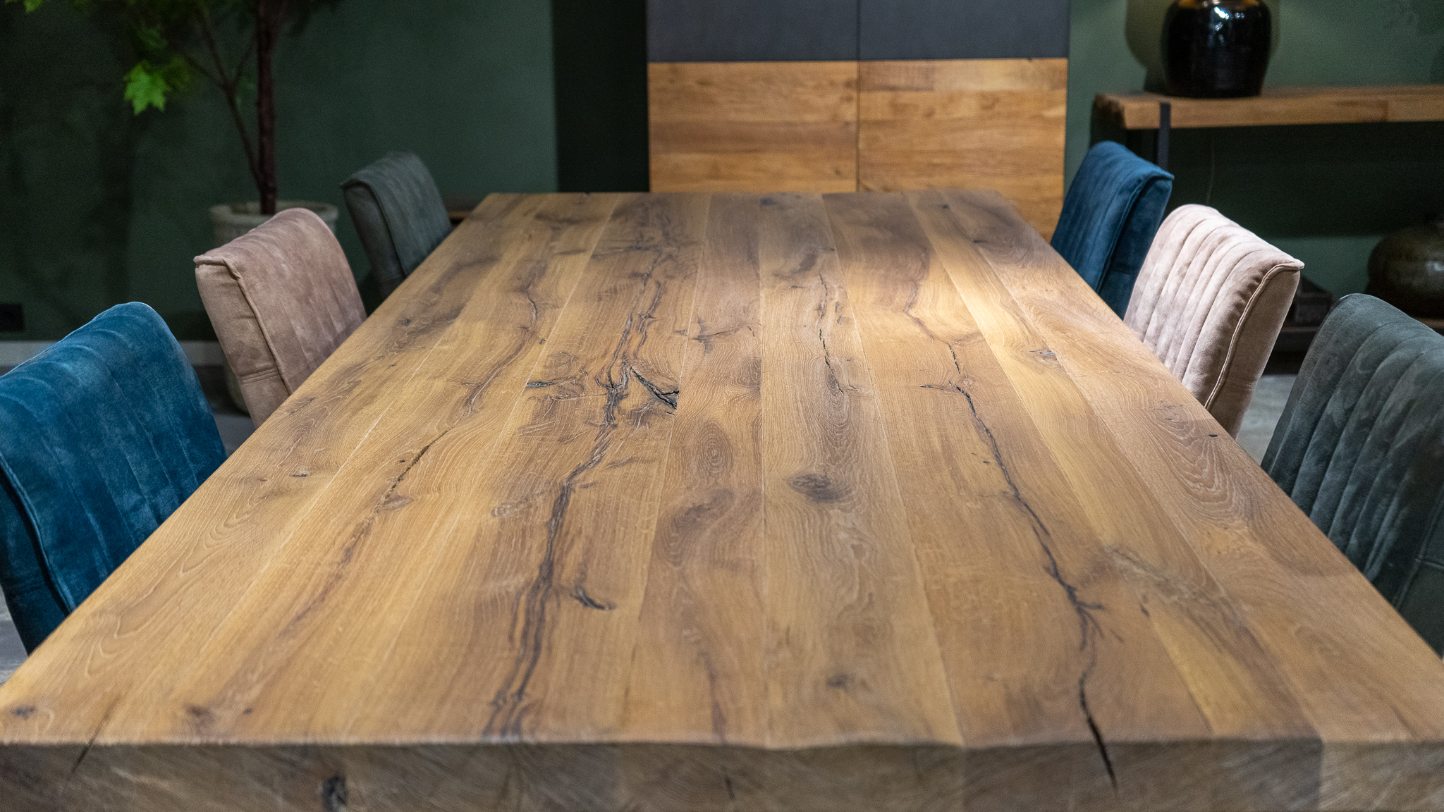 De eetkamertafel Antibes is verkrijgbaar in massief eiken met een dikte van 4 of 6cm. Het eikenhout wat wij hiervoor gebruiken komt uit duurzaam beheerde bossen uit Frankrijk of Duitsland. Het massieve eiken is een natuurproduct en zal zich kenmerken door scheuren, knoesten en oneffenheden. U kunt bij Robuuste Tafels de mate van grofheid bepalen. U kunt kiezen uit:
