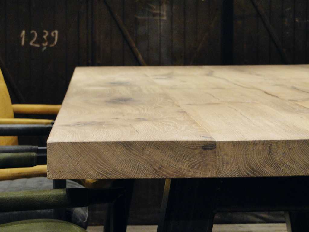 Onze eettafel Lugano is gemaakt van massief oud eiken van 4cm of 6cm dik. Het door ons gebruikte eikenhout voor deze industriële eetkamertafel komt uit duurzaam beheerde bossen uit Frankrijk of Duitsland en wordt nauwkeurig geselecteerd. Het massieve eiken is een natuurproduct en zal zich kenmerken door scheuren, knoesten en oneffenheden. U kunt bij Robuuste Tafels zelf de mate van grofheid bepalen. U kunt kiezen uit matig rustiek (rustig blad), standaard rustiek (blad met redelijke knoesten en scheuren) en extra rustiek (ruig blad met veel knoesten en scheuren).