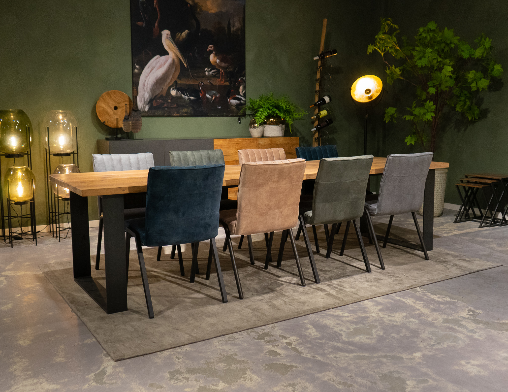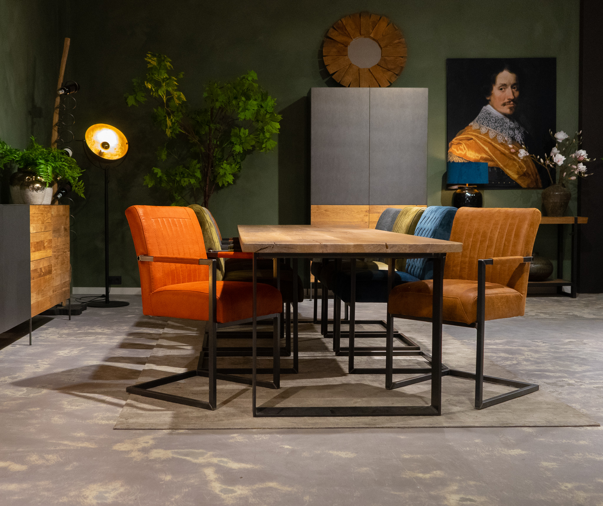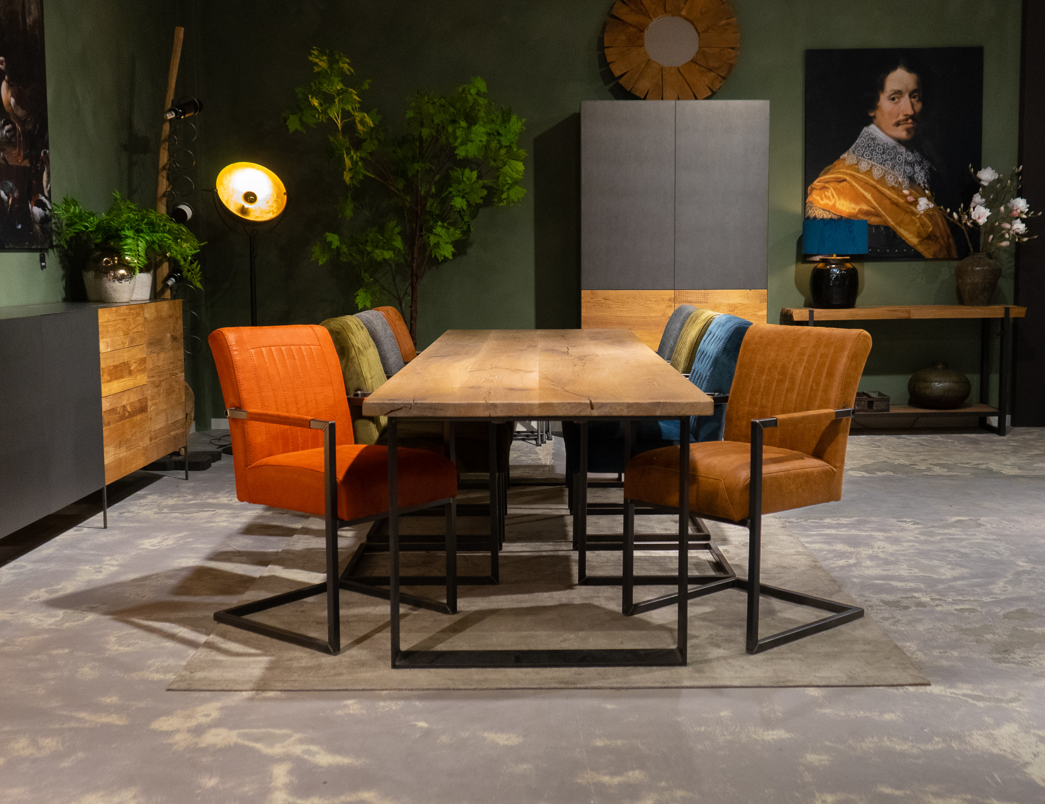 Deze stoere industriele eettafel maken wij geheel op maat in eigen werkplaats. U kiest een kleur, aantal planken en hoe ruig het blad wel of niet mag worden en wij gaan aan de slag. Deze industriële eettafel kenmerkt zich door zijn ranke onderstel met platte stalen strip. Zoals bij al onze industriële eettafels hebben we bij de Omar ook een bijpassende salontafel.