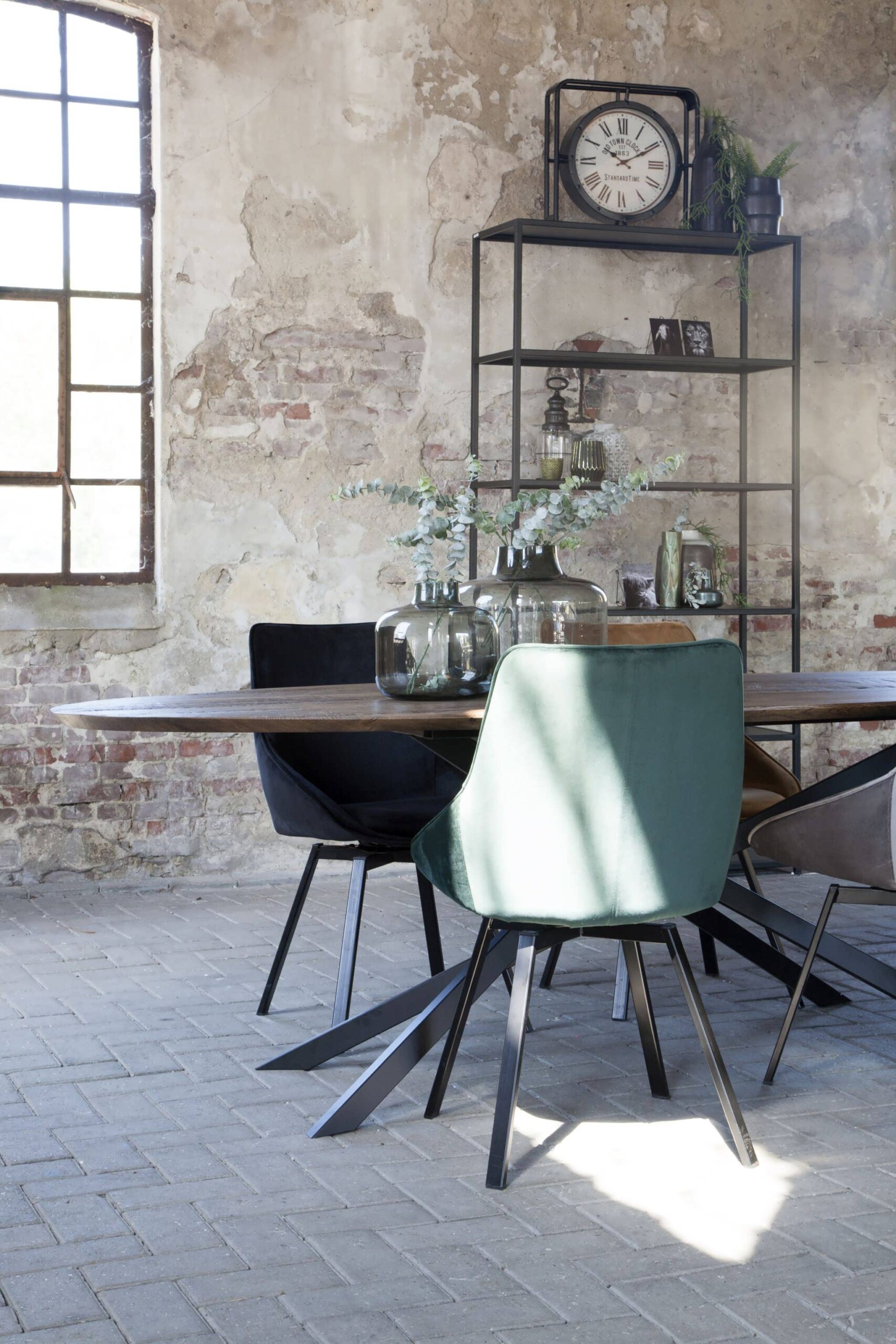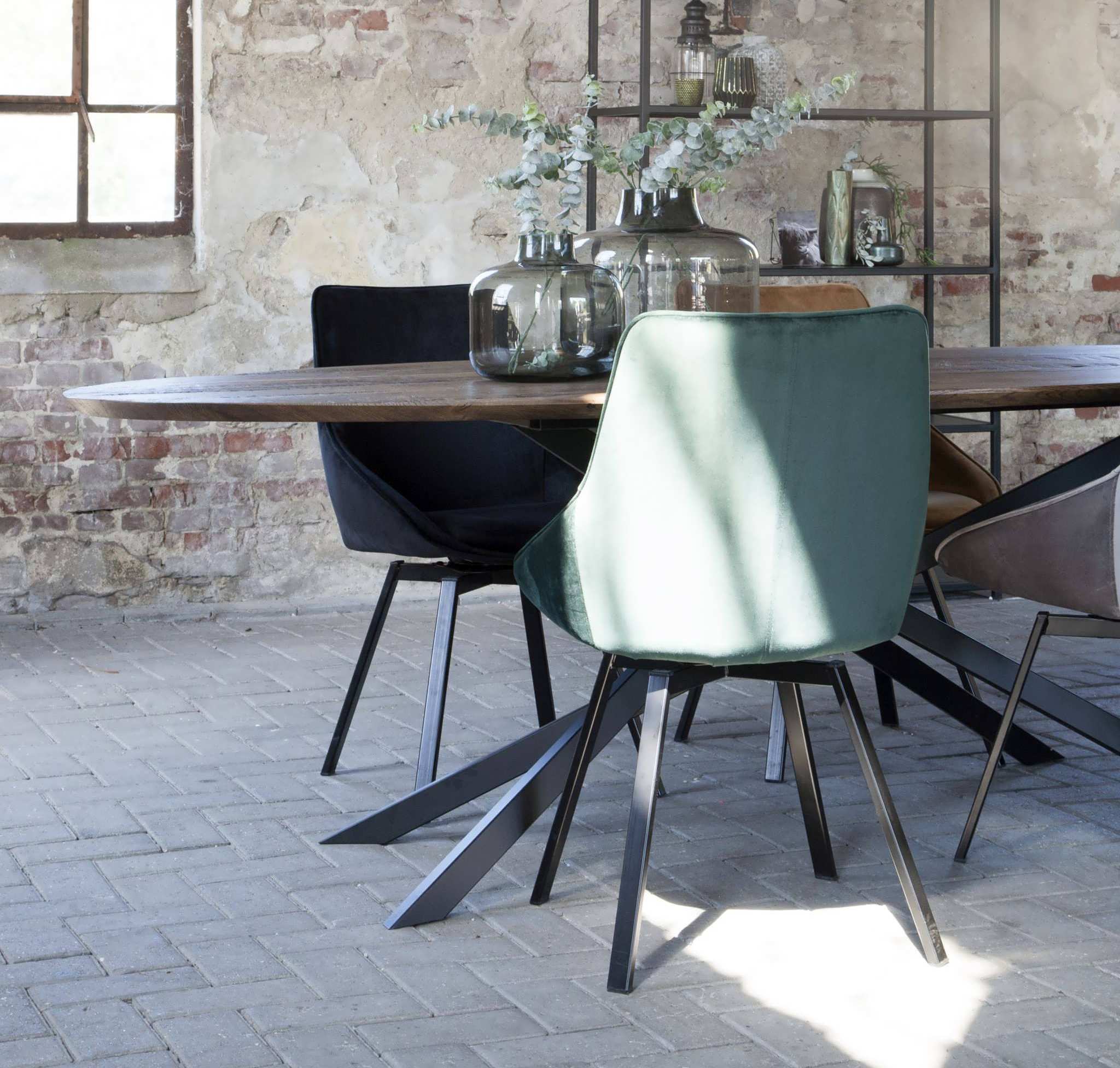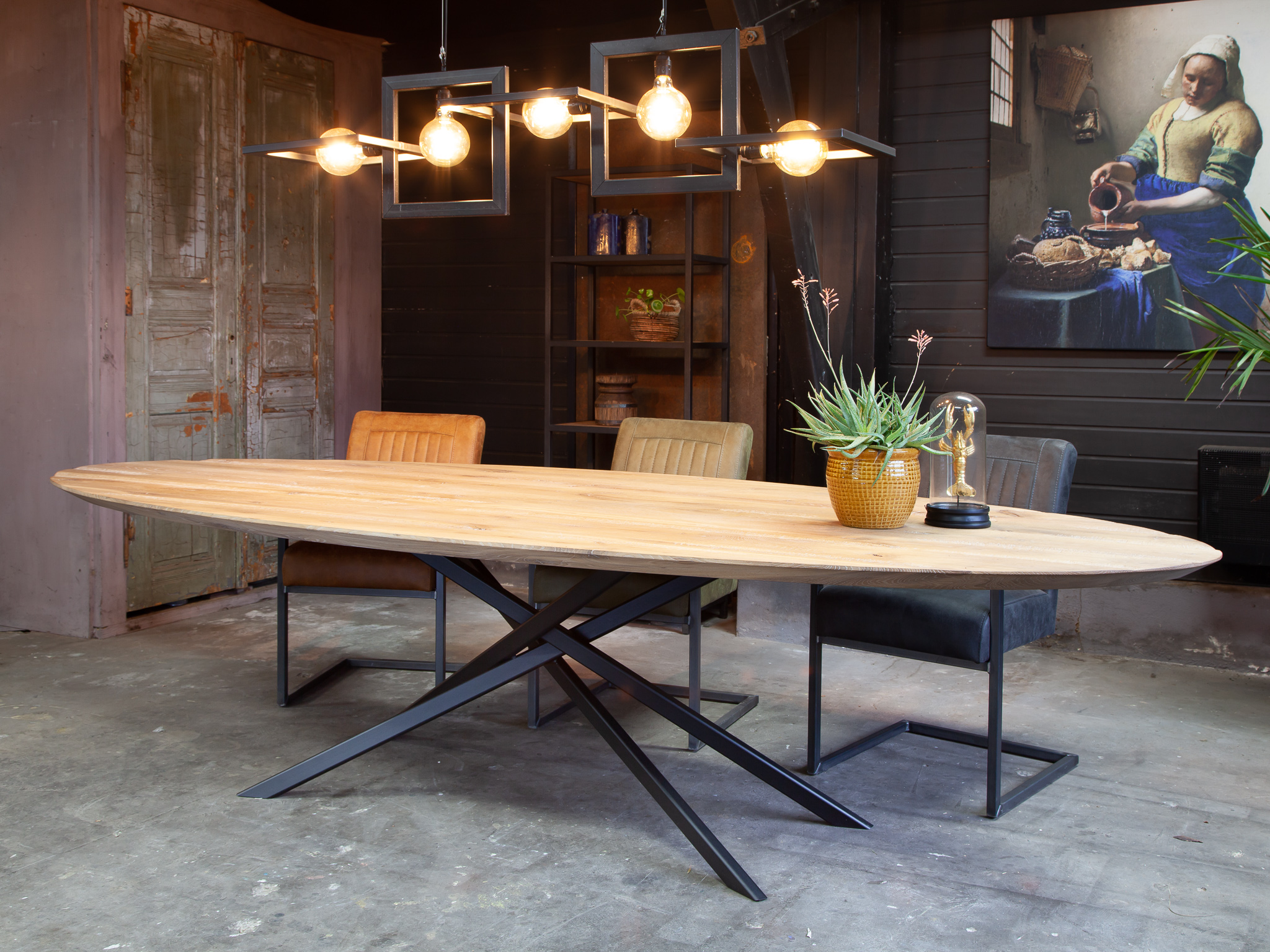 Unieke industriële eettafel met gekruiste middenpoot, een variant op onze Antibes, geheel op maat gemaakt in eigen werkplaats. U kiest een kleur, aantal planken en hoe ruig het blad wel of niet mag worden en wij gaan aan de slag. Deze industriële eettafel kenmerkt zich door zijn ranke onderstel. Dit model is zowel met een recht blad als een ovaal blad leverbaar.