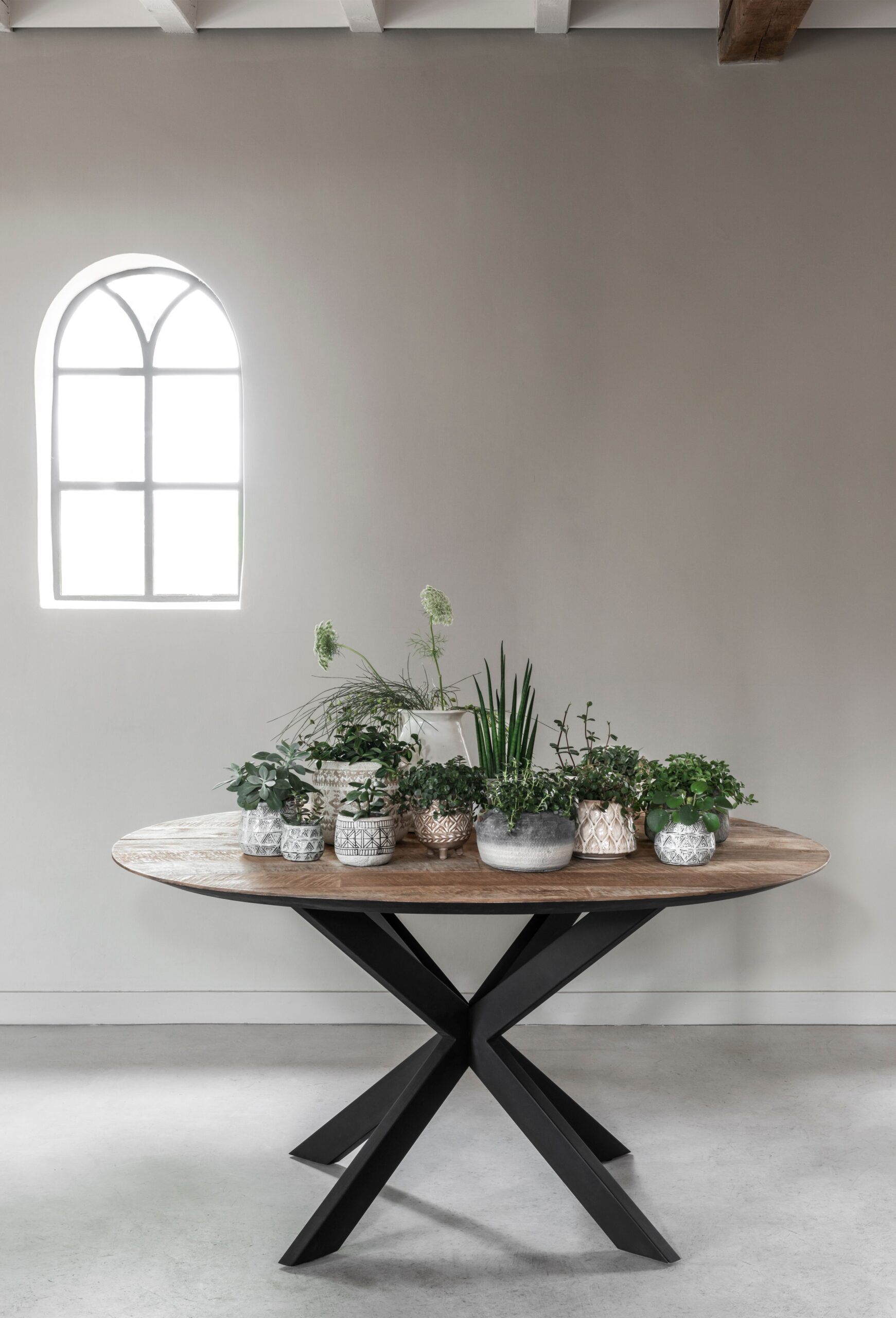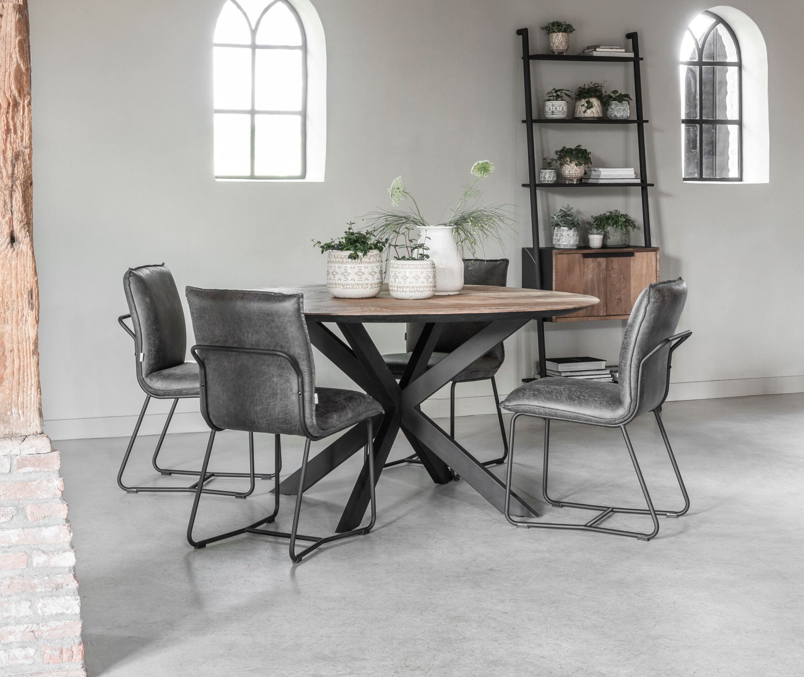 Stoere industriële ronde teak tafel van oud recycled teak en stalen poten, gemaakt van hetzelfde hout als onze Ferro, Maldini en Cavallo tafels. Leverbaar in diverse maten, zowel in naturel kleur als black doorgaans direct uit voorraad. Gemaakt van dit hout staat de Noma en Cavallo tafel in beide showrooms. Daarnaast hebben we in beide showrooms diverse salontafels en kasten/tv-meubels staan gemaakt van dit hout zowel de naturel als black kleur.