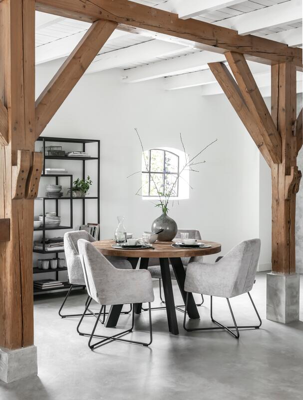Stoere industriële ronde teak tafel van oud recycled teak en stalen poten, gemaakt van hetzelfde hout als onze Ferro en Cavallo tafels. Leverbaar doorgaans direct uit voorraad.