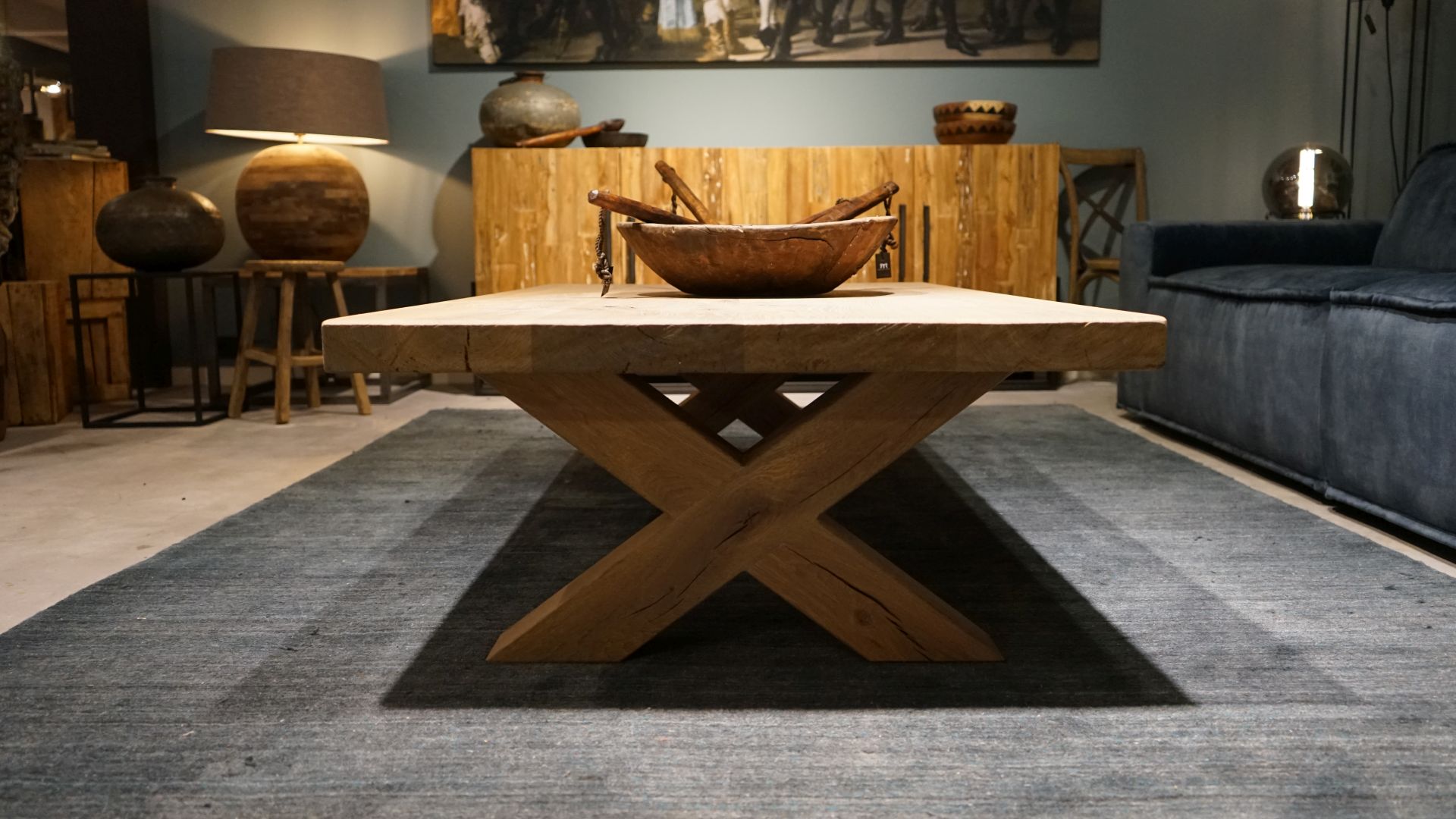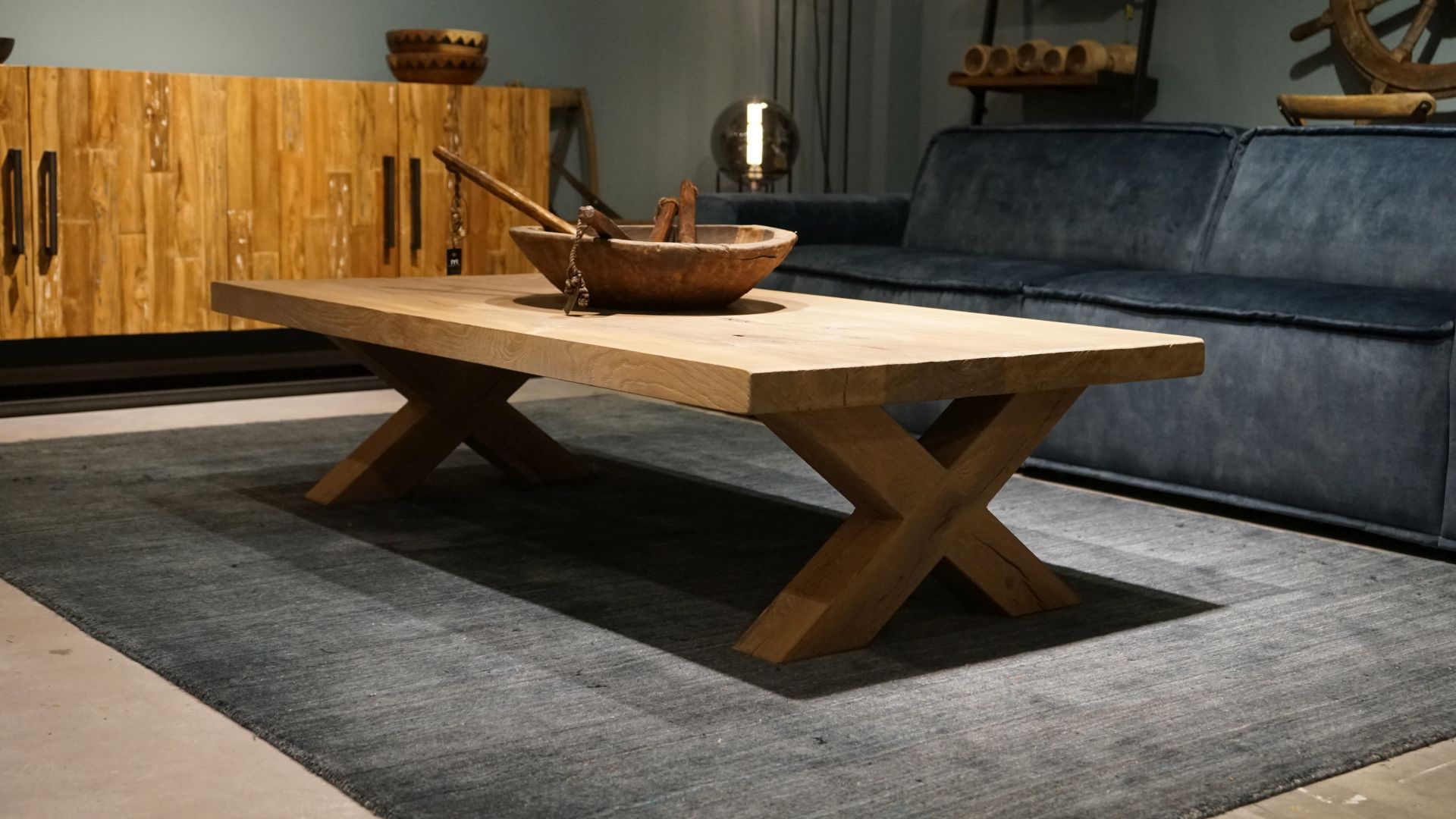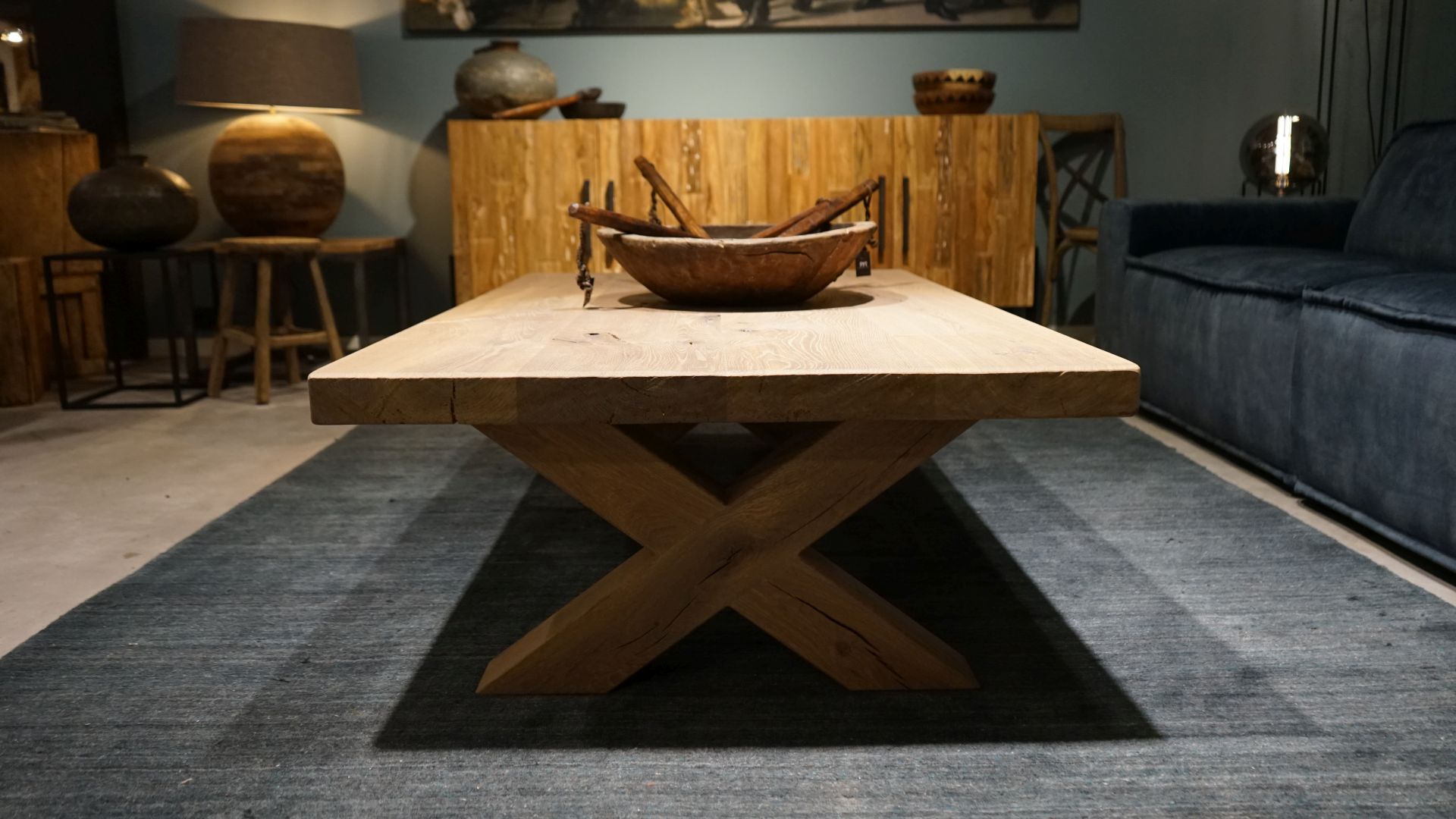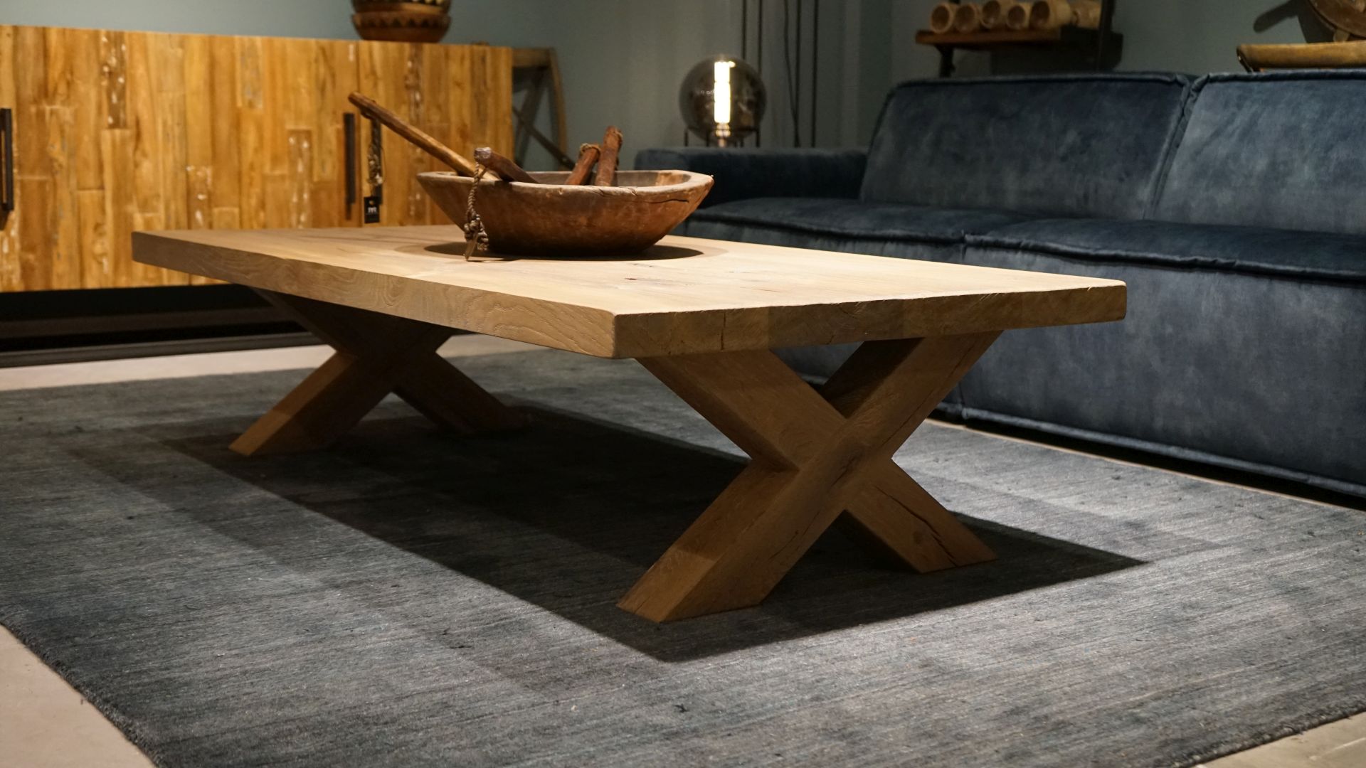 Robuuste eiken salontafel met houten X poot leverbaar in diverse maten. Leverbaar in dezelfde houtsoorten en behandelingen als onze eettafels, met of zonder boomstamrand. Standaard leveren we dit model zonder trekstang in tegenstelling tot de eettafel. Optioneel is deze salontafel wel te bestellen met de trekstang.
