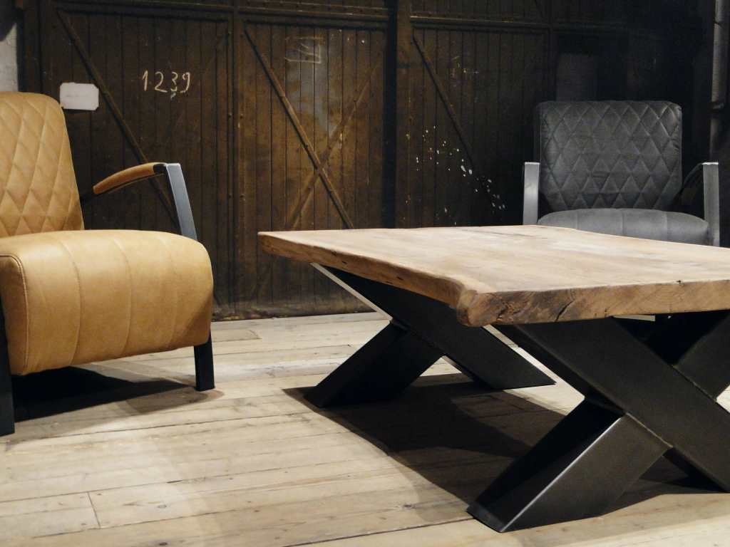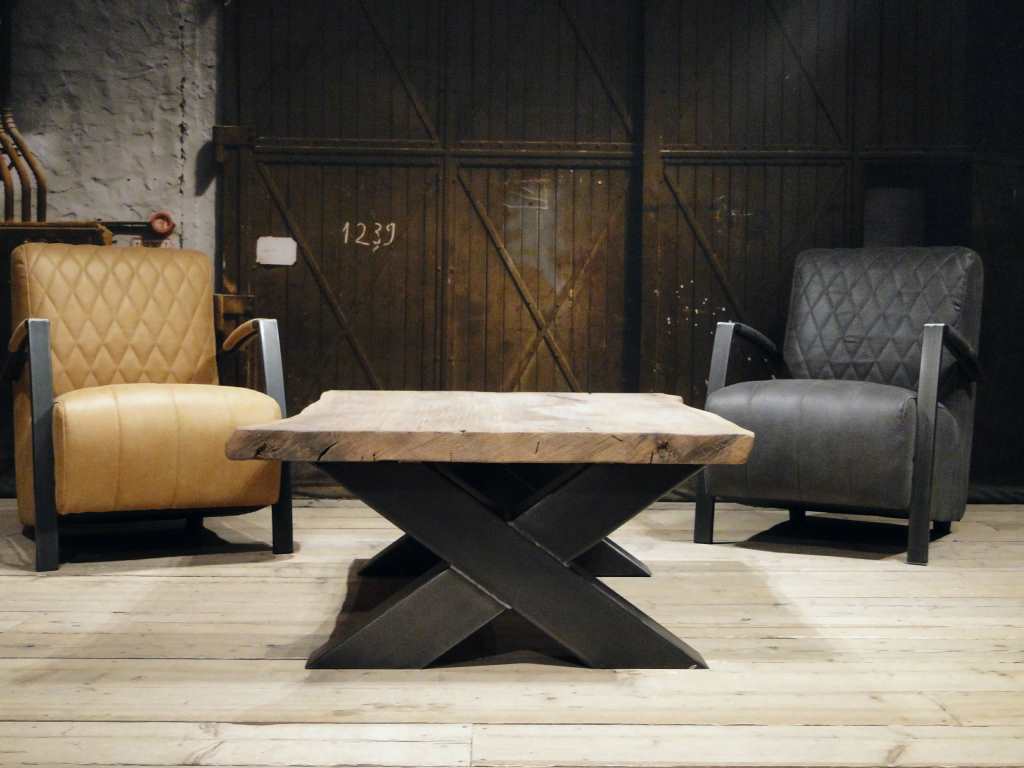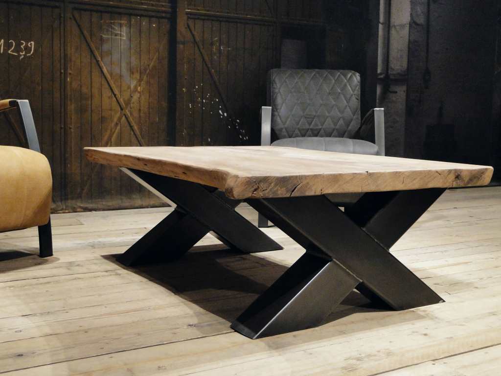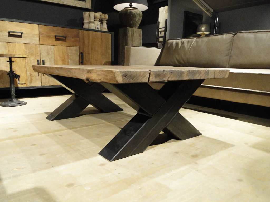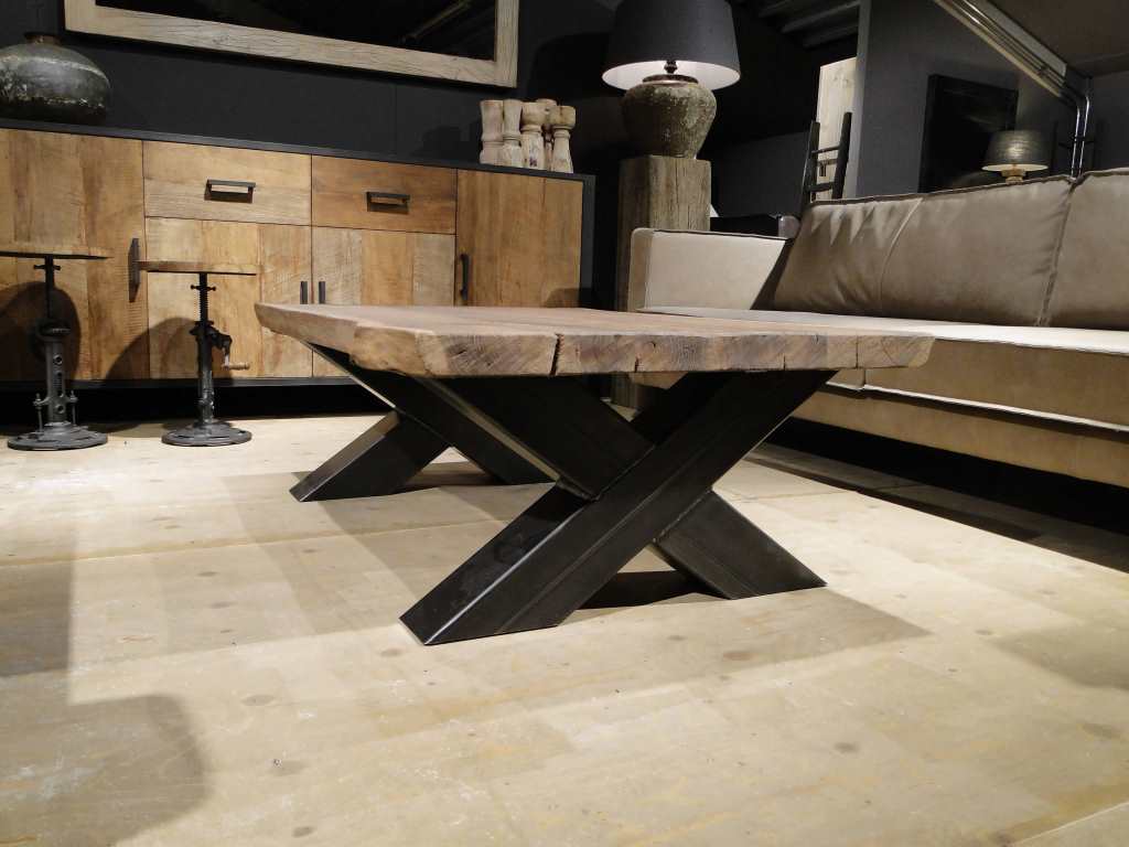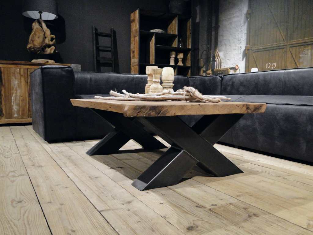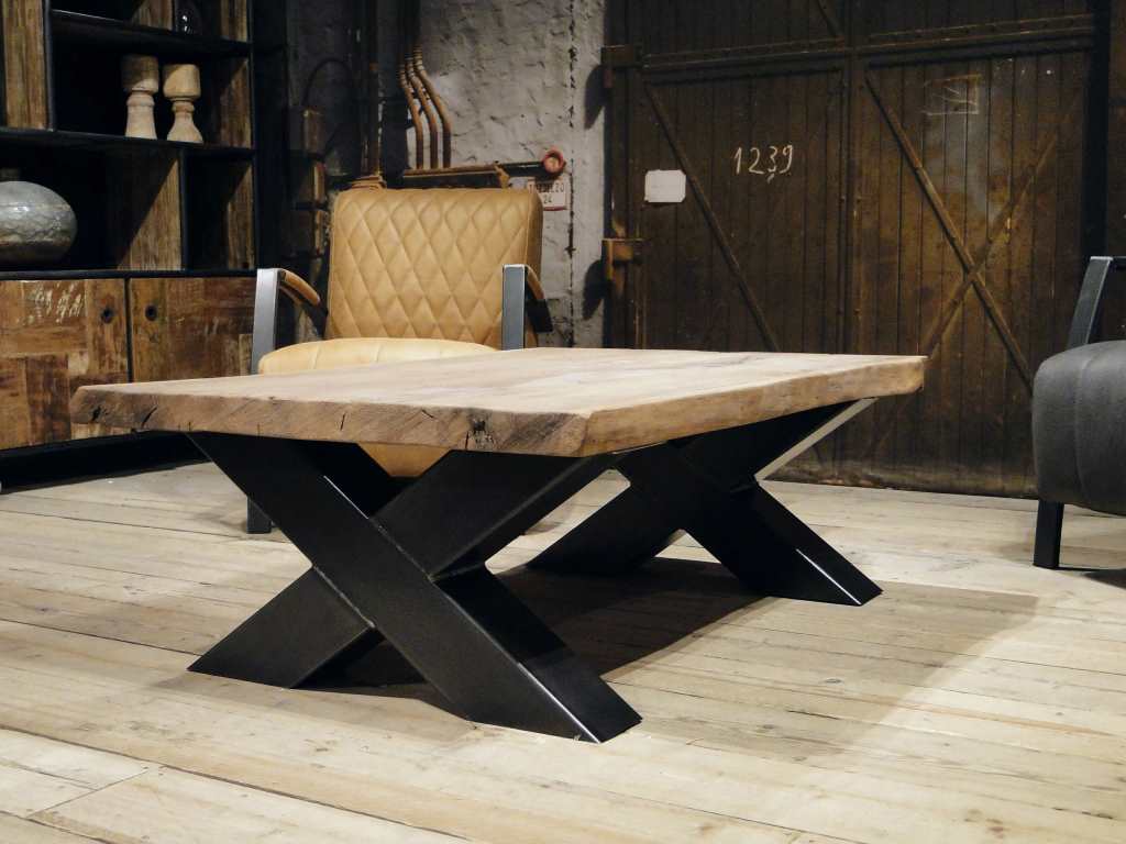 Stoere industriële salontafel met stalen kruispoot onderstel leverbaar in diverse maten. Leverbaar in dezelfde houtsoorten en behandelingen als onze eettafels, met of zonder boomstamrand.
