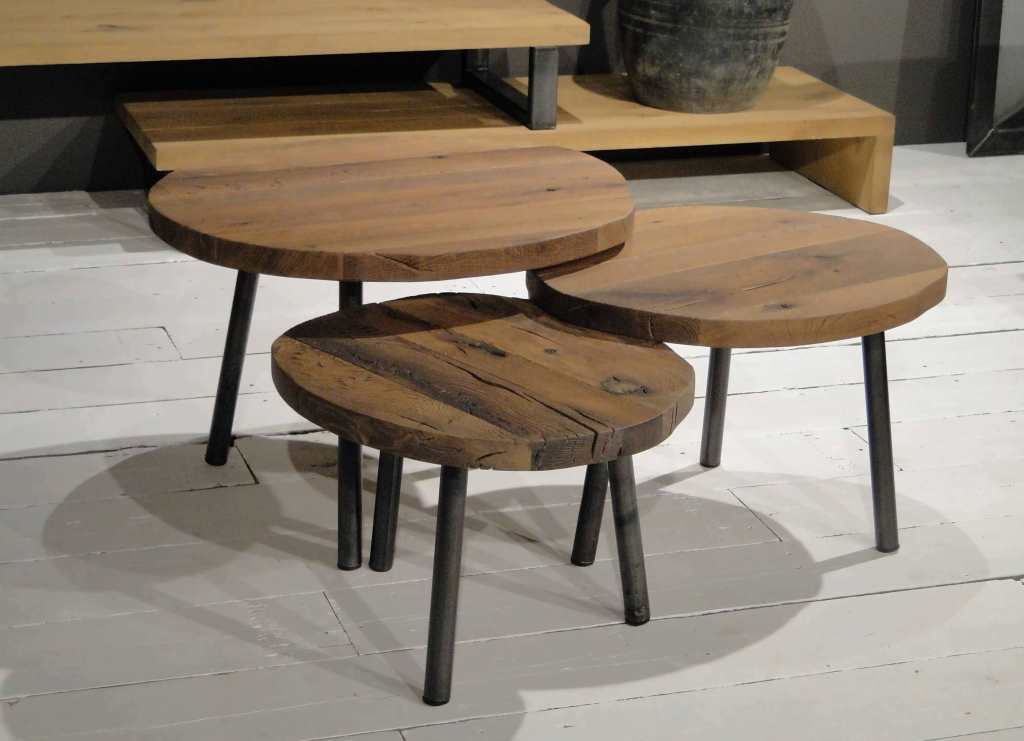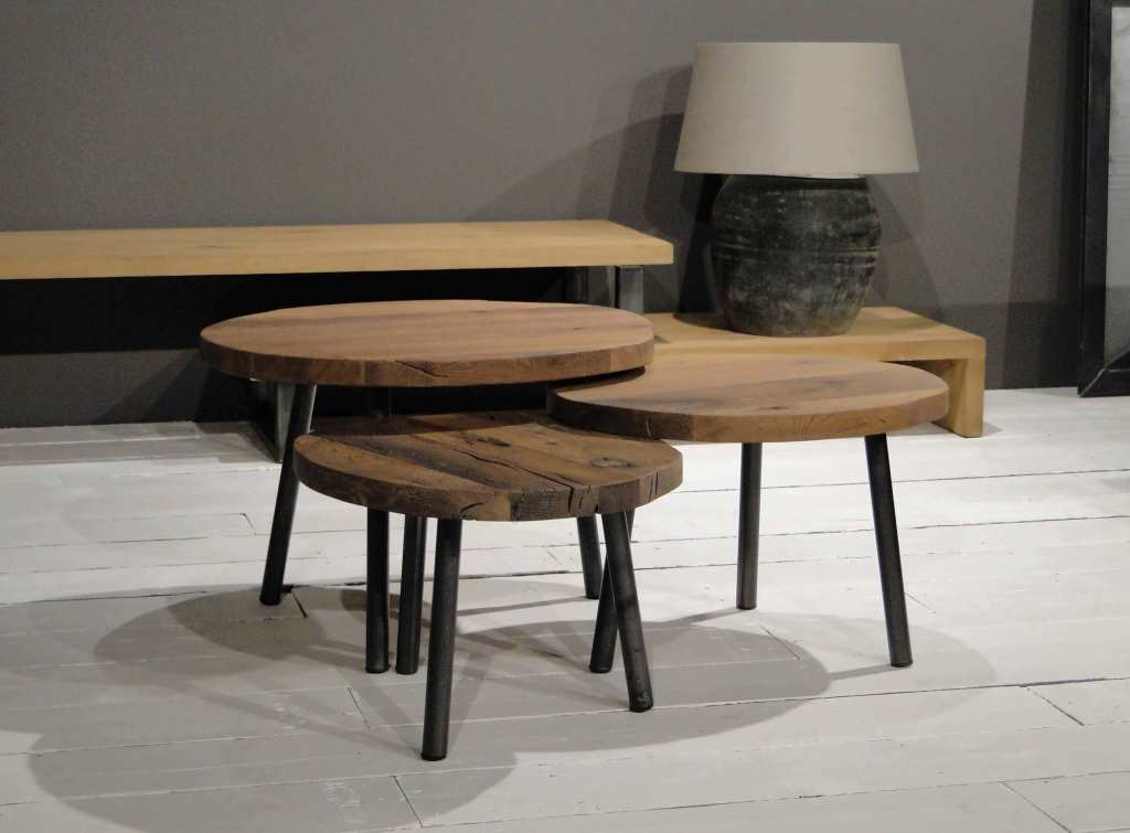 Stoere organisch rond (niet strak rond) gezaagde salontafel met stalen onderstel leverbaar in 3 maten. Dit model leveren we uitsluitend met een balkenblad (verschillende plank breedtes). Hij kan los besteld worden of als set van 3 welke dan deels onder elkaar geschoven kunnen worden.