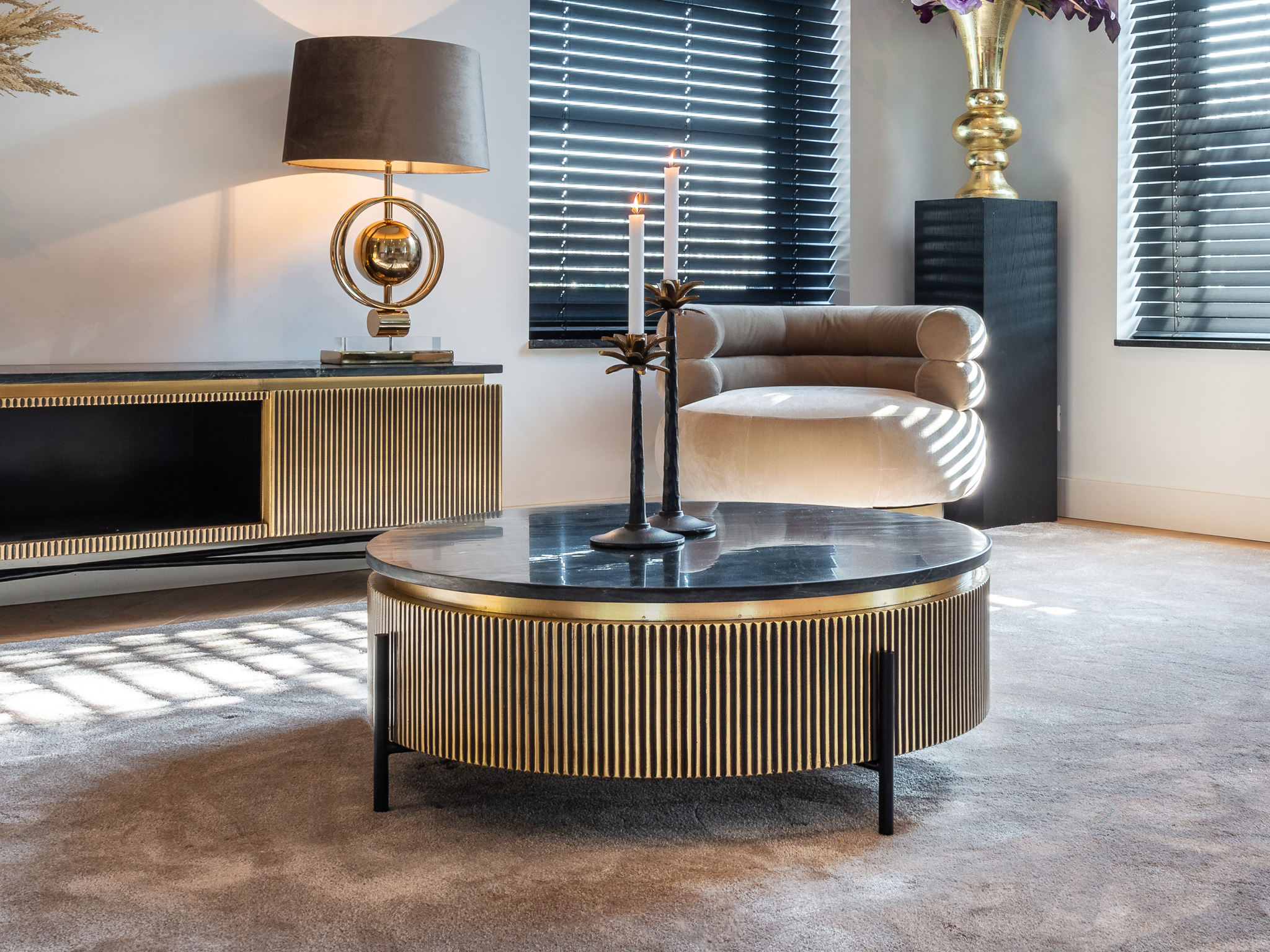 Salontafel Colmar is een uniek dressoir in goud / messing met geribbeld reliëf en zwart marmeren blad. Perfect te combineren met het dressoir, de boekenkast en het tv-meubel uit dezelfde serie. Mid-Century Modern stijl (jaren zestig) in een nieuw jasje!