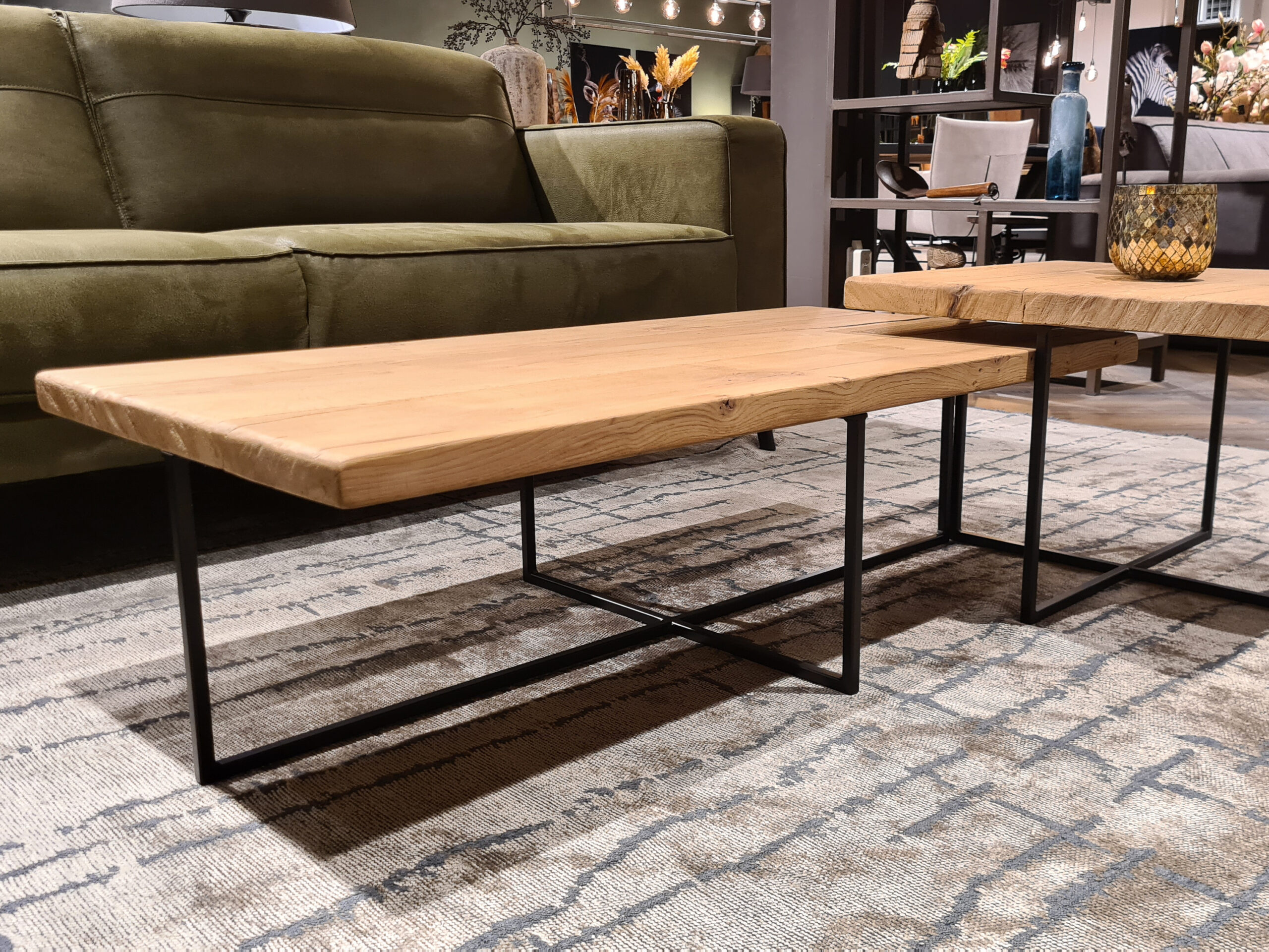 Mooie industriele salontafel met rank stalen onderstel. Indien gewenst is dit model leverbaar met handige bijzettafel in dezelfde afwerking. Naast de verschillende behandelingen welke ook voor onze eiken eetkamertafels mogelijk zijn, is ook de lengte, breedte en hoogte aan te passen. Tevens kunt u kiezen hoe ruig het blad mag worden; matig rustiek met weinig knoesten en scheuren, standaard rustiek met gemiddeld aantal knoesten en scheuren en extra rustiek met lekker veel knoesten en scheuren.